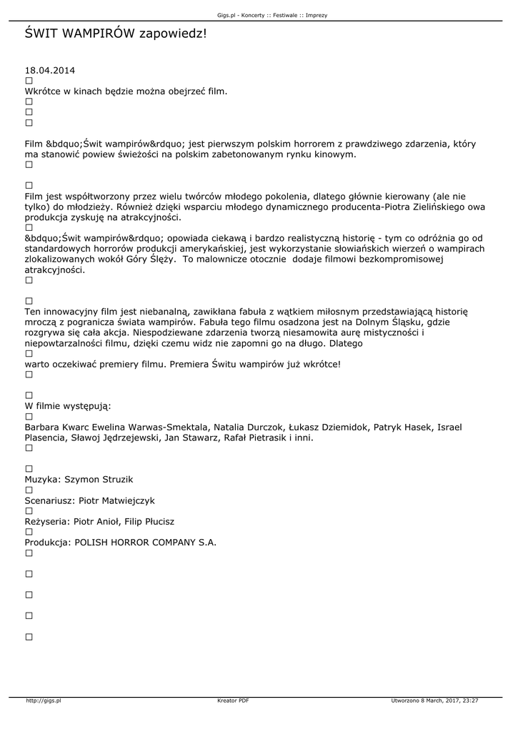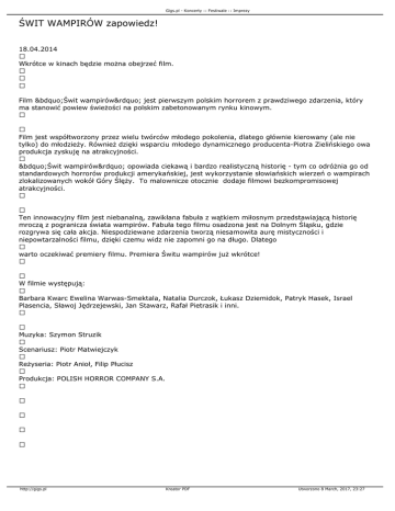 Gigs.pl - Koncerty :: Festiwale :: Imprezy ŚWIT WAMPIRÓW zapowiedz! 18.04.2014 Wkrótce w kinach będzie można obejrzeć film. Film „Świt wampirów” jest pierwszym polskim horrorem z prawdziwego zdarzenia, który ma stanowić powiew świeżości na polskim zabetonowanym rynku kinowym. Film jest współtworzony przez wielu twórców młodego pokolenia, dlatego głównie kierowany (ale nie tylko) do młodzieży. Również dzięki wsparciu młodego dynamicznego producenta-Piotra Zielińskiego owa produkcja zyskuję na atrakcyjności. „Świt wampirów” opowiada ciekawą i bardzo realistyczną historię - tym co odróżnia go od standardowych horrorów produkcji amerykańskiej, jest wykorzystanie słowiańskich wierzeń o wampirach zlokalizowanych wokół Góry Ślęży. To malownicze otocznie dodaje filmowi bezkompromisowej atrakcyjności. Ten innowacyjny film jest niebanalną, zawikłana fabuła z wątkiem miłosnym przedstawiającą historię mroczą z pogranicza świata wampirów. Fabuła tego filmu osadzona jest na Dolnym Śląsku, gdzie rozgrywa się cała akcja. Niespodziewane zdarzenia tworzą niesamowita aurę mistyczności i niepowtarzalności filmu, dzięki czemu widz nie zapomni go na długo. Dlatego warto oczekiwać premiery filmu. Premiera Świtu wampirów już wkrótce! W filmie występują: Barbara Kwarc Ewelina Warwas-Smektala, Natalia Durczok, Łukasz Dziemidok, Patryk Hasek, Israel Plasencia, Sławoj Jędrzejewski, Jan Stawarz, Rafał Pietrasik i inni. Muzyka: Szymon Struzik Scenariusz: Piotr Matwiejczyk Reżyseria: Piotr Anioł, Filip Płucisz Produkcja: POLISH HORROR COMPANY S.A. http://gigs.pl Kreator PDF Utworzono 8 March, 2017, 23:27