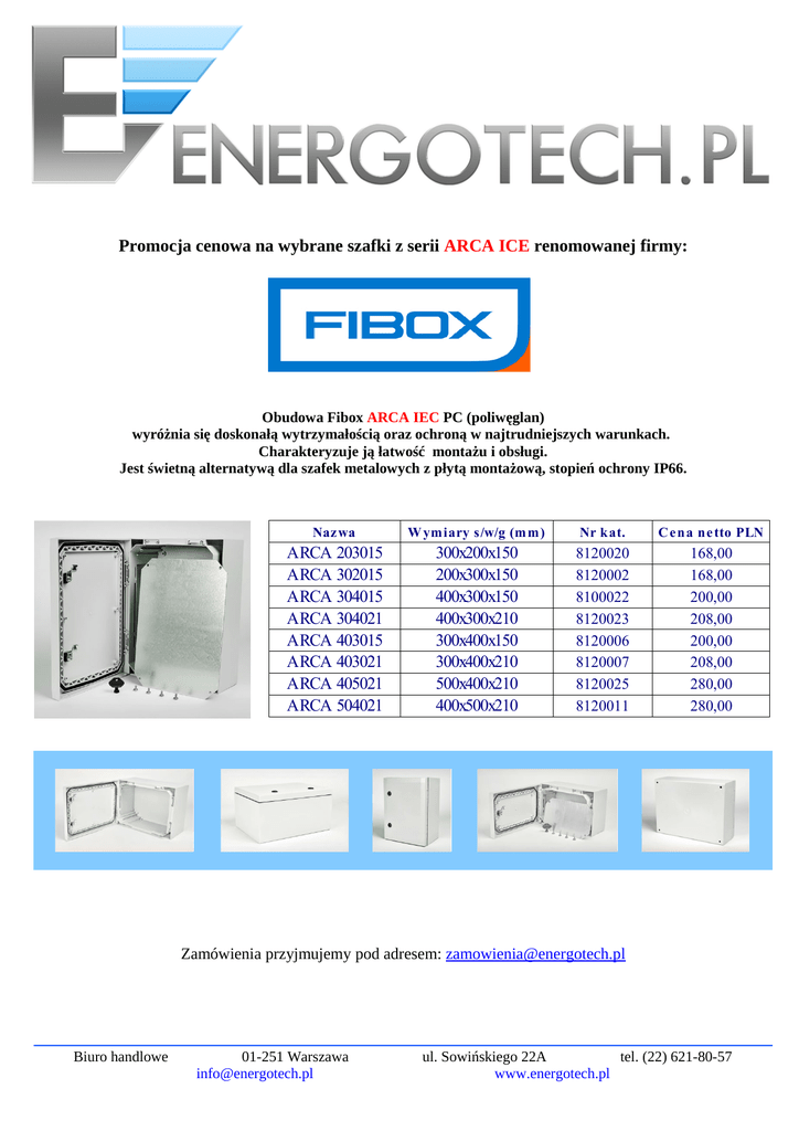 Promocja cenowa na wybrane szafki z serii ARCA ICE renomowanej firmy: Obudowa Fibox ARCA IEC PC (poliwęglan) wyróżnia się doskonałą wytrzymałością oraz ochroną w najtrudniejszych warunkach. Charakteryzuje ją łatwość montażu i obsługi. Jest świetną alternatywą dla szafek metalowych z płytą montażową, stopień ochrony IP66. Naz wa W ymiary s/w/g (m m ) Nr k at. C e na ne tto PLN ARCA 203015 ARCA 302015 ARCA 304015 ARCA 304021 ARCA 403015 ARCA 403021 ARCA 405021 ARCA 504021 300x200x150 200x300x150 400x300x150 400x300x210 300x400x150 300x400x210 500x400x210 400x500x210 8120020 8120002 8100022 8120023 8120006 8120007 8120025 8120011 168,00 168,00 200,00 208,00 200,00 208,00 280,00 280,00 Zamówienia przyjmujemy pod adresem: [email protected] Biuro handlowe 01-251 Warszawa [email protected] ul. Sowińskiego 22A tel. (22) 621-80-57 www.energotech.pl