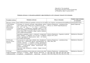 Załącznik nr 5 do zarządzenia Regionalnego Dyrektora Ochrony Środowiska we Wrocławiu z dnia 13 czerwca 2014 r. Działania ochronne ze wskazaniem podmiotów odpowiedzialnych za ich wykonanie i obszarów ich wdrażania. Przedmiot ochrony Działania ochronne Obszar wdrażania Podmiot odpowiedzialny za wykonanie Dotyczące ochrony czynnej siedlisk przyrodniczych, gatunków zwierząt oraz ich siedlisk, oraz związane z utrzymaniem lub modyfikacją metod gospodarowania *7220 Źródliska wapienne ze zbiorowiskami Cratoneurion commutati 9110 Kwaśne buczyny (Luzulo Fagetum). Utrzymanie na obecnym poziomie maksymalnego poboru leśnictwo Muszkowice - wydzielenia leśne: wód ze studni ujęcia wodnego dla wsi Muszkowice (Qśr d = 297h, dz. ew. 348/297 obręb Muszkowice 55,2 m3/d oraz Qmax h = 2,3 m3/h.), z możliwością zwiększenia, w uzasadnionym przypadku jedynie na cele bytowe mieszkańców po przeprowadzeniu oceny wpływu na obszar Natura 2000. Utrzymanie stałego wypływu nadmiaru wód ze studni na powierzchnię. Gmina Ciepłowody Zaniechanie gospodarki leśnej w miejscach występowania leśnictwo Muszkowice - fragmenty wydzieleń płatów siedliska i w odległości 10 m od nich, z wyjątkiem leśnych: 297 h, 292 h sytuacji zagrażających bezpieczeństwu ludzi i ich mienia oraz trwałości drzewostanu. Nadleśnictwo Henryków Pozostawienie do całkowitego rozkładu drzew dziuplastych, leśnictwo Muszkowice - wydzielenia leśne: leżących oraz z widocznymi dużymi wypróchnieniami, nie 296m, 296n, 296r usuwanie wykrotów - z wyjątkiem sytuacji zagrażających bezpieczeństwu ludzi i ich mienia (w tym zablokowania dróg leśnych i wyznaczonych szlaków turystycznych) oraz trwałości drzewostanu. Stosowanie rębni złożonych ze średnim i długim okresem odnowienia. Nadleśnictwo Henryków 9170 Grąd Stopniowa przebudowa drzewostanu przy zastosowaniu rębni leśnictwo Muszkowice - wydzielenia leśne: środkowoeuropejski złożonych ze średnim i długim okresem odnowienia, ze 296f, 296p, 296s, 288b, 289i, 289j, 289f, 290g, i subkontynentalny szczególnym uwzględnieniem stopniowego usuwania 290f, 299d, 299g, 299f, 296t, 296r, 291f, 292j, Nadleśnictwo Henryków (Galio-Carpinetum, Tilio-Carpinetum) gatunków obcych geograficznie oraz ograniczaniem udziału 292k, 292g, 292d, 281g, 281d, 282d, 282c, gatunków obcych dla siedliska (głównie świerk Picea abies , 282b, 298d, 282g, 282f, 282h, 298g, 298a, 298b miejscowo modrzew Larix sp. oraz dąb czerwony Quercus rubra), tak aby docelowo udział tych gatunków łącznie nie przekraczał 20% całego drzewostanu (ze względu na złożoność procesu, stan ten nie jest możliwy do osiągnięcia w trakcie obowiązywania planu). Pozostawienie do całkowitego rozkładu drzew dziuplastych leśnictwo Muszkowice - wydzielenia leśne: oraz z widocznymi wypróchnieniami, nie usuwanie 296f, 296p, 296s, 288b, 289i, 289j, 289f, 290g, wykrotów - z wyjątkiem sytuacji zagrażających 290f, 299d, 299g,299f bezpieczeństwu ludzi i ich mienia (w tym zablokowania dróg leśnych i wyznaczonych szlaków turystycznych) oraz trwałości drzewostanu. Nadleśnictwo Henryków Dokonanie miejscowych napraw stanu nawierzchni ścieżki leśnictwo Muszkowice - oddziały leśne: 280, lub wykonanie dodatkowych zabezpieczeń na przebiegu 281, 289, 290, 291, 292, 296, 297, szklaku turystycznego w miejscu występowania terenów podmokłych i zabagnionych. Nadleśnictwo Henryków, organ sprawujący nadzór nad obszarem Natura 2000 Zamontowanie szlabanu na drodze leśnej prowadzącej do leśnictwo Muszkowice - wydzielenie leśne: 296t Nadleśnictwo Henryków, rezerwatu „Muszkowicki Las Bukowy” od strony organ sprawujący nadzór Muszkowic. nad obszarem Natura 2000 *91E0 Łęgi wierzbowe, topolowe, olszowe i jesionowe (Salicetum albofragilis, Populetum albae, Alnenion glutinoso-incanae) i olsy źródliskowe Ograniczenie wykonywania działań gospodarczych w obrębie płatów siedliska do koniecznych zabiegów sanitarnych (np. usuwania chorych jesionów), stopniowej przebudowy drzewostanów w miejscach gdzie występują obce ekologicznie i geograficznie gatunki drzew lub konieczności usuwania drzew zagrażających bezpieczeństwu ludzi i ich mienia. leśnictwo Muszkowice - wydzielenia leśne: Nadleśnictwo Henryków Całe: 296c, 296f, 280g, 281b Fragmenty oddziałów 297a, 297b, 297c, 297d, 297g, 297h, 297i, 289j, 289h, 289i, 289j, 290f, 290g, 292c, 292h, 292d, 292f, 292g, 280h, 281d, 281c, 282b, 282c, 282d 1308 Mopek Barbastella barbastellus Umieszczenie przy miejscu postojowym tablicy informującej o przedmiotach ochrony obszaru Natura 2000. Miejsce postojowe - leśnictwo Muszkowice oddz. 289 Organ sprawujący nadzór nad obszarem Natura 2000, Nadleśnictwo Henryków 1323 Nocek Bechsteina Myotis bechsteinii Wstrzymanie w okresie rozrodu (czerwiec i lipiec) wycinki Drzewostan liściasty w obrębie całego Obszaru drzew liściastych z dziuplami i z odstającą korą, Natura 2000 preferowanych przez nietoperze na kryjówki letnie. Wycinanie tylko tych egzemplarzy, co do których jest pewność, że nie są zasiedlone przez nietoperze Nadleśnictwo Henryków Prowadzenie gospodarki leśnej zapewniającej utrzymanie Cały Obszar Natura 2000 możliwie dużej reprezentacji starodrzewu, a przy wykonywaniu rębni złożonych zachowanie przestojów i biogrup starodrzewu oraz dziuplastych i zamierających drzew - z wyjątkiem sytuacji zagrażających bezpieczeństwu ludzi i ich mienia (w tym zablokowania dróg leśnych i wyznaczonych szlaków turystycznych) oraz trwałości drzewostanu. Nadleśnictwo Henryków Zachowanie korytarzy ekologicznych wokół Obszaru, Teren gmin Ząbkowice Śląskie, Ziębice i poprzez ochronę zadrzewień porastających cieki wodne, Ciepłowody zachowanie struktur liniowych w postaci szpalerów drzew, ciągów zadrzewień i fragmentów lasu tworzących ciągłe korytarze. Gminy: Ząbkowice Śląskie, Ziębice i Ciepłowody Umieszczenie przy miejscu postoj