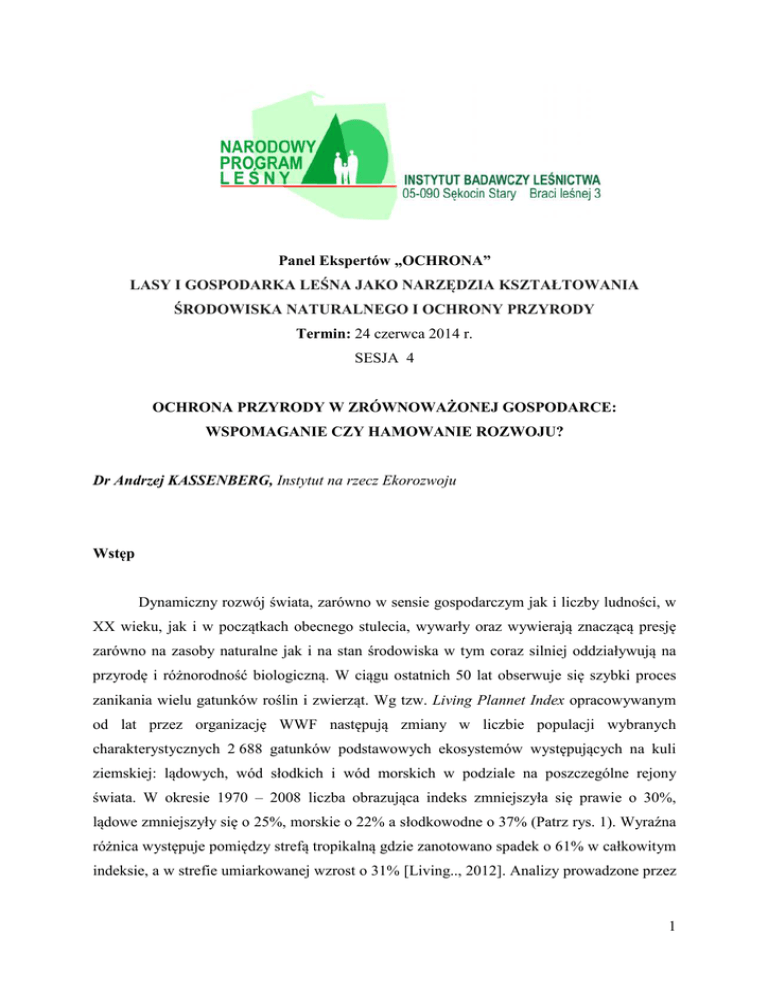 Panel Ekspertów „OCHRONA” LASY I GOSPODARKA LEŚNA JAKO NARZĘDZIA KSZTAŁTOWANIA ŚRODOWISKA NATURALNEGO I OCHRONY PRZYRODY Termin: 24 czerwca 2014 r. SESJA 4 OCHRONA PRZYRODY W ZRÓWNOWAŻONEJ GOSPODARCE: WSPOMAGANIE CZY HAMOWANIE ROZWOJU? Dr Andrzej KASSENBERG, Instytut na rzecz Ekorozwoju Wstęp Dynamiczny rozwój świata, zarówno w sensie gospodarczym jak i liczby ludności, w XX wieku, jak i w początkach obecnego stulecia, wywarły oraz wywierają znaczącą presję zarówno na zasoby naturalne jak i na stan środowiska w tym coraz silniej oddziaływują na przyrodę i różnorodność biologiczną. W ciągu ostatnich 50 lat obserwuje się szybki proces zanikania wielu gatunków roślin i zwierząt. Wg tzw. Living Plannet Index opracowywanym od lat przez organizację WWF następują zmiany w liczbie populacji wybranych charakterystycznych 2 688 gatunków podstawowych ekosystemów występujących na kuli ziemskiej: lądowych, wód słodkich i wód morskich w podziale na poszczególne rejony świata. W okresie 1970 – 2008 liczba obrazująca indeks zmniejszyła się prawie o 30%, lądowe zmniejszyły się o 25%, morskie o 22% a słodkowodne o 37% (Patrz rys. 1). Wyraźna różnica występuje pomiędzy strefą tropikalną gdzie zanotowano spadek o 61% w całkowitym indeksie, a w strefie umiarkowanej wzrost o 31% [Living.., 2012]. Analizy prowadzone przez 1 FAO także pokazują duże zagrożenie gdyż co roku ubywa 13 mln ha lasów (w trzy lata obszar Polski) głównie w strefie tropikalnej [Global.., 2010]. Źródło: Living Planet Index 2012. WWF Rys. 1. Zmiany w Living Planet Index w latach 1970 – 2008 (rok 1970 = 1) Wobec tej sytuacji niezbędne staje się radykalne zwiększenie ochrony przyrody jeżeli nie ma dojść do zasadniczego zubożenia bogactw przyrody ożywionej. W roku 2009 lądowe i morskie obszary przyrody chronionej obejmowały 19 mln km2, co stanowiło 12,9% terenów lądowych i 6,3% mórz wewnętrznych, a tylko 0,5% mórz poza wewnętrznymi było objęte ochroną. Aby uzyskać poprawę w ochronie różnorodności biologicznej niezbędne jest objęcie w roku 2015 ochroną 12% pastwisk i łąk oraz 12% terenów leśnych, a także uzyskać wzrost ochrony bioróżnorodności każdego z typów terenów obejmowanych w roku 2030 i 2050 [Living.., 2010]. 1. Wykładnia trwałej i zrównoważonej gospodarki: teoria i praktyka Od blisko 30 lat rozwija się teoria oraz praktyka trwałego i zrównoważonego podejścia do rozwoju czy do gospodarki. Człowiek i jego gospodarka funkcjonują w systemie społecznym, który jest nierozerwalnie połączony ze środowiskiem przyrodniczym czyli układem ekologicznym. Oznacza to, że zmiany w jednym czy w drugim są ze sobą nierozerwalnie połączone. Nie jest możliwe w sposób sensowny zrozumieć jak dynamicznie funkcjonuje jeden system jeżeli go analizujemy w oderwaniu od drugiego. Niestety żyjąc w tych połączonych systemach społecznym i ekologicznym nie znajduje to swojego odzwierciadlenia w jaki sposób analizujemy w praktyce czy zarządzamy przyrodą i jej 2 zasobami. Ekonomiści posługują się modelem gospodarczym, socjologowie analizują zachowania społeczeństw, a naukowcy, przyrodnicy podejmują próby zrozumienia jak funkcjonuje przyroda, poszczególne ekosystemy. Wszyscy oni mają wkład w zrozumienie jak funkcjonuje świat ale tylko w sposób częściowy. Operują oni poszczególnymi komponentami a nie systemem jako całością. Dlatego tak ważnym jest podejście interdyscyplinarne w badaniach, polityce z wykorzystaniem myślenia systemowego. Społeczno-ekologiczne systemy są złożone i adaptacyjne oraz nie następują w nich zmiany łatwe do przewidzenia, zachodzące liniowo czy też w sposób przyrastający. Mogą funkcjonować w różnych typach reżimów gdzie ich funkcje, struktura i reakcje są zróżnicowane. Mamy doczynienia ze zmiennym, stabilnym światem. Stany krytyczne i zaburzenia w tych systemach mogą powodować przekroczenia progów tolerancji prowadząc do innych stanów bardzo często obawiających się niekorzystnymi zmianami. Otwarte, elastyczne myślenie prowadzi do dostrzegania układów społeczno-ekologicznych jako systemu operującego w powiązaniu w różnych skalach czasu i przestrzeni. Koncentruje się to na tym jak system się zmienia i jak sobie radzi z zaburzeniami. Odporność wyznacza zdolność systemu do przeciwdziałania zaburzeniom. Innym słowy pozwala to na pewne zmiany bez przekraczania granic prowadzących do innego stanu tych systemów [Pisano, 2012]. Kluczowym zagadnieniem, które należy rozpatrywać w perspektywie najbliższych 50 lat jest zapewnienie funkcjonowania systemów ziemskich podtrzymujących życie. One, bowiem będą decydować o zapewnieniu warunków przyrodniczych do funkcjonowania cywilizacji ludzkiej oraz działającej w ramach niej gospodarki. Obrazuje to poniższy schemat przedstawiający zrównoważony rozwój nie jako osiąganie kompromisu pomiędzy trzema jego składowymi społeczeństwem, gospodarką i przyrodą, ale jako płaszczyznę, na której zachodzi integracja i równoprawne traktowanie tych trzech składowych przy założeniu, że granice tej płaszczyzny wyznaczają systemy podtrzymujące życie na Ziemi, którym zapewnienie funkcjonowania jest warunkiem przetrwania gatunku ludzkiego i dlatego nie może to podlegać kompromisowi (Patrz rys. 2). 3 Rys. 2. Zrównoważony rozwój Wytwarzanie dóbr konsumpcyjnych zwłaszcza materialnych prowadzi do coraz większego zaangażowania zasobów przyrodniczych mimo poprawy efektywności ich wykorzystania. Związane to jest zarówno z rosnąca liczbą ludności jak i także z rozprzestrzenianiem się nadkonsumpcyjnego modelu życia na coraz to nowe obszary. Jednocześnie wytwarzanie to jest obarczone degradacją środowiska i odprowadzaniem do niego zanieczyszczeń w różnych formach określane mianem balastu ekologicznego (Patrz rys. 3). 4 Pozyskanie materiałów Krajowe wydobycie: - pali