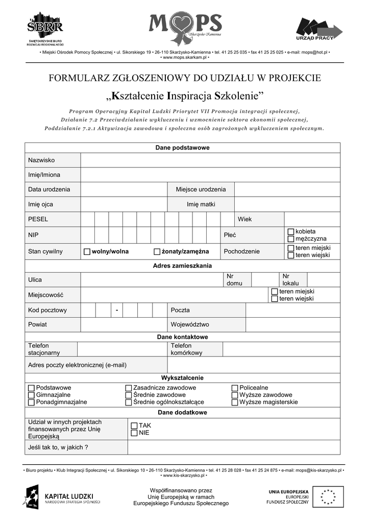 • Miejski Ośrodek Pomocy Społecznej • ul. Sikorskiego 19 • 26-110 Skarżysko-Kamienna • tel. 41 25 25 035 • fax 41 25 25 025 • e-mail: [email protected] • • www.mops.skarkam.pl • FORMULARZ ZGŁOSZENIOWY DO UDZIAŁU W PROJEKCIE „Kształcenie Inspiracja Szkolenie” Program Operacyjny Kapitał Ludzki Priorytet VII Promocja integracji społecznej, Działanie 7.2 Przeciwdziałanie wykluczeniu i wzmocnienie sektora ekonomii społecznej, Poddziałanie 7.2.1 Aktywizacja zawodowa i społeczna osób zagrożonych wykluczeniem społecznym. Dane podstawowe Nazwisko Imię/Imiona Data urodzenia Miejsce urodzenia Imię ojca Imię matki PESEL Wiek NIP Stan cywilny żonaty/zamężna wolny/wolna Płeć kobieta mężczyzna Pochodzenie teren miejski teren wiejski Adres zamieszkania Nr domu Ulica Miejscowość Kod pocztowy - Nr lokalu teren miejski teren wiejski Poczta Województwo Powiat Dane kontaktowe Telefon komórkowy Telefon stacjonarny Adres poczty elektronicznej (e-mail) Wykształcenie Podstawowe Gimnazjalne Ponadgimnazjalne Zasadnicze zawodowe Średnie zawodowe Średnie ogólnokształcące Policealne Wyższe zawodowe Wyższe magisterskie Dane dodatkowe Udział w innych projektach finansowanych przez Unię Europejską TAK NIE Jeśli tak to, w jakich ? • Biuro projektu • Klub Integracji Społecznej • ul. Sikorskiego 10 • 26-110 Skarżysko-Kamienna • tel. 41 25 28 028 • fax 41 25 24 875 • e-mail: [email protected] • • www.kis-skarzysko.pl • Współfinansowano przez Unię Europejską w ramach Europejskiego Funduszu Społecznego • Miejski Ośrodek Pomocy Społecznej • ul. Sikorskiego 19 • 26-110 Skarżysko-Kamienna • tel. 41 25 25 035 • fax 41 25 25 025 • e-mail: [email protected] • • www.mops.skarkam.pl • Jaki rodzaj wsparcia otrzymał/a Pan/Pani w innych projektach? Opieka nad dziećmi do lat 7 lub opieka nad osobą zależną TAK NIE Posiadane kwalifikacje zawodowe (w tym kursy i szkolenia) TAK NIE Jeśli tak, to jakie ? Stopień znajomości obsługi komputera (proszę określić): Preferowany rodzaj szkolenia/kursu (proszę określić): ) Proszę ocenić w skali od 1 do 5 (gdzie 1 jest najniższą oceną a 5 najwyższą): Samoocena i wiara we własne siły Poziom motywacji do samodzielnego działania Pewność siebie w kontaktach z otoczeniem Poczucie własnej wartości Skąd dowiedział/a się Pan/Pani o projekcie „ Kształcenie Inspiracja Szkolenie” współfinansowanym ze środków Unii Europejskiej w ramach Europejskiego Funduszu Społecznego: innym projekcie ………………………………………………. Oświadczam, że: jestem osobą do 24 roku życia, jestem osobą bezrobotną, posiadam wykształcenie nie wyższe niż średnie, zamieszkuję na terenie województwa świętokrzyskiego, Odnośnie gromadzenia i przetwarzania danych osobowych: a) Zgodnie z ustawą o ochronie danych osobowych (Dz. U. z 2002 r. Nr 101, poz. 926 z późn. zm.) wyrażam zgodę na zbieranie i przetwarzanie danych osobowych, w tym danych wrażliwych, na potrzeby rekrutacji, realizacji, monitorowania i ewaluacji Projektu; b) Zostałem/zostałam poinformowany/poinformowana, że administratorem danych jest Instytucja Zarządzająca Programem Operacyjnym Kapitał Ludzki – Ministerstwo Rozwoju Regionalnego (ul. Wspólna 2/4, 00-926 Warszawa). Dane przetwarzane będą przez Miejski Ośrodek Pomocy Społecznej w Skarżysku-Kamiennej (ul. Sikorskiego 19, 26-110 Skarżysko-Kamienna) na zasadzie dalszego powierzania; c) Przekazanie danych jest dobrowolne z zastrzeżeniem, że niepodanie danych uniemożliwi realizację celów, w jakich dane są zbierane; • Biuro projektu • Klub Integracji Społecznej • ul. Sikorskiego 10 • 26-110 Skarżysko-Kamienna • tel. 41 25 28 028 • fax 41 25 24 875 • e-mail: [email protected] • • www.kis-skarzysko.pl • Współfinansowano przez Unię Europejską w ramach Europejskiego Funduszu Społecznego • Miejski Ośrodek Pomocy Społecznej • ul. Sikorskiego 19 • 26-110 Skarżysko-Kamienna • tel. 41 25 25 035 • fax 41 25 25 025 • e-mail: [email protected] • • www.mops.skarkam.pl • d) Zostałem/zostałam poinformowany/poinformowana o prawie dostępu do moich danych oraz ich poprawiania zgodnie z przepisami ustawy z dnia 29 sierpnia 1997 r. o ochronie danych osobowych (tj. Dz. U. z 2002 r. Nr 101, poz. 926 z późn. zm.); e) Oświadczam, że zostałem/łam poinformowany/a, że dane zawarte w formularzu rekrutacyjnym wprowadzane są do systemu PEFS, którego celem jest gromadzenie informacji na temat osób i instytucji korzystających ze wsparcia w ramach EFS, oraz określenie efektywności realizowanych zadań w procesie badań ewaluacyjnych. Oświadczam, że: Zapoznałem/łam się z zasadami udziału oraz regulaminem projektu i wyrażam zgodę na uczestnictwo w nim; Zgodnie z wymogami jestem uprawniony do uczestnictwa w projekcie; Zostałem/łam poinformowany/na, że projekt jest finansowany ze środków Unii Europejskiej w ramach Europejskiego Funduszu Społecznego oraz w ramach współfinansowania krajowego z budżetu państwa; Wyrażam zgodę na udział w postępowaniu rekrutacyjnym; Mam świadomość, że szkolenie może odbywać się w miejscowości innej od mojego miejsca zamieszkania; Wyrażam zgodę na udział w badaniu ankietowym, które odbędzie się 6 m-cy po zakończeniu udziału w projekcie; W przypadku podjęcia zatrudnienia zobowiązuje się niezwłocznie poinformować o tym fakcie biuro projektu oraz dostarczyć kopię dokumentu potwierdzającego podjęcie zatrudnienia (np. umowa o pracę, umowa zlecenie itp.); Wyrażam wolę uczestnictwa w projekcie pn. „Kształcenie Inspiracja Szkolenie” - realizowanym przez Miejski Ośrodek Pomocy Społecznej w Skarżysku-Kamiennej w ramach Priorytetu VII, Działanie 7.2, Poddziałanie 7.2.1 Programu Operacyjnego Kapitał Ludzki; Mam świadomość, iż złożenie niniejszego Formularza jest jednoznaczne z wyrażeniem zgody na przeprowadzenie