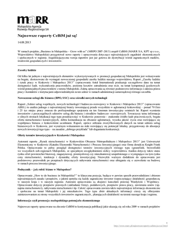 Najnowsze raporty CeBiM już są! 14.08.2013 W ramach projektu „Busienss in Malopolska – Grow with us” (MRPO 2007-2013) zespół CeBiM (MARR SA, KPT sp z o.o., Województwo Małopolskie) przygotował nowe raporty i opracowania dotyczące najważniejszych zagadnień ekonomicznych i społecznych w regionie. Angielskojęzyczna wersja raportów jest już gotowa do dystrybucji wśród zagranicznych mediów, środowisk gospodarczych i inwestorów. Zasoby ludzkie Od kilku lat jednym z najważniejszych elementów wykorzystywanych w promocji gospodarczej Małopolskie jest wskazywanie na bogate, dostosowane do wymagań nowoczesnej gospodarki zasoby ludzkie naszego województwa. Raport „Zasoby ludzkie i rynek pracy w Krakowie i Małopolsce 2013” (opracowanie Antal International) przekazuje szczegółowe dane na temat dostępności kadr, wykształcenia pracowników, poziomu kosztów zatrudnienia oraz m.in. na temat kompetencji językowych wśród potencjalnych pracowników z terenu Małopolski. Zaletą opracowania są również podstawowe informacje z zakresu prawa pracy i kontaktów z instytucjami odpowiedzialnymi za ten sektor w ramach administracji samorządowej różnego szczebla. Nowoczesne usługi dla biznesu (BPO, SSC) oraz ośrodki nowych technologii Raport „Sektor usług wspólnych, nowych technologii I badawczo-rozwojowy w Krakowie i Małopolsce 2013” (opracowanie ABSL) to analiza jednego z najważniejszej branży inwestującej przede wszystkim w aglomeracji krakowskiej – ponad 70 firm i 25 tys miejsc pracy zmusza do profesjonalnego spojrzenia na ten fenomen inwestycyjny ostatnich lat. Raport wymienia inwestorów z poszczególnych sektorów usług dla biznesu i ośrodków badawczo- rozwojowych. Towarzyszy temu informacja o silnych stronach lokalizacji tego typu przedsięwzięć w Krakowie: ponownie - znakomite źródło kadr pracowniczych, bogata oferta nieruchomości komercyjnych, dobra komunikacja na obszarze aglomeracji, wysoka jakość życia oraz rozwijająca się współpraca biznesu z krakowskimi uczelniami. Raport, oprócz zebrania zweryfikowanych danych na temat sektora usług biznesowych w Krakowie, jest wyraźnym wskazaniem na stale rozwijający się potencjał lokalny, przygotowany do absorpcji nowych inwestycji tego typu – na zasadzie „dobrego przykładu” lub doganiania konkurencji. Oferty terenów inwestycyjnych w Krakowie i Małopolsce Autorami raportu „Rynek nieruchomości w Krakowskim Obszarze Metropolitalnym i Małopolsce 2013” jest Uniwersytet Ekonomiczny w Krakowie (Katedra Ekonomiki Nieruchomości i Procesu Inwestycyjnego) oraz firma doradcza Knight Frank Polska. Opracowanie to pełny przegląd dostępności terenów inwestycyjnych różnego typu (greenfield, brownfield) we wszystkich sub-regionach Małopolski, ze specjalnym uwzględnieniem stolicy województwa. Analiza dotyczy także stanu rynku ofert powierzchni biurowej, magazynowej, przemysłowej czy mieszkaniowej uzupełnionego o występujące na tym rynku ceny nieruchomości, tendencje i dynamikę oferty inwestycyjnej. Niezwykle ważnym dodatkiem do opracowania jest podstawowy przewodnik po przepisach dotyczących nabywania nieruchomości oraz ubiegania się o zezwolenie na budowę w ramach procesu inwestycyjnego. Podręcznik – jak robić biznes w Małopolsce? Opracowanie „How to do business in Małopolska?” to klasyczna pozycja, będąca w pewien sposób przewodnikiem i zbiorem najważniejszych zasada i przepisów, z jakimi spotyka się każdy zagraniczny inwestor rozpoczynający działalność gospodarczą w naszym kraju i w naszym regionie. Autorami opracowania są eksperci kancelarii prawnej Wardyński i Wspólnicy. Opracowanie dotyczy przepisów prawnych (zakładanie firmy), podatkowych, przepisów prawa pracy, zawierania umów (np. najmu nieruchomości), nabywania nieruchomości itp. Całość opracowania zawiera także najważniejsze informacje ekonomiczne i społeczne na temat Małopolski i jej mieszkańców. Tego typu zbiór aktualnych informacji cieszy się olbrzymim zainteresowaniem ze strony wszystkich inwestorów zagranicznych , planujących działalność na terenie naszego kraju i regionu. Informacja czyli promocja małopolskiego potencjału ekonomicznego Najnowsze raporty opracowane na zlecenie CeBIM to kontynuacja publikacji jakie ukazują się od roku 2009 w ramach projektów 1 http://www.marr.pl/najnowsze-raporty-cebim-juz-sa!.html realizowanych przez instytucje tworzące Centrum. Są one wynikiem zarówno analizy zapotrzebowania na informacje ze strony inwestorów, jak i wynikiem refleksji nad kierunkami rozwoju ekonomicznego i społecznego Małopolski – tworzenia wartościowych i trwałych inicjatyw gospodarczych, wykorzystania możliwości jakie daje dobrze przygotowany rynek pracy oraz kreowania globalnej marki ekonomicznej Małopolski i Krakowa. zobacz najnowsze raporty: więcej Tekst pochodzi ze strony internetowej Małopolskiej Agencji Rozwoju Regionalnego: www.marr.pl Wykorzystanie m ateriałów zam ieszczonych na stronie www.m arr.pl jest dopuszczalne wyłącznie na zasadach określonych w Ustawie o prawie autorskim i prawach pokrewnych, w zakresie odpowiadającym własnem u użytkowi osobistem u oraz dozwolonem u użytkowi publicznem u. W celu uzyskania zgody na korzystanie z m ateriałów udostępnionych na stronie www.m arr.pl, prosim y o kontakt e-m ailowy: m arketing@m arr.pl. 2 http://www.marr.pl/najnowsze-raporty-cebim-juz-sa!.html