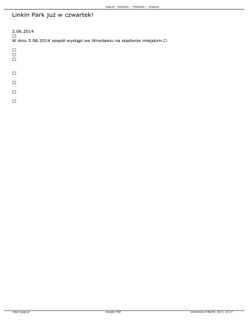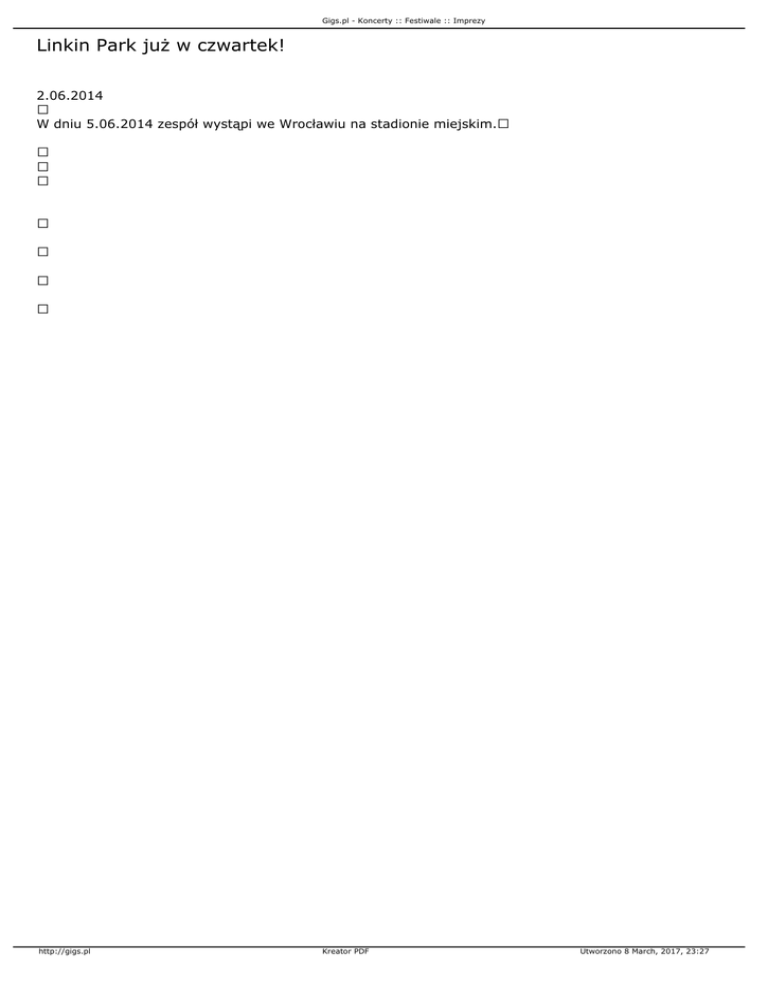 Gigs.pl - Koncerty :: Festiwale :: Imprezy Linkin Park już w czwartek! 2.06.2014 W dniu 5.06.2014 zespół wystąpi we Wrocławiu na stadionie miejskim. http://gigs.pl Kreator PDF Utworzono 8 March, 2017, 23:27