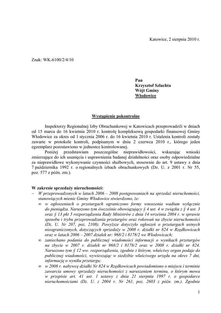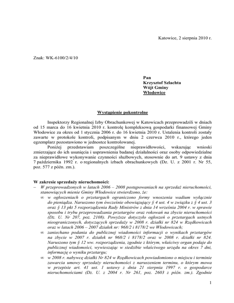 Katowice, 2 sierpnia 2010 r. Znak: WK-6100/2/4/10 Pan Krzysztof Szlachta Wójt Gminy Włodowice Wystąpienie pokontrolne Inspektorzy Regionalnej Izby Obrachunkowej w Katowicach przeprowadzili w dniach od 15 marca do 16 kwietnia 2010 r. kontrolę kompleksową gospodarki finansowej Gminy Włodowice za okres od 1 stycznia 2006 r. do 16 kwietnia 2010 r. Ustalenia kontroli zostały zawarte w protokole kontroli, podpisanym w dniu 2 czerwca 2010 r., którego jeden egzemplarz pozostawiono w jednostce kontrolowanej. PoniŜej przedstawiam poszczególne nieprawidłowości, wskazując wnioski zmierzające do ich usunięcia i usprawnienia badanej działalności oraz osoby odpowiedzialne za nieprawidłowe wykonywanie czynności słuŜbowych, stosownie do art. 9 ustawy z dnia 7 października 1992 r. o regionalnych izbach obrachunkowych (Dz. U. z 2001 r. Nr 55, poz. 577 z późn. zm.). W zakresie sprzedaŜy nieruchomości: − W przeprowadzonych w latach 2006 – 2008 postępowaniach na sprzedaŜ nieruchomości, stanowiących mienie Gminy Włodowice stwierdzono, Ŝe: • w ogłoszeniach o przetargach ograniczono formy wnoszenia wadium wyłącznie do pieniądza. Naruszono tym ówcześnie obowiązujący § 4 ust. 4 w związku z § 4 ust. 3 oraz § 13 pkt 5 rozporządzenia Rady Ministrów z dnia 14 września 2004 r. w sprawie sposobu i trybu przeprowadzania przetargów oraz rokowań na zbycie nieruchomości (Dz. U. Nr 207, poz. 2108). PowyŜsze dotyczyło ogłoszeń o przetargach ustnych nieograniczonych, dotyczących sprzedaŜy w 2008 r. działki nr 824 w Rzędkowicach oraz w latach 2006 – 2007 działek nr: 968/2 i 8178/2 we Włodowicach; • zaniechano podania do publicznej wiadomości informacji o wynikach przetargów na zbycie w 2007 r. działek nr 968/2 i 8178/2 oraz w 2008 r. działki nr 824. Naruszono tym § 12 ww. rozporządzenia, zgodnie z którym, właściwy organ podaje do publicznej wiadomości, wywieszając w siedzibie właściwego urzędu na okres 7 dni, informację o wyniku przetargu; • w 2008 r. nabywcę działki Nr 824 w Rzędkowicach powiadomiono o miejscu i terminie zawarcia umowy sprzedaŜy nieruchomości z naruszeniem terminu, o którym mowa w przepisie art. 41 ust. 1 ustawy z dnia 21 sierpnia 1997 r. o gospodarce nieruchomościami (Dz. U. z 2004 r. Nr 261, poz. 2603 z późn. zm.). Zgodnie 1 z przytoczonym przepisem, organizator przetargu jest obowiązany zawiadomić osobę ustaloną jako nabywca nieruchomości o miejscu i terminie zawarcia umowy sprzedaŜy, najpóźniej w ciągu 21 dni od dnia rozstrzygnięcia przetargu. Wyznaczony termin nie moŜe być krótszy niŜ 7 dni od dnia doręczenia zawiadomienia. Nabywcę zawiadomiono o miejscu i terminie zawarcia umowy, pismem wysłanym 15 grudnia 2008 r., w którym termin zawarcia umowy sprzedaŜy wyznaczono na 19 grudnia 2008 r. Nabywca odebrał pismo 15 grudnia 2008 r.; • w 2007 r. sprzedano lokal mieszkalny w Rudnikach, udzielając bonifikaty niezgodnie z zasadami ustalonymi przez Radę Gminy Włodowice w Uchwale Nr 218/XXVII/05 z dnia 29 grudnia 2005 r. w sprawie ustalenia bonifikat przy sprzedaŜy mieszkań komunalnych na rzecz dotychczasowych najemców. Zgodnie z powyŜszą uchwałą, nabywcom przysługiwała m.in. bonifikata w wysokości do 55% ceny lokalu z tytułu sprzedaŜy na rzecz dotychczasowego najemcy i bonifikata w wysokości do 10% ceny lokalu dla kupujących za gotówkę (płatne jednorazowo). Wartość rynkowa ww. lokalu wraz z udziałem w gruncie, zgodnie z operatem szacunkowym z 21 maja 2007 r., wynosiła 23.607,00 zł. W protokole uzgodnień z 15 czerwca 2007 r. ustalono, Ŝe cena sprzedaŜy lokalu wraz z udziałem w gruncie po zastosowaniu bonifikaty wynikającej z Uchwały Rady Włodowice Nr 218/XXVII/05 w wysokości 65% wynosi 9.561 zł. Kwota udzielonej ww. bonifikaty powinna wynosić 15.344,55 zł, a wynosiła 14.046,00 zł. Najemca zobowiązany był nabyć lokal za kwotę 8.262,45 zł (23.607,00 zł – 15.344,55 zł). Umowę sprzedaŜy zawarto w formie aktu notarialnego w dniu 29 sierpnia 2007 r. na kwotę 9.561,00 zł. Zadania związane ze sprzedaŜą nieruchomości oraz organizowaniem przetargów na zbywanie nieruchomości gminnych naleŜały do Kierownika Referatu Gospodarki Gruntami, Rolnictwa i Ochrony Środowiska. Bezpośredni nadzór w powyŜszym zakresie sprawował p. Krzysztof Szlachta – Wójt Gminy Włodowice. Do przeprowadzenia przetargów powołano komisje przetargowe Zarządzeniami Wójta Gminy Włodowice Nr 297/2006 z dnia 9 października 2006 r., Nr 20/2007 z dnia 13 marca 2007 r. oraz Nr 147/2008 z dnia 1 grudnia 2008 r. Wniosek Nr 1 Wzmocnić nadzór nad pracownikami Urzędu Gminy Włodowice w zakresie przygotowania oraz przeprowadzania przetargów na zbycie nieruchomości, stosownie do przepisów ustawy z dnia 21 sierpnia 1997 r. o gospodarce nieruchomościami (Dz. U. z 2010 r. Nr 102, poz. 651) oraz rozporządzenia Rady Ministrów z dnia 14 września 2004 r. w sprawie sposobu i trybu przeprowadzania przetargów oraz rokowań na zbycie nieruchomości (Dz. U. Nr 207, poz. 2108 z późn. zm.), mając na uwadze przepisy art. 68 i art. 69 ust. 1 pkt 3 ustawy z dnia 27 sierpnia 2009 r. o finansach publicznych (Dz. U. Nr 157, poz. 1240 z późn. zm.). W zakresie zamówień publicznych: − W zakresie przeprowadzenia postępowania o udzielenie w 2008 r. zamówienia publicznego w trybie przetargu nieograniczonego na zadanie pn.: „Termomodernizacja budynku i usuwanie barier architektonicznych budynku Szkoły Podstawowej we Włodowicach” stwierdzono, Ŝe: • zaniechano zamieszczenia ogłoszenia o zamówieniu na stronie internetowej, co było wymagane przepisem art. 40 ust. 1 ustawy z dnia 29 stycznia 2004 r. – Prawo zamówień publicznych (Dz. U. z 2007 r. Nr 223, poz. 1655 z późn. zm.). Zgodnie z przytoczonym przepisem, Zamawiający wszczyna postępowanie w trybie przetargu nieograniczonego, zamieszczając ogłoszenie o zamówieniu w miejscu publicznie 2 • • dostępnym w swojej s