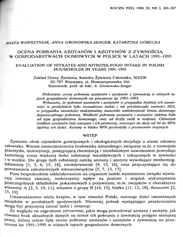 ROCZN. PZH, 1999, 50, NR 3, 269-287 AGATA W AW RZYNIAK A N N A GRONOWSKA-SENGER, KATARZYNA GÓRECKA O C E N A P O B R A N IA A Z O T A N Ó W I A Z O T Y N Ó W Z Ż Y W N O ŚC IĄ W G O SPO D A R S T W A C H D O M O W Y C H W PO L SC E W LA TA C H 1991-1995 EVALUATION O F N ITRATES AND NITRITES FO O D INTAKE IN POLISH H O USEHO LD S IN YEARS 1991-1995 Zakład Oceny Żywienia, Katedra Żywienia Człowieka, SGGW 02-787 Warszawa, ul. Nowoursynowska 166 Kierownik: prof, dr hab. A. Gronowska-Senger Dokonano oceny pobrania azotanów i azotynów z żywnością w różnych ty pach gospodarstw domowych na przestrzeni lat 1991-1995. Wykazano, że pobranie azotanów i azotynów w przypadku średniej ich zawar tości w produktach było stosunkowo niskie i nie przekraczało wartości ADI, w przypadku zawartości maksymalnej stanowiło wielokrotność limitu dziennego dopuszczalnego pobrania. Wielkość pobrania azotanów i azotynów zależna była od typu gospodarstwa domowego, oraz od liczby osób w rodzinie. Głównym źródłem azotanów były warzywa i ich przetwory, wnoszące do diety od 94 do 98% ogólnej ich ilości. Azotyny w blisko 90% pochodziły z przetworów mięsnych. WSTĘP Żywienie obok czynników genetycznych i ekologicznych decyduje o stanie zdrowia człowieka. W zrost zanieczyszczenia środowiska naturalnego, związany m.in. z rozwojem przemysłu, m otoryzacji, postępującą chem izacją i niewłaściwym nawożeniem powoduje kumulację coraz większej ilości substancji nieodżywczych i toksycznych w żywności i w wodzie. D o grupy tych substancji należą azotany i azotyny wywołujące m ethem oglobinemię [1, 3, 6, 15, 18], niedokrw istość [9, 15, 16], oraz przyczyniające się do powstawania rakotwórczych nitrozozwiązków [5, 7, 13, 17]. Poza bezpośrednim oddziaływaniem na organizm ludzki wym ienione związki wywie rają również znaczny, niekorzystny wpływ na poziom i stopień wykorzystania poszczególnych składników pokarmowych z pożywienia, m.in. związków o charakterze witaminy A [2, 3, 10, 11], w itam in z grupy В [14, 15], białka [11, 12, 18], tłuszczów [2, 15, 19]. Ustawodawstwo wielu krajów, w tym również Polski, norm uje ilości omawianych związków w produktach spożywczych. Niemniej jednak występujące przekroczenia mogą być przyczyną zatruć ludzi i zwierząt. Ze względu na zagrożenie zdrow otne, jakie mogą powodować azotany i azotyny, jak również brak aktualnych danych na tem at ich pobrania z żywnością podjęto niniejszą Pracę, której celem była ocena pobrania azotanów i azotynów z żywnością na prze strzeni lat 1991-1995 w różnych typach gospodarstw domowych. 272 A. Wawrzyniak, A. Gronowska-Senger, К. Górecka Nr 3 Porów nując uzyskane wyniki z dopuszczalnym dziennym pobraniem (A D I) wyliczo nym dla osób w poszczególnych typach gospodarstw domowych stw ierdzono, że pobra nie azotanów z produktam i o przeciętnym stężeniu tych związków było stosunkowo niskie i średnio w badanym okresie wyniosło około 58% A D I (rye. 1), natomiast w przypadku spożycia produktów o maksymalnej zawartości azotanów było bardzo wysokie przekraczające średnio 3,8 raza wartości A D I. G rupam i najbardziej narażonym i na zwiększone pobranie azotanów z żywnością były gospodarstw a rolników indywidualnych, oraz emerytów i rencistów, gdzie średnie do starczanie N a N 0 3 w badanym okresie wyniosło dla dwóch w ariantów pobrania odpo w iednio 67% i 440% A D I. Najniższe pobranie azotanów w odniesieniu do A D I, średnio o 25% niższe niż w przypadku ww. gospodarstw , odnotow ano w gospodarstw ach pra cowniczych oraz w gospodarstw ach pracujących na własny rachunek. Biorąc pod uwagę liczbę osób w rodzinie (tab. II) stwierdzono, że wraz z jej w zrostem p obranie azotanów z żywnością m alało i w rodzinach 6-osobowych było niższe średnio o ponad 49% w przypadku spożycia produktów o przeciętnej zawartości N a N 0 3 i o 43% w przypadku spożycia produktów o maksymalnej zawartości tych związków, w stosunku do osób w gospodarstw ach 1-osobowych. O dstępstw a od tej tendencji dotyczyły w niektórych przypadkach rodzin 1-i 2-, 4-i 5-, oraz 5-i 6-osobow ych. Najwięcej azotanów z żywnością pobierano w 1-osobowych gospodarstw ach rol ników indywidualnych. Rów nież w rodzinach 6-osobowych badanej grupy, w porów na niu z pozostałym i gospodarstw am i tej wielkości odnotow ano najwyższe pobranie N aN O j, mim o iż było ono niższe o około 54%, odpow iednio dla badanych wariantów ich zawartości w żywności, w stosunku do gospodarstw 1-osobowych. P odobne wyniki uzyskano także w przypadku gospodarstw pracowniczo-chłopskich, nieco niższe w gospodarstw ach em erytów i rencistów. Najniższe dostarczanie azotanów z żywnością w 1-osobowych gospodarstw ach miało miejsce w przypadku pracujących na własny rachunek i utrzymujących się z niezarobkowych źródeł i było 2-krotnie niższe w stosunku do pobrania odnotow anego dla tej samej wielkości gospodarstw rolników indywidualnych. Także różnice w pobraniu N a N 0 3 z żywnością pomiędzy 1-a 6-osobowymi rodzinam i tych gospodarstw były niższe niż w pozostałych typach gospodarstw. Rodziny 6-osobowe pobierały bowiem do około 28% mniej azotanów w stosunku do 1-osobowych w obu w ariantach zawartości tych związków w produktach. O dnosząc uzyskane dane do wartości dopuszczalnego dziennego pobrania (ryc. 2) zaobserw ow ano, że we wszystkich typach gospodarstw domowych realizacja A D I przez gospodarstw a 1-osobowe była wyższa niż w przypadku rodzin 6-osobowych średnio o około 25% przy spożyciu żywności o przeciętnym i maksymalnym poziom ie azo tanów. W śród 1-osobowych gospodarstw najwyższe pobranie azotanów , wynoszące 98% A D I przy przeciętnym i 642% A D I przy maksymalnym poziom ie tych związków w pro duktach odnotow ano w gospodarstw ach rolników indywidualnych. Nieco niższe war tości by