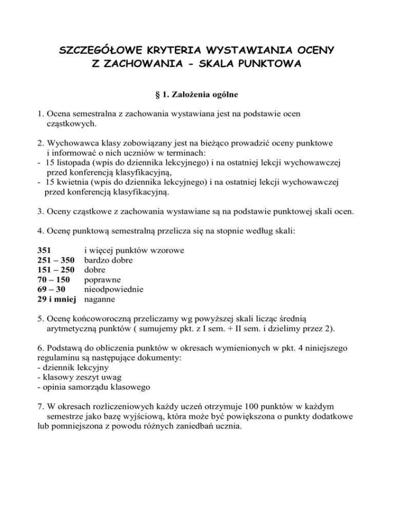 SZCZEGÓŁOWE KRYTERIA WYSTAWIANIA OCENY Z ZACHOWANIA - SKALA PUNKTOWA § 1. Założenia ogólne 1. Ocena semestralna z zachowania wystawiana jest na podstawie ocen cząstkowych. 2. Wychowawca klasy zobowiązany jest na bieżąco prowadzić oceny punktowe i informować o nich uczniów w terminach: - 15 listopada (wpis do dziennika lekcyjnego) i na ostatniej lekcji wychowawczej przed konferencją klasyfikacyjną, - 15 kwietnia (wpis do dziennika lekcyjnego) i na ostatniej lekcji wychowawczej przed konferencją klasyfikacyjną. 3. Oceny cząstkowe z zachowania wystawiane są na podstawie punktowej skali ocen. 4. Ocenę punktową semestralną przelicza się na stopnie według skali: 351 251 – 350 151 – 250 70 – 150 69 – 30 29 i mniej i więcej punktów wzorowe bardzo dobre dobre poprawne nieodpowiednie naganne 5. Ocenę końcoworoczną przeliczamy wg powyższej skali licząc średnią arytmetyczną punktów ( sumujemy pkt. z I sem. + II sem. i dzielimy przez 2). 6. Podstawą do obliczenia punktów w okresach wymienionych w pkt. 4 niniejszego regulaminu są następujące dokumenty: - dziennik lekcyjny - klasowy zeszyt uwag - opinia samorządu klasowego 7. W okresach rozliczeniowych każdy uczeń otrzymuje 100 punktów w każdym semestrze jako bazę wyjściową, która może być powiększona o punkty dodatkowe lub pomniejszona z powodu różnych zaniedbań ucznia. § 2. Kryteria punktacji: 1. Uczeń otrzymuje dodatkowe punkty za: a) 10 pkt. za każdą godzinę prac społecznych na rzecz klasy, Gimnazjum w ramach zajęć pozalekcyjnych b) za ocenę pracy na zajęciach pozalekcyjnych odpowiednio: Ocena wzorowa – 20 pkt. Ocena bardzo dobra – 15 pkt. Ocena dobra – 10 pkt. Ocena dostateczna i przynależność – 5 pkt. c) 0-60 pkt. za realizację obowiązkowych projektów edukacyjnych d) 20 pkt. za każdorazową efektywną pomoc innym uczniom w rozwiązywaniu trudności szkolnych e) 5-20 pkt. za wzorowe wywiązywanie się z dobrowolnie przyjętych zadań nadobowiązkowych f) 15 pkt. za udział w przedstawieniach szkolnych (apel) g) 25 pkt. za reprezentowanie szkoły w akademiach środowiskowych (występy) h) 10 pkt. za każdą własną inicjatywę w różnych działaniach np. wzbogacenie pracowni w pomoce dydaktyczne, wykonanie dekoracji i) 20 pkt. za pochwałę od dyrektora szkoły lub wicedyrektora szkoły. j) 10 pkt. za udział w różnego typu akcjach i imprezach szkolnych k)15 pkt. za udział w imprezach środowiskowych l) 10 pkt. za reprezentowanie klasy gimnazjum w zawodach sportowych, ł) 20 pkt. za reprezentowanie klasy gimnazjum w konkursach, olimpiadach (bez nagród i wyróżnień) m) 15 pkt. za przejście do II etapu konkursu lub zajęcie miejsc między 4 a 10 w przypadku dużej liczby uczestników n) 20 pkt.za III miejsce w konkursie lub olimpiadzie na II etapie konkursu/olimpiady o) 25 pkt. za II miejsce w konkursie lub olimpiadzie na II etapie konkursu/olimpiady p) 30 pkt. za I miejsce w konkursie lub olimpiadzie na II etapie konkursu/olimpiady r) 25 pkt. za przejście do III etapu konkursu lub zajęcie miejsc między 4 a 10 w przypadku dużej liczby uczestników s) 40 pkt. za II miejsce w konkursie lub olimpiadzie, finalista III etap t) 50 pkt. za I miejsce w konkursie lub olimpiadzie, finalista III etapu u) 20 pkt. za 100 % frekwencji w) 20 pkt. za brak jakichkolwiek uwag negatywnych 2. Uczeń traci punkty za: a) 2 pkt. za jedno spóźnienie nieusprawiedliwione b) 5 pkt. za jedną godzinę nieobecności nieusprawiedliwionej c) 5 pkt. za każdorazowe stwierdzenie niewłaściwego stroju d) 0 pkt. za upomnienie do zeszytu uwag – za brak dzienniczka (pierwszy raz) e) 5 pkt. za każdy kolejny brak dzienniczka f) 10 pkt. za samowolne przejście na hale sportową i z powrotem g) 20 pkt. za samowolne opuszczenie terenu Gimnazjum w czasie lekcji lub przerwy (oprócz długich przerw w okresie ustalonym przez dyrektora szkoły) h) 20 pkt. za samowolne opuszczenie budynku szkoły (np. wyjście do sklepu) i ) 5 – 20 pkt. za nie wywiązanie się z dobrowolnie przyjętych zadań nadobowiązkowych j) od 5 -10 pkt. za każdą uwagę dotyczącą dyscypliny na lekcji lub innych zaniedbań obowiązków k) 20-50 pkt. za niekulturalne zachowanie wobec innych uczniów i pracowników Gimnazjum (np. przekleństwa, przezwiska, kłamstwa, arogancja, obsceniczne gesty i pozy, wyśmiewanie się z innych) l) 5- 50 pkt. za zamieszczanie na stronie internetowej niestosownych zdjęć, obraźliwych tekstów, komentarzy wobec uczniów i nauczycieli ł)100 pkt za fałszowanie podpisów rodziców (prawnych opiekunów) i inne fałszerstwa m) 100 pkt. za niezrealizowanie obowiązkowego projektu edukacyjnego w wyznaczonym czasie, n) 50 – 100 pkt. za przemoc fizyczną i psychiczną wobec innych uczniów i pracowników Gimnazjum (np. bicie innych, rozboje, szantaż, wyłudzanie, znęcanie się nad innymi) o) 50 – 100 pkt. za niszczenie mienia Gimnazjum p) 100 pkt. za kradzieże r) 100 pkt. za każdorazowe stwierdzenie palenia papierosów na terenie szkoły i poza nią s) 100 pkt. za każdorazowe stwierdzenie picia alkoholu, zażywanie narkotyków lub innych środków odurzających lub udostępnianie wymienionych środków innym uczniom lub nakłanianie do ich spożycia na terenie szkoły i poza nią t) 5 pkt. za każdorazowy brak odpowiedniego obuwia u) 10 pkt. za noszenie biżuterii zagrażającej zdrowiu i bezpieczeństwu np. zbyt duże kolczyki, kolczyki w nosie i brwiach itp. w) 10 pkt. za makijaż y) 20 pkt. jednorazowo za farbowanie włosów ( jeżeli uczeń po upływie dwóch tygodni nie dostosuje się do regulaminu, nie może mieć w ocenie semestralnej i końcowej oceny wzorowej i bardzo dobrej) z) 10 pkt. za niestosowny strój uczniowski na różne uroczystości i imprezy szkole i środowiskowe, ź) 20 pkt. za naganę dyrektora szkoły lub wicedyrektora szkoły, ż) 5 pkt. za łamanie innych postanowień Regulaminu Gimnazjum nie wyszczególnionych w wykazie, § 3. Postanowienia końcowe: 