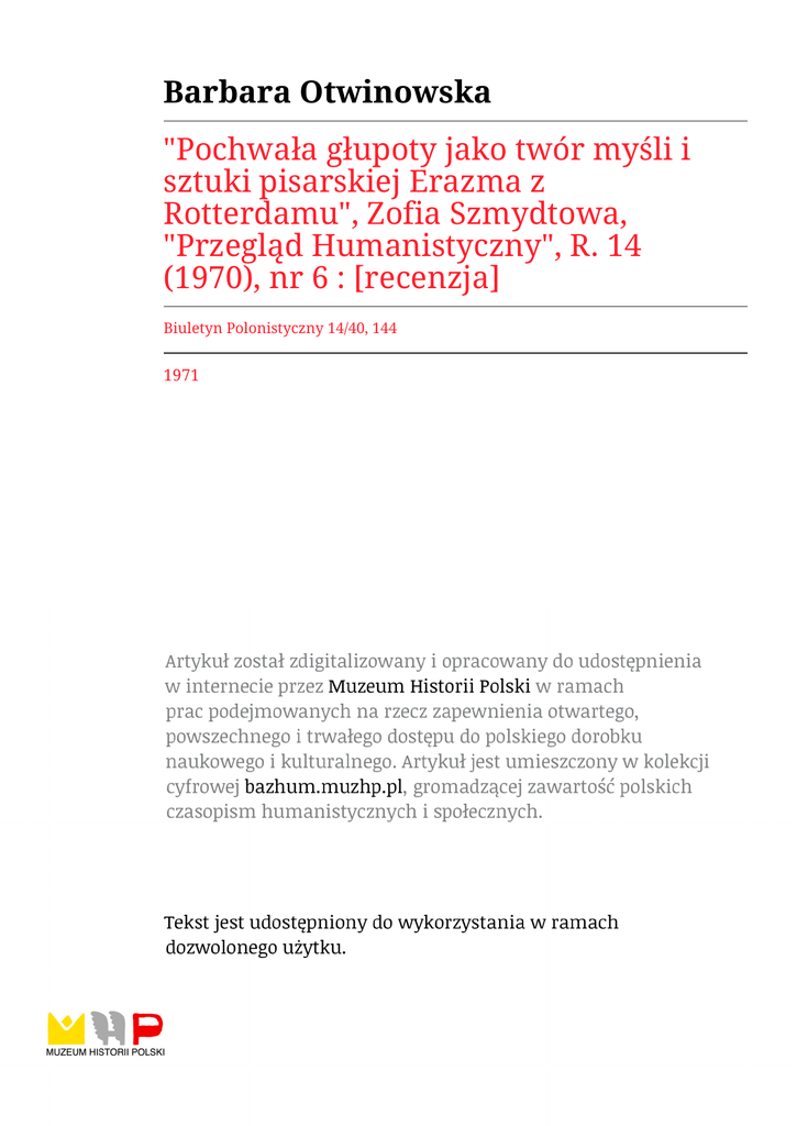 Barbara Otwinowska "Pochwała głupoty jako twór myśli i sztuki pisarskiej Erazma z Rotterdamu", Zofia Szmydtowa, "Przegląd Humanistyczny", R. 14 (1970), nr 6 : [recenzja] Biuletyn Polonistyczny 14/40, 144 1971 (II) JUROW Włodzimierz: Praktyka pisarska i literackie tra dycje żywotów świętych polskich do końca wieku XVI. "Prze gląd Humanistyczny" R.XIV: 1970 nr 6 s. 119-136* W zarysie rozwoju hagiografii, począwszy od stolskich" św. Łukasza, wyodrębniono kilka "Dziejów Apo zagadnień szczegó łowych, a mianowicie: 1) kompozycję "żywotów świętych",2) "literackość" postaci bohatera, 5) schematyzm i konwencjonalność hagiografii, dające się zauważyć w powtarzalności wątków i mo tywów szczegółów biograficznych i analogicznych staci świętego. Druga część artykułu omawia fii w piśmiennictwie polskim, wprowadzając funkojach po rozwój hagiogra w zakres zaintere sowania - poza "żywotami" w ścisłym tego słowa znaczeniu - tak że polską poezję i epikę religijną oraz legendy.Ukazane tu zo stały przeobrażenia żywotopisarstwa świętych związane z potrydencką kontrreformacją i wzmożoną działalnością jezuitów. E.D. BP/40 (II) SZMYDTOWA Zofia: "Pochwała głupoty" jako twór myśli i sztuki pisarskiej Erazma z Rotterdamu. "Przegląd Humani styczny" R. XIV: 1970 nr 6 s. 1-20. Rozprawa ukazuje bezpośrednie i pośrednie zjawiska składa jące się na genezę utworu Erazma: śmiały stosunek do teologii, którą próbował uprawiać metodą filologiczną; zwrócenie uwagi na podobieństwo między alegorycznymi sensami wątków biblijnych i mitów greckich; swobodne łączenie sacra i profana; krytyczną rewizję tradycyjnycn systemów wartościowania; wpływy parodii Lukiana i numanistyczną tendencję do obalenia odziedziczonych autorytetów i interpretacji; tendencję d o - szokujących, para doksalnych chwytów, do gry słów, do ironii i in. Artykuł, doko nuje przeglądu środowisk i przejawów życia' społecznego i umy słowego, jakie w "Pochwale głupoty" spotkały się z najsilniej szą satyrą, ukazuje filozoficzny sceptycyzm Erazma, nie prze kreślającego wszakże jego wiary w "nowego człowieka". B.O. BP A C