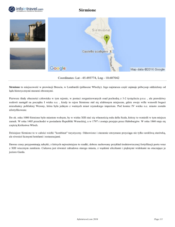 Sirmione Coordinates: Lat - 45.493774, Lng - 10.607042 Sirmione to miejscowość w prowincji Brescia, w Lombardii (północne Włochy). Jego najstarsza część zajmuje półwysep oddzielony od lądu historycznymi murami obronnymi. Pierwsze ślady obecności człowieka w tym rejonie, w postaci zorganizowanych osad pochodzą z 3-2 tysiąclecia p.n.e. , ale prawdziwy rozkwit nastąpił na początku I wieku n.e. , kiedy to rejon Sirmione stał się ulubionym miejscem, gdzie swoje wille wznosili bogaci mieszkańcy pobliskiej Werony, która była jednym z ważnych miast rzymskiego imperium. Pod koniec IV wieku n.e. miasto zostało ufortyfikowane. Do ok. roku 1000 Sirmione było miastem wolnym, by w wieku XIII stać się własnością rodu della Scala, którzy to wznieśli w tym miejscu zamek. W roku 1405 przechodzi w posiadanie Republiki Weneckiej, a w 1797 r zostaje przejęte przez Habsburgów. W roku 1860 staje się częścią Królestwa Włoch. Dzisiejsze Sirmione to w całości wielki "kombinat" turystyczny. Odnowione i starannie utrzymane przyciąga nie tylko urokliwą starówką, ale również licznymi hotelami i restauracjami. Dawne czasy przypominają zabytki, z których najważniejsze to rzadki, dobrze zachowany przykład średniowiecznej fortyfikacji portu wraz z XIII wiecznym zamkiem. Ciekawa jest również zabudowa starego miasta, z wąskimi uliczkami i pięknymi widokami na otaczające je jezioro Garda. Infointravel.com 2016 Page 1/1