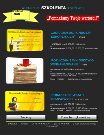ATRAKCYJNE SZKOLENIA JESIEŃ 2010 Certyfikat MEN „DORADCA DS. FUNDUSZY EUROPEJSKIC” – 6/8 dni WROCŁAW ~ od 2 150,00 PLN brutto/os lub szkolenie zamknięte: 2 500,00 - 3 600,00 PLN brutto/dzień „ROZLICZANIE WNIOSKÓW O DOFINANSOWANIE” - 4 dni koszt inwestycji ~ od 999,00 PLN brutto/os lub szkolenie zamknięte: 2 500,00 - 3 600,00 PLN brutto/dzień 7HUPLQU:52&à$: Miasta: 32=1$ē, KRAKÓW i inne na życzenie klienta „DORADCA DS. ANALIZ FINANSOWYCH” – 8/10/12 dni koszt inwestycji ~ od 2 450,00 PLN brutto/os lub szkolenie zamknięte: 2 500,00 - 3 600,00 PLN brutto/dzień Miasta: Trenerzy CWPE S.A. Kontakt: POZNAŃ, KRAKÓW i inne na życzenie klienta Formularz zgłoszeniowy tel. 71 79 79 520/521 fax. 71 79 79 505 www.cwpe.pl e-mail: [email protected] Planujesz lub rozważasz debiut giełdowy? Wrocław, 03.11.2010 – 299,00 brutto Planujesz założenie firmy? Wrocław, 29.11.2010 Planujesz zaciągnąć kredyt? Wrocław, 20.11.2010 Firma przynosi straty albo wykazuje zyski poniżej oczekiwań? Wrocław, 01.12.2010. Planujesz rozwiązać problemy z płynnością finansową? Poznaj sprawdzone sposoby! Wrocław, 16.11.2010 ‐ 299,00 brutto Agnieszka Filipowicz ‐ Specjalista ds. funduszy UE. Absolwentka Akademii Ekonomicznej w Poznaniu na kierunku Europeistyka. Posiada kilkuletnie doświadczenie w pozyskiwaniu wsparcia finansowego z funduszy UE dla przedsiębiorstw. Specjalizuje się w dotacjach inwestycyjnych dla sektora MSP. Jest autorem ponad 100 projektów składanych w ramach programów unijnych takich jak SPOWKP, ZPORR, PHARE. Dodatkowo zajmuje się koordynacją i monitoringiem realizowanych przez przedsiębiorców inwestycji. Uczestniczyła wielokrotnie w wizjach monitorujących zakończenie projektu oraz zajmowała się rozliczaniem projektów inwestycyjnych. Podczas szkoleń stara się łączyć wiedze teoretyczną z praktyką , co ułatwia uczestnikom szkoleń zrozumienie przedstawianych zagadnień. Bartosz Wolański ‐ Z tematyką funduszy strukturalnych związany jest od początku ich funkcjonowania w Polsce (2004 r.). Jest autorem kilkudziesięciu projektów inwestycyjnych dla firm i jednostek samorządu terytorialnego, z których największy opiewał na kwotę ponad 60 mln PLN. W swoim dorobku wykazać się może doświadczeniem w zakresie takich programów jak PHARE, SAPARD, SPO WKP, ZPORR, INTERREG oraz Mechanizmy Finansowe EOG, a także PO Kapitał Ludzki oraz RPO na lata 2007‐2013. Jako Kierownik Projektu posiada także doświadczenie w zakresie sporządzania oraz obsługi projektów szkoleniowych, finansowanych z Europejskiego Funduszu Społecznego. Największy z nich obejmował kwotę 2,5 mln PLN i był przeznaczony dla 350 Beneficjentów z terenu woj. dolnośląskiego. Prowadzi także liczne szkolenia z zakresu skutecznego aplikowania o środki unijne. CWPE S.A. Kontakt: tel. 71 79 79 520/521 fax. 71 79 79 505 www.cwpe.pl Powrót do pierwszej strony e-mail: [email protected] Nasi klienci PROGRAM SZKOLEŃ: „DORADCA DS. FUNDUSZY EUROPEJSKICH” DZIEŃ I POLITYKA STRUKTURALNA UNII EUROPEJSKIEJ ORAZ OMÓWIENIE PROGRAMÓW OPERACYJNYCH NA LATA 2007-2013 9:00-11:00 Moduł 1: 1. Powitanie i Rejestracja Uczestników. 2. Wprowadzenie do Funduszy dla firm. 3. Omówienie programów: Regionalny Program Operacyjny (RPO) Zagadnienia: typy projektów, beneficjenci, koszty kwalifikowane i niekwalifikowane, wielkość wsparcia, formalne warunki naboru wniosków, terminy składania wniosków. Pytania uczestników. 11:00-11:15 Przerwa 11:15-13:00 kawowa Moduł 2: 4. Program Operacyjny Innowacyjna Gospodarka (PO IG), 5. Program Rozwoju Obszarów Wiejskich (PROW), 13:00-13:30 Ciep ły lunch 13:30-16:00 6. Ćwiczenia na przykładach Zagadnienia: typy projektów, beneficjenci, koszty kwalifikowane i niekwalifikowane, wielkość wsparcia, formalne warunki naboru wniosków, terminy składania wniosków. Pytania uczestników. DZIEŃ II WARSZTATY Z PRZYGOTOWANIA WNIOSKU O DOTACJĘ Z PO KAPITAŁ LUDZKI 9:00-11:15 Moduł 1: 1. Nauka instalacji i obsługi Generatora Wniosków. 2. Omówienie Programu Operacyjnego Kapitał Ludzki (PO KL) CWPE S.A. Kontakt: tel. 71 79 79 520/521 fax. 71 79 79 505 www.cwpe.pl Powrót do pierwszej strony e-mail: [email protected] 11.15-11.30 Przerwa 11.30-13:00 kawowa Moduł 2: 1. Zasady wypełniania Wniosku w ramach PO Kapitał Ludzki 3. Omówienie podstawowych załączników do Wniosku w ramach PO Kapitał Ludzki. 4. Warsztaty wypełnienia Wniosku w ramach PO Kapitał Ludzki. Zagadnienia: praca wg wytycznych prowadzącego na podstawie studium przypadku, wzory dokumentacji projektowej, formularze aplikacyjne. 13:00-13:30 Ciep ły lunch 13:30-16:00 Dzień III 9:00-11:15 5. Cd. wypełnienia Wniosku w ramach PO Kapitał Ludzki. Warsztaty z przygotowania Wniosku o dotację inwestycyjną dla firm Moduł 1: 1. Przekazanie uwag CWPE do sporządzonego przez uczestników Wniosku PO Kapitał Ludzki. 2. Zasady wypełniania Wniosku o dotację inwestycyjną dla firm 11:15-11:30 Przerwa 11:30-13:00 kawowa Moduł 2: 3. Omówienie podstawowych załączników do Wniosku o dotację inwestycyjną dla firm. 4. Warsztaty wypełnienia Wniosku o dotację inwestycyjną dla firm Zagadnienia: praca wg wytycznych prowadzącego na podstawie studium przypadku, wzory dokumentacji projektowej, przykłady dokumentów rejestrowych, formularze aplikacyjne. 13:00-13:30 Ciep ły lunch 13:30-16:00 Moduł 3: 5. Cd. wypełnienia Wniosku o dotację inwestycyjną dla firm. Dzień IV BIZNES PLAN – sporządzanie Biznesplanu dla projektu inwestycyjnego 9:00-11:15 Moduł 1: 1. Poprawa Wniosku o dotację inwestycyjną dla firm wg uwag prowadzącego. 2. Zasady oceny Wniosku o dotację inwestycyjną dla firm 11:15-11:30 Przerwa 11:30-13:00 kawowa Moduł 2: 3. Zasady wypełniania Biznesplanu dla projektu inwestycyjnego. 4. Warsztaty wypełnienia Biznesplanu dla projektu inwestycyjnego Zagadnienia: praca wg wytycznych prowadzącego na podstawie studium przypadku i skorygowanego Wniosku z dnia poprz