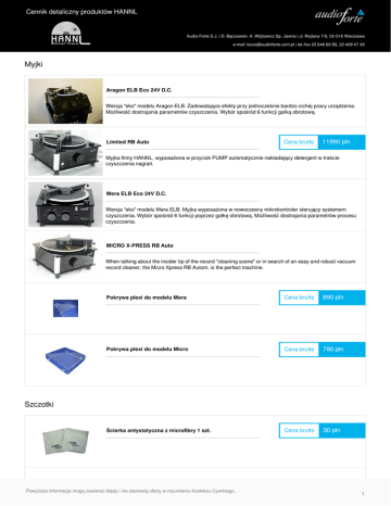 Cennik detaliczny produktów HANNL Audio Forte S.J. | D. Bączewski, A. Wójtowicz Sp. Jawna | ul. Rejtana 7/9, 02-516 Warszawa e-mail: [email protected] | tel./fax 22 646 69 99, 22 409 47 43 Myjki Aragon ELB Eco 24V D.C. Wersja "eko" modelu Aragon ELB. Zadowalające efekty przy jednocześnie bardzo cichej pracy urządzenia. Możliwość dostrajania parametrów czyszczenia. Wybór spośród 6 funkcji gałką obrotową. Limited RB Auto Cena brutto 11990 pln Myjka firmy HANNL, wyposażona w przycisk PUMP automatycznie nakładający detergent w trakcie czyszczenia nagrań. Mera ELB Eco 24V D.C. Wersja "eko" modelu Mera ELB. Myjka wyposażona w nowoczesny mikrokontroler sterujący systemem czyszczenia. Wybór spośród 6 funkcji poprzez gałkę obrotową. Możliwość dostrajania parametrów procesu czyszczenia. MICRO X-PRESS RB Auto When talking about the insider tip of the record "cleaning scene" or in search of an easy and robust vacuum record cleaner, the Micro Xpress RB Autom. is the perfect machine. Pokrywa plexi do modelu Mera Cena brutto 890 pln Pokrywa plexi do modelu Micro Cena brutto 790 pln Ścierka antystatyczna z microfibry 1 szt. Cena brutto 30 pln Szczotki Powyższe informacje mogą zawierać błędy i nie stanowią oferty w rozumieniu Kodeksu Cywilnego. 1 Szczotka obrotowa Szczotka obrotowa - pasująca do wszystkich modeli maszyn firmy Hannl. Szczotki do maszyn myjących 2 szt Cena brutto 80 pln Hannl X2000 płyn do maszynowego czyszczenia winyli 1 litr Cena brutto 110 pln Cena brutto 195 pln Cena brutto 155 pln Cena brutto 85 pln Płyny Hannl X2000 Liquid 1 L Hannl X2000 płyn do maszynowego czyszczenia winyli 2 litry Hannl X2000 Liquid 2 L VI3C cleaner 2,0 L HANNL VI3C VINYL DETERGENT (2 LITER) VI3C Vinyl Cleaner 1 L HANNL VI3C VINYL DETERGENT (1 LITER) Podkładki Powyższe informacje mogą zawierać błędy i nie stanowią oferty w rozumieniu Kodeksu Cywilnego. 2 Mata antystatyczna do maszyn myjących Powyższe informacje mogą zawierać błędy i nie stanowią oferty w rozumieniu Kodeksu Cywilnego. Cena brutto 65 pln 3
