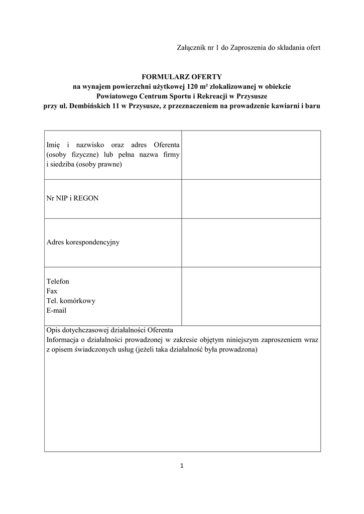 Załącznik nr 1 do Zaproszenia do składania ofert FORMULARZ OFERTY na wynajem powierzchni użytkowej 120 m² zlokalizowanej w obiekcie Powiatowego Centrum Sportu i Rekreacji w Przysusze przy ul. Dembińskich 11 w Przysusze, z przeznaczeniem na prowadzenie kawiarni i baru Imię i nazwisko oraz adres Oferenta (osoby fizyczne) lub pełna nazwa firmy i siedziba (osoby prawne) Nr NIP i REGON Adres korespondencyjny Telefon Fax Tel. komórkowy E-mail Opis dotychczasowej działalności Oferenta Informacja o działalności prowadzonej w zakresie objętym niniejszym zaproszeniem wraz z opisem świadczonych usług (jeżeli taka działalność była prowadzona) 1 Oferowany czynsz miesięczny brutto za 1 m² za najem: Koncepcja funkcjonowania lokalu (kawiarni i baru) uwzględniająca charakter obiektu: 2 Do formularza oferty załączam: 1. w przypadku osób fizycznych – aktualny wpis do ewidencji działalności gospodarczej (wydruk z Centralnej Ewidencji i Informacji o Działalności Gospodarczej), kopię umowy spółki cywilnej (o ile taka została zawarta), kopia nadania numeru NIP i REGON, 2. w przypadku osób prawnych – odpis z właściwego rejestru (wydruk elektroniczny), kopię nadania numeru NIP i REGON. Oświadczam, że: - zapoznałam/-em się dokładnie z warunkami najmu wymienionymi w zaproszeniu do składania ofert oraz w załączonym projekcie umowy, które niniejszym akceptuję, - zapoznałem/-am się ze stanem technicznym i prawnym przedmiotu najmu, który niniejszym akceptuję, - nie są prowadzone przeciwko mojej osobie jakiekolwiek postępowania egzekucyjne i upadłościowe, - wszelkie dane zawarte w niniejszej ofercie odpowiadają rzeczywistości i złożone zostały przeze mnie zgodnie z prawdą, - wiem, iż niewypełnienie wszystkich rubryk w formularzu oferty, niezłożenie dokumentów lub braki formalne oferty spowodują, że oferta nie zostanie rozpatrzona. …………………………………… (miejscowość i data) …………………………………….. czytelny podpis Oferenta (pieczątka firmy) 3