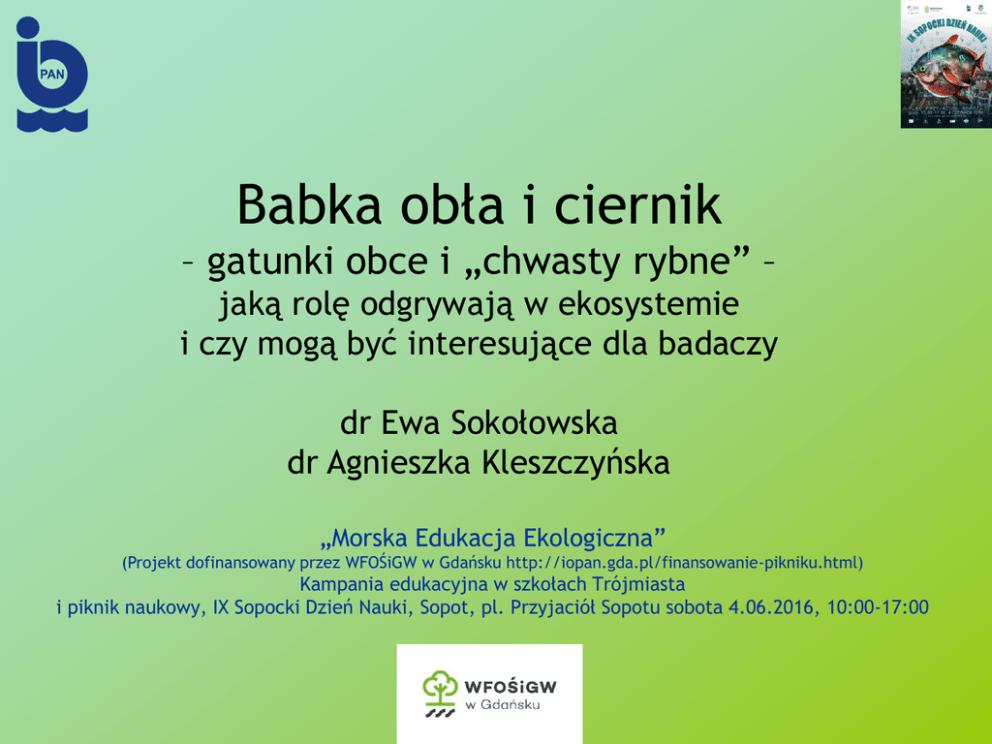 Babka obła i ciernik – gatunki obce i „chwasty rybne” – jaką rolę odgrywają w ekosystemie i czy mogą być interesujące dla badaczy dr Ewa Sokołowska dr Agnieszka Kleszczyńska „Morska Edukacja Ekologiczna” (Projekt dofinansowany przez WFOŚiGW w Gdańsku http://iopan.gda.pl/finansowanie-pikniku.html) Kampania edukacyjna w szkołach Trójmiasta i piknik naukowy, IX Sopocki Dzień Nauki, Sopot, pl. Przyjaciół Sopotu sobota 4.06.2016, 10:00-17:00 Babka obła i ciernik – gatunki obce „…The round gobies are cyberfish, because they came from a distant universe and have to unusual ability to attain high abundances in the face of native fish communities and they are able to disperse rapidly using freighters as transport vectors”. Gatunek obcy – skutki inwazji dla D. J. Jude (1997) ekosystemów lokalnych: Homogenizacja fauny zb. wodnych Utrata bioróżnorodności Mieszanie puli genowych Konkurencja pokarmowa Konkurencja o siedliska Miejsca ekspansji w Ameryce Północnej Kalendarium rozprzestrzenienia w Europie Ekspansja do wód słodkich w Polsce