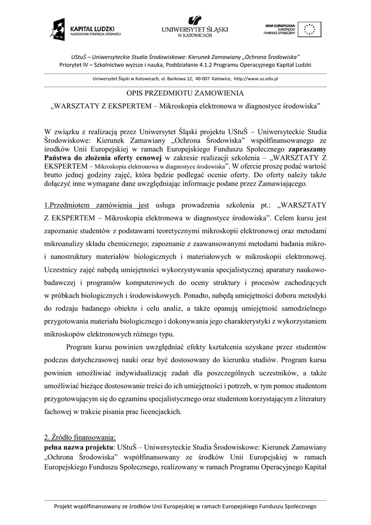 UStuŚ – Uniwersyteckie Studia Środowiskowe: Kierunek Zamawiany „Ochrona Środowiska” Priorytet IV – Szkolnictwo wyższe i nauka, Poddziałanie 4.1.2 Programu Operacyjnego Kapitał Ludzki Uniwersytet Śląski w Katowicach, ul. Bankowa 12, 40-007 Katowice, http://www.us.edu.pl OPIS PRZEDMIOTU ZAMOWIENIA „WARSZTATY Z EKSPERTEM – Mikroskopia elektronowa w diagnostyce środowiska” W związku z realizacją przez Uniwersytet Śląski projektu UStuŚ – Uniwersyteckie Studia Środowiskowe: Kierunek Zamawiany „Ochrona Środowiska” współfinansowanego ze środków Unii Europejskiej w ramach Europejskiego Funduszu Społecznego zapraszamy Państwa do złożenia oferty cenowej w zakresie realizacji szkolenia – „WARSZTATY Z EKSPERTEM – Mikroskopia elektronowa w diagnostyce środowiska”. W ofercie proszę podać wartość brutto jednej godziny zajęć, która będzie podlegać ocenie oferty. Do oferty należy także dołączyć inne wymagane dane uwzględniając informacje podane przez Zamawiającego. 1.Przedmiotem zamówienia jest usługa prowadzenia szkolenia pt.: „WARSZTATY Z EKSPERTEM – Mikroskopia elektronowa w diagnostyce środowiska”. Celem kursu jest zapoznanie studentów z podstawami teoretycznymi mikroskopii elektronowej oraz metodami mikroanalizy składu chemicznego; zapoznanie z zaawansowanymi metodami badania mikroi nanostruktury materiałów biologicznych i materiałowych w mikroskopii elektronowej. Uczestnicy zajęć nabędą umiejętności wykorzystywania specjalistycznej aparatury naukowobadawczej i programów komputerowych do oceny struktury i procesów zachodzących w próbkach biologicznych i środowiskowych. Ponadto, nabędą umiejętności doboru metodyki do rodzaju badanego obiektu i celu analiz, a także opanują umiejętność samodzielnego przygotowania materiału biologicznego i dokonywania jego charakterystyki z wykorzystaniem mikroskopów elektronowych różnego typu. Program kursu powinien uwzględniać efekty kształcenia uzyskane przez studentów podczas dotychczasowej nauki oraz być dostosowany do kierunku studiów. Program kursu powinien umożliwiać indywidualizację zadań dla poszczególnych uczestników, a także umożliwiać bieżące dostosowanie treści do ich umiejętności i potrzeb, w tym pomoc studentom przygotowującym się do egzaminu specjalistycznego oraz studentom korzystającym z literatury fachowej w trakcie pisania prac licencjackich. 2. Źródło finansowania: pełna nazwa projektu: UStuŚ – Uniwersyteckie Studia Środowiskowe: Kierunek Zamawiany „Ochrona Środowiska” współfinansowany ze środków Unii Europejskiej w ramach Europejskiego Funduszu Społecznego, realizowany w ramach Programu Operacyjnego Kapitał Projekt współfinansowany ze środków Unii Europejskiej w ramach Europejskiego Funduszu Społecznego UStuŚ – Uniwersyteckie Studia Środowiskowe: Kierunek Zamawiany „Ochrona Środowiska” Priorytet IV – Szkolnictwo wyższe i nauka, Poddziałanie 4.1.2 Programu Operacyjnego Kapitał Ludzki Uniwersytet Śląski w Katowicach, ul. Bankowa 12, 40-007 Katowice, http://www.us.edu.pl Ludzki, Priorytet IV – Szkolnictwo wyższe i nauka, Działanie 4.1. „Wzmocnienie i rozwój potencjału dydaktycznego uczelni oraz zwiększenie liczby absolwentów kierunków o kluczowym znaczeniu dla gospodarki opartej na wiedzy”, Poddziałanie 4.1.2 "Zwiększenie liczby absolwentów kierunków o kluczowym znaczeniu dla gospodarki opartej na wiedzy" nr zadania: zad 4. Działania podnoszące atrakcyjność kształcenia. PRAKTYCZNA WIEDZA – zagraniczne wizyty studyjne, warsztaty. podzadania: 39. „WARSZTATY Z EKSPERTEM – Mikroskopia elektronowa w diagnostyce środowiska” – wynagrodzenie wykładowców nr umowy: UDA-POKL-04.01.02-00-073/12-00 3. Termin realizacji zamówienia: I kw. 2015; Zajęcia zaplanowano w terminie 1-31.marca 2015 r., w tym wykład (2 godz.) oraz część praktyczna (3 gr. po 6 godz.) tygodniowo, przez 3 tygodnie. Wykonawca jest zobowiązany do dostosowania się do zmian wprowadzanych przez Zamawiającego. 4. Liczba uczestników, do kogo kierowane są zajęcia: zajęcia kierowane są do grupy szczególnie zainteresowanych studentów III roku Ochrony Środowiska UŚ; max 30 os., ale nie mniej niż 10 os. Zamawiający zobowiązuje się dostarczyć listę uczestników w terminie do 7 dni przed rozpoczęciem zajęć. 5. Ilość godzin (godzina zegarowa – 60 min.): 6 godziny zajęć teoretycznych oraz 54 godz. zajęć praktycznych (3 gr. po 18 godz./gr.) 6. Miejsce realizacji zamówienia: Zamawiający zapewnia miejsce realizacji w porozumieniu z Wykonawcą. 7. Zakres tematyczny zajęć oraz proponowany harmonogram: Zakres tematyczny zajęć: Teoretyczne podstawy skaningowej mikroskopii elektronowej z mikroanalizą rentgenowską i jej praktyczne wykorzystanie w analizie próbek biologicznych, w tym środowiskowych podatnych na oddziaływanie czynników biotycznych i abiotycznych. Przykłady wykorzystania analitycznej mikroskopii elektronowej w biotechnologii, biologii, medycynie oraz w ochronie środowiska. Oddziaływanie elektronów z materią. Wykorzystanie skaningowej mikroskopii elektronowej w badaniach mikro- i nanostruktury materiałów. Mikroanalizy składu chemicznego obiektów biologicznych. Analiza i interpretacja obrazu. Przykłady badań z wykorzystaniem różnych technik wizualizacji materii biologicznej. 8. Wymagania względem wykonawcy: Projekt współfinansowany ze środków Unii Europejskiej w ramach Europejskiego Funduszu Społecznego UStuŚ – Uniwersyteckie Studia Środowiskowe: Kierunek Zamawiany „Ochrona Środowiska” Priorytet IV – Szkolnictwo wyższe i nauka, Poddziałanie 4.1.2 Programu Operacyjnego Kapitał Ludzki Uniwersytet Śląski w Katowicach, ul. Bankowa 12, 40-007 Katowice, http://www.us.edu.pl 1. Wykonawca powinien posiadać min. tytuł zawodowy magistra w zakresie biologii, biotechnologii lub ochrony środowiska. 2. Wykonawca powinien posiadać min.