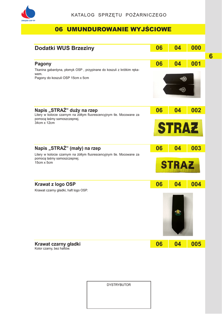 K ATA L OG SPRZĘTU POŻARNICZEGO 06 UMUNDUROWANIE WYJŚCIOWE Dodatki WUS Brzeziny 06 04 000 Pagony 06 04 001 Napis „STRAŻ” duży na rzep 06 04 002 Napis „STRAŻ” (mały) na rzep 06 04 003 06 04 004 06 04 005 Tkanina gabardyna, płomyk OSP , przypinane do koszuli z krótkim rękawem. Pagony do koszuli OSP 15cm x 5cm Litery w kolorze czarnym na żółtym fluorescencyjnym tle. Mocowane za pomocą taśmy samoszczepnej. 34cm x 12cm Litery w kolorze czarnym na żółtym fluorescencyjnym tle. Mocowane za pomocą taśmy samoszczepnej. 15cm x 5cm Krawat z logo OSP Krawat czarny gładki, haft logo OSP. Krawat czarny gładki Kolor czarny, bez haftów. DYSTRYBUTOR