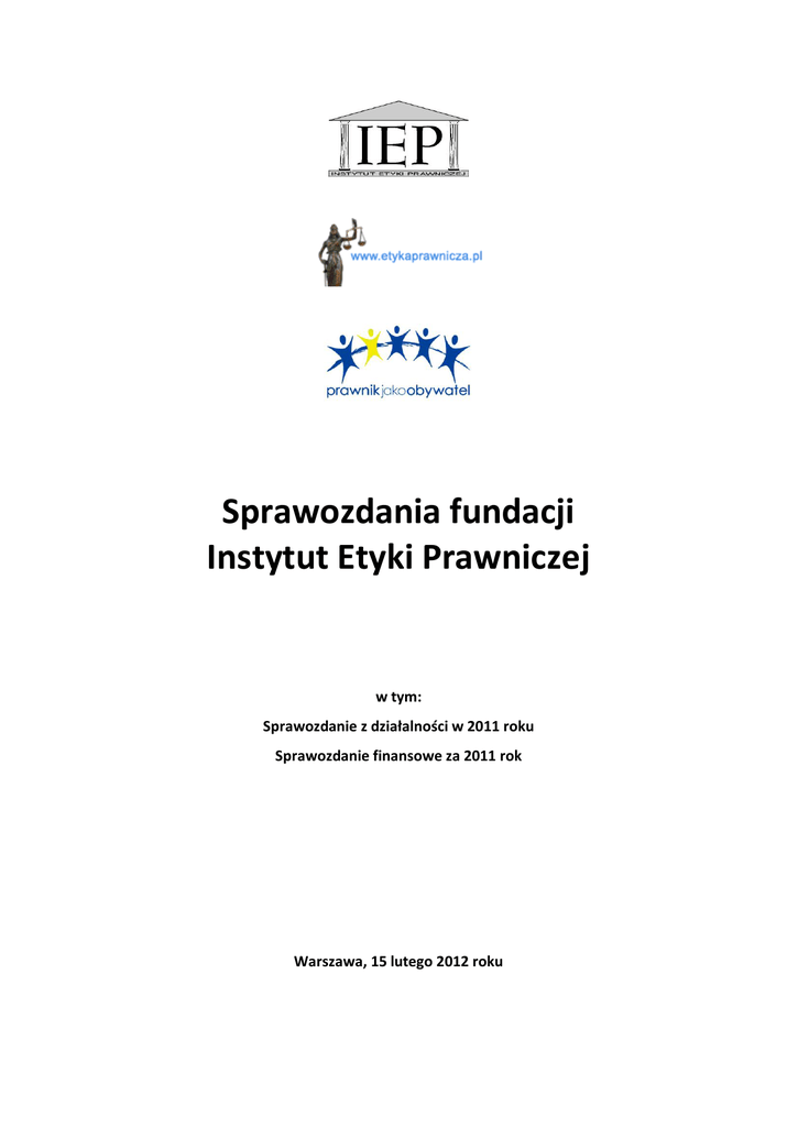 Sprawozdania fundacji Instytut Etyki Prawniczej w tym: Sprawozdanie z działalności w 2011 roku Sprawozdanie finansowe za 2011 rok Warszawa, 15 lutego 2012 roku SPRAWOZDANIE Z DZIAŁALNOŚCI FUNDACJI INSTYTUT ETYKI PRAWNICZEJ ZA ROK 2011 Niniejsze sprawozdanie z działalność zostało sporządzone w wykonaniu obowiązku wynikającego z art. 12 ust. 2 ustawy z dnia 6 kwietnia 1984 r. o fundacjach (t.j. Dz. U. 1991 r. Nr 46 poz. 203 z późn. zm.) zgodnie z układem wskazanym w § 2 rozporządzenia Ministra Sprawiedliwości z dnia 8 maja 2001 r. w sprawie ramowego zakresu sprawozdania z działalności fundacji (Dz. U. Nr 137, poz. 1539). 1. NAZWA, SIEDZIBA I ADRES (ADRES DO KORESPONDENCJI) Fundacja Instytut Etyki Prawniczej z siedzibą w Warszawie, przy ul. Szwankowskiego 4A lok. 27, 01-318 Warszawa (zwana dalej „Instytut”). Adres do korespondencji jak powyżej. Adresy poczty elektronicznej: [email protected] [email protected] 2. SĄD REJESTROWY, DATA WPISU, NUMER W REJESTRZE, NUMER NIP ORAZ STATYSTYCZNY NUMER IDENTYFIKACYJNY W SYSTEMIE REGON Sąd rejestrowy: Sąd Rejonowy dla m.st. Warszawy w Warszawie, XIII Wydział Gospodarczy KRS; Data wpisu: 26.10.2006; Numer KRS: 0000266503; Numer NIP: 522-28-32-703; Numer REGON: 140759860. 3. DANE DOTYCZĄCE CZŁONKÓW ZARZĄDU Paweł Skuczyński – Prezes Zarządu, Michał Boryczka – Członek Zarządu. 4. OKREŚLENIE CELÓW STATUTOWYCH Do celów statutowych Instytutu należy: 1. inicjowanie i prowadzenie badań w zakresie etyki prawniczej i etyki zawodów prawniczych, wykonywania praktyki prawniczej oraz ogólnej refleksji nad prawem i jego stosowaniem, 2. upowszechnianie wyników badań w zakresie, o którym mowa powyżej, 3. wspieranie wszelkich inicjatyw mających na celu zwiększenie świadomości prawnej w społeczeństwie, 4. szerzenie kultury prawnej, przyczynianie się do kształtowania postaw służących godności zawodów prawniczych oraz kreowanie w świadomości społecznej pozytywnego wizerunku prawnika, 5. działanie na rzecz reformy modelu praktyki prawniczej oraz zawodów prawniczych, w szczególności w zakresie dostosowywania ich do standardów europejskich, 6. rozwijanie wewnętrznej integracji środowiska prawniczego oraz środowiska prawniczego ze społeczeństwem, w szczególności między starszymi a młodszymi pokoleniami prawników. 5. ZASADY, FORMY I ZAKRES DZIAŁALNOŚCI STATUTOWEJ Z PODANIEM REALIZACJI CELÓW STATUTOWYCH, W TYM NAJWAŻNIEJSZE INFORMACJE O DZIAŁALNOŚCI POŻYTKU PUBLICZNEGO, A TAKŻE OPIS GŁÓWNYCH ZDARZEŃ PRAWNYCH W JEJ DZIAŁALNOŚCI O SKUTKACH FINANSOWYCH Instytut w 2011 roku realizował zarówno projekty stałe (redagowanie serwisu internetowego etyki prawniczej i zawodów prawniczych www.etykaprawnicza.pl, edycja książkowej serii wydawniczej Biblioteka Etyki Prawniczej), jak i prowadził bieżącą działalność (organizacja i udział w konferencjach, wsparcie projektów Studenckiego Stowarzyszenia Etyki Prawniczej). Wszystkie działania Instytutu w 2011 roku odbywały się w ramach projektu Prawnik jako obywatel, który będzie również kontynuowany w 2012 roku. Instytut podejmował w 2011 roku następujące działania: 1) Redagowanie serwisu internetowego www.etykaprawnicza.pl Wortal www.etykaprawnicza.pl został uruchomiony na początku czerwca 2007 roku. W 2011 kontynuował on swoją działalność poprzez codzienne aktualizacje. W 2011roku w skład redakcji wchodziły 4 osoby. Na wortal składają się przygotowywane przez jego redakcję następujące informacje: bieżące wiadomości z zakresu debaty publicznej dotyczącej zawodów prawniczych i etyki prawniczej obejmujące między innymi wypowiedzi organów władzy publicznej, samorządów i stowarzyszeń zawodowych oraz osób aktywnych w środowisku prawniczym, projekty i teksty aktów normatywnych oraz uchwały dotyczące problematyki zawodów prawniczych i wymiaru sprawiedliwości, zapowiedzi i sprawozdania z konferencji i seminariów dotyczących problematyki wortalu, w których uczestniczyły osoby związane z Instytutem, recenzje sporządzane zgodnie z wytycznymi Annotated Bibliography dla Cornell University Library. Od momentu powstania można obserwować pozytywne tendencje w zakresie popularności wortalu, co przejawia się nie tylko we wzroście liczby odwiedzin, lecz także we wzroście liczby stałych gości serwisu oraz średnim czasie spędzonym na jego stronach. W 2011 r. wydany został również raport za 2010 r. zatytułowany „Sądownictwo i zawody prawnicze w debacie publicznej” przygotowany przez redakcję wortalu. 2) Edycja serii wydawniczej Biblioteka Etyki Prawniczej Seria wydawnicza Biblioteka Etyki Prawniczej jest z założenia otwarta na wszelkie pozycje z zakresu problematyki etyki prawniczej i zawodów prawniczych. Po rozmowach z kilkoma wydawnictwami ostatecznie partnerem Instytutu w tym zakresie zostało Wydawnictwo LexisNexis Sp. z o.o. Pierwszą pozycję w serii stanowi praca zbiorowa „Etyka prawnicza – stanowiska i perspektywy” pod redakcją naukową Huberta Izdebskiego i Pawła Skuczyńskiego, która ukazała się w 2008 roku. Publikacja została dofinansowana przez Wydział Prawa i Administracji Uniwersytetu Warszawskiego oraz Fundację Uniwersytetu Warszawskiego. Drugą pozycję serii stanowi „Etyka sytuacyjna prawnika” autorstwa Marcina Pieniążka, która ukazała się w 2008 roku, będąca skróconą wersją obronionej na Uniwersytecie Jagiellońskim pracy doktorskiej. Publikacja została dofinansowana przez Instytut. Trzecią pozycję serii stanowi „Etyka w administracji publicznej” autorstwa Iwony Boguckiej i Tomasza Pietrzykowskiego, która ukazała się w 2009 roku. Publikacja została dofinansowana przez Instytut. Czwartą pozycję serii stanowi „Status etyki prawniczej” autorstwa Pawła Skuczyńskiego, która ukazała się w 2010 roku, będąca redakcyjnie poprawioną wersją rozprawy doktorskiej „Filozoficzny i metodologiczny status etyki prawniczej” obroni
