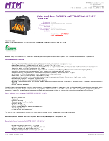 MTM Dariusz Seferyński ul. Młodnicka 52 C 04-239 Warszawa +48 22 353-11-11, 353-22-22, fax. 879-83-83 Wkład kominkowy TARNAVA MAESTRO NOWA LUX 19 kW "panorama" Producent: Zastosowanie: Wysyłka / termin realizacji: Rodzaj urządzenia: Rodzaj paliwa / zasilanie: Tarnava Dom,Firma,Mieszkanie,Pracownia 24h Wkład kominkowy Brykiet drzewny,Drewno Cena brutto: 5 279,78 PLN Cena promocyjna NOWOŚĆ 2014 MAESTRO NOWA LUX IMAGE 19 kW - monolityczny wkład kominkowy o mocy grzewczej 19 kW. Kominki firmy Tarnava posiadają wiele cech, które dają klientowi gwarancję trwałości wyrobu oraz komfort i bezpieczeństwo użytkowania. Zalety kominków Tarnava żeliwny wkład kominkowy został odlany jako jeden monolityczny element bez spawów i śrub wkłady wykonane są z żeliwa najwyższej jakości o grubości od 8 do 18 mm drzwiczki dobierane są indywidualnie i ręcznie szlifowane, co zapewnia absolutną hermetyczność i wyklucza konieczność stosowania uszczelek (poza korpusem Professional Max 15kw) zastosowanie nowatorskich technologii doprowadzania powietrza gwarantuje wysoką sprawność i ekonomiczną eksploatację specjalna kurtyna powietrzna zabezpiecza przed osadzaniem się sadzy na szybie kominka deflektor żeliwny kieruje spaliny w centralną część kominka, gdzie ma miejsce dopalanie się gazu praktyczny ogranicznik zabezpiecza przed wypadaniem drewna z paleniska bezpieczny i solidny rygiel szczelnie zamyka drzwi kasety wewnętrzne i zewnętrzne żebra o dużej powierzchni wymiany ciepła zapobiegają ulatnianiu się ciepła przez komin wysoka moc grzewcza i sprawność nawet do 80% pełna kontrola dopływu powietrza do komory spalania Kominki Tarnava mogą służyć jako jedyne źródło ciepła do ogrzewania domków działkowych i jednorodzinnych o powierzchni nie większej niż 280 m2 10 Lat pisemnej gwarancji Firma TARNAVA, będąca liderem produkcji monolitycznych wkładów kominkowych, stworzyła wkład kominkowy MAESTRO posiadający wszystkie zalety: nowatorskie rozwiązania, dużą moc i sprawność, niespotykany radiator na całej powierzchni oraz bardzo ładną fasadę bez wystających regulatorów powietrza i popielnika Wkład idealnie nadaje się do nowoczesnej zabudowy, stając się estetycznym uzupełnieniem wnętrz mieszkalnych. Cechy wkładu kominkowego MAESTRO NOWA LUX 19 kW: Kurtyna powietrzna Popielnik Żeliwny deflektor Czopuch z wymiennikiem ciepła Szeroka fasada System czystej szyby Płynna regulacja dolotu powietrza do paleniska Konstrukcja żeliwna Unikalna tylna ścianka korpusu* * na zewnętrznej części znajdują się pionowe użebrowania tworząc bardzo dużą powierzchnię wymiany ciepła Zalecane paliwo: drewno liściaste, brykiet. Możliwość palenia polan o długości 0,5m. Dane techniczne kominka MAESTRO NOWA LUX 19 kW Wydajność cieplna (min.-max.): 12-19 kW Wymiar całkowity (szer./wys./gł.): 685/645/510 mm Wymiar fasady (szer./wys.): 645/500 mm Podłączenie do przewodu kominowego: 160 mm http://www.firmamtm.pl Program AptusShop6 MTM Dariusz Seferyński ul. Młodnicka 52 C 04-239 Warszawa +48 22 353-11-11, 353-22-22, fax. 879-83-83 Możliwość zastosowania stojaka Tarnava, umożliwiającego doprowadzenie powietrza do spalania w 100% z zewnątrz Rodzaj szyby: płaska Drzwi NOWA LUX to najpopularniejszy wkład w sezonie 2014/2015 z płaską szybą. Gwarancja 10 lat http://www.firmamtm.pl Powered by TCPDF (www.tcpdf.org) Program AptusShop6