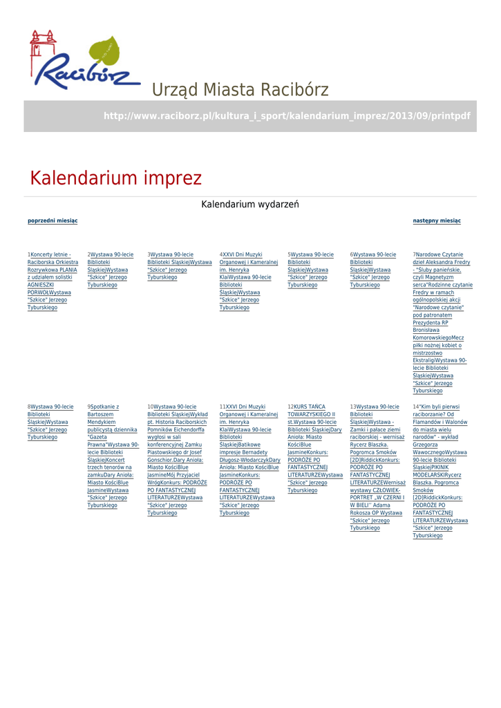 Urząd Miasta Racibórz http://www.raciborz.pl/kultura_i_sport/kalendarium_imprez/2013/09/printpdf Kalendarium imprez Kalendarium wydarzeń poprzedni miesiąc Wrzesień 2013 następny miesiąc Nd Pn Wt Śr Cz Pt So 1Koncerty letnie Raciborska Orkiestra Rozrywkowa PLANIA z udziałem solistki AGNIESZKI PORWOŁWystawa "Szkice" Jerzego Tyburskiego 2Wystawa 90-lecie Biblioteki ŚląskiejWystawa "Szkice" Jerzego Tyburskiego 3Wystawa 90-lecie Biblioteki ŚląskiejWystawa "Szkice" Jerzego Tyburskiego 4XXVI Dni Muzyki Organowej i Kameralnej im. Henryka KlaiWystawa 90-lecie Biblioteki ŚląskiejWystawa "Szkice" Jerzego Tyburskiego 5Wystawa 90-lecie Biblioteki ŚląskiejWystawa "Szkice" Jerzego Tyburskiego 6Wystawa 90-lecie Biblioteki ŚląskiejWystawa "Szkice" Jerzego Tyburskiego 7Narodowe Czytanie dzieł Aleksandra Fredry - "Śluby panieńskie, czyli Magnetyzm serca"Rodzinne czytanie Fredry w ramach ogólnopolskiej akcji "Narodowe czytanie" pod patronatem Prezydenta RP Bronisława KomorowskiegoMecz piłki nożnej kobiet o mistrzostwo EkstraligiWystawa 90lecie Biblioteki ŚląskiejWystawa "Szkice" Jerzego Tyburskiego 8Wystawa 90-lecie Biblioteki ŚląskiejWystawa "Szkice" Jerzego Tyburskiego 9Spotkanie z Bartoszem Mendykiem publicystą dziennika "Gazeta Prawna"Wystawa 90lecie Biblioteki ŚląskiejKoncert trzech tenorów na zamkuDary Anioła: Miasto KościBlue JasmineWystawa "Szkice" Jerzego Tyburskiego 10Wystawa 90-lecie Biblioteki ŚląskiejWykład pt. Historia Raciborskich Pomników Eichendorffa wygłosi w sali konferencyjnej Zamku Piastowskiego dr Josef Gonschior.Dary Anioła: Miasto KościBlue JasmineMój Przyjaciel WrógKonkurs: PODRÓŻE PO FANTASTYCZNEJ LITERATURZEWystawa "Szkice" Jerzego Tyburskiego 11XXVI Dni Muzyki Organowej i Kameralnej im. Henryka KlaiWystawa 90-lecie Biblioteki ŚląskiejBatikowe impresje Bernadety Długosz-WłodarczykDary Anioła: Miasto KościBlue JasmineKonkurs: PODRÓŻE PO FANTASTYCZNEJ LITERATURZEWystawa "Szkice" Jerzego Tyburskiego 12KURS TAŃCA TOWARZYSKIEGO II st.Wystawa 90-lecie Biblioteki ŚląskiejDary Anioła: Miasto KościBlue JasmineKonkurs: PODRÓŻE PO FANTASTYCZNEJ LITERATURZEWystawa "Szkice" Jerzego Tyburskiego 13Wystawa 90-lecie Biblioteki ŚląskiejWystawa Zamki i pałace ziemi raciborskiej - wernisaż Rycerz Blaszka. Pogromca Smoków [2D]RiddickKonkurs: PODRÓŻE PO FANTASTYCZNEJ LITERATURZEWernisaż wystawy CZŁOWIEKPORTRET „W CZERNI I W BIELI’’ Adama Rokosza OP Wystawa "Szkice" Jerzego Tyburskiego 14"Kim byli pierwsi raciborzanie? Od Flamandów i Walonów do miasta wielu narodów" - wykład Grzegorza WawocznegoWystawa 90-lecie Biblioteki ŚląskiejPIKINIK MODELARSKIRycerz Blaszka. Pogromca Smoków [2D]RiddickKonkurs: PODRÓŻE PO FANTASTYCZNEJ LITERATURZEWystawa "Szkice" Jerzego Tyburskiego 15Wystawa 90-lecie Biblioteki ŚląskiejRycerz Blaszka. Pogromca Smoków [2D]RiddickKonkurs: PODRÓŻE PO FANTASTYCZNEJ LITERATURZETurniej Tenisa ZiemnegoWystawa "Szkice" Jerzego Tyburskiego 16Wystawa 90-lecie Biblioteki ŚląskiejII KONGRES OBYWATEL SENIORRycerz Blaszka. Pogromca Smoków [2D]RiddickKonkurs: PODRÓŻE PO FANTASTYCZNEJ LITERATURZEPodróże po fantastycznej literaturze - konkurs plastycznyWystawa "Szkice" Jerzego Tyburskiego 17KURS TAŃCA TOWARZYSKIEGO DLA POCZĄTKUJĄCYCHCarving, czyli sztuka rzeźbienia w owocach i warzywach pokaz Mistrza Polski 2012 Dominika BajeraKURS TAŃCA TOWARZYSKIEGO III st.Wystawa 90-lecie Biblioteki ŚląskiejRycerz Blaszka. Pogromca Smoków [2D]RiddickFrances HaKonkurs: PODRÓŻE PO FANTASTYCZNEJ LITERATURZEPodróże po fantastycznej literaturze konkurs plastycznyWystawa "Szkice" Jerzego Tyburskiego 18XXVI Dni Muzyki Organowej i Kameralnej im. Henryka KlaiWystawa 90-lecie Biblioteki ŚląskiejRycerz Blaszka. Pogromca Smoków [2D]RiddickKonkurs: PODRÓŻE PO FANTASTYCZNEJ LITERATURZEPodróże po fantastycznej literaturze - konkurs plastycznyWystawa "Szkice" Jerzego Tyburskiego 19Turniej Wiedzy o Ruchu DrogowymWystawa 90-lecie Biblioteki ŚląskiejRycerz Blaszka. Pogromca Smoków [2D]RiddickKonkurs: PODRÓŻE PO FANTASTYCZNEJ LITERATURZEPodróże po fantastycznej literaturze - konkurs plastycznyWystawa "Szkice" Jerzego Tyburskiego 20"FORMA II" wernisaż wystawy fotografii grupy FOTONKonkurs: PODRÓŻE PO FANTASTYCZNEJ LITERATURZEPodróże po fantastycznej literaturze - konkurs plastycznyWystawa "Szkice" Jerzego Tyburskiego 21DOŻYNKI MIEJSKIE Stara Wieś i MiedoniaKonkurs: PODRÓŻE PO FANTASTYCZNEJ LITERATURZEKoncert zespołu ZAKOPOWERFestiwal Nauki EDUSCIENCEVII zbiórka zużytego sprzętu elektrycznego i elektronicznegoPodróże po fantastycznej literaturze - konkurs plastycznyWystawa "Szkice" Jerzego Tyburskiego 22DOŻYNKI MIEJSKIE Stara Wieś i MiedoniaKonkurs: PODRÓŻE PO FANTASTYCZNEJ LITERATURZEKoncert Orkiestry Dętej Zaspołu Szkół Budowlanych w Zielonej Górze.Podróże po fantastycznej literaturze - konkurs plastycznyWystawa "Szkice" Jerzego Tyburskiego 23Konkurs: PODRÓŻE PO FANTASTYCZNEJ LITERATURZEPodróże po fantastycznej literaturze - konkurs plastycznyWystawa "Szkice" Jerzego Tyburskiego 24Konkurs: PODRÓŻE PO FANTASTYCZNEJ LITERATURZEPodróże po fantastycznej literaturze konkurs plastycznyWystawa "Szkice" Jerzego Tyburskiego 25XXVI Dni Muzyki Organowej i Kameralnej im. Henryka KlaiKonkurs: PODRÓŻE PO FANTASTYCZNEJ LITERATURZESpotkanie TYCH KSIĄŻEK NIE WOLNO CZYTAĆ organizowane w ramach akcji Tydzień Zakazanych KsiążekPodróże po fantastycznej literaturze - konkurs plastycznyWystawa "Szkice" Jerzego Tyburskiego 26Konkurs: PODRÓŻE PO FANTASTYCZNEJ LITERATURZEPodróże po fantastycznej literaturze - konkurs plastycznyWystawa "Szkice" Jerzego Tyburskiego 27Konkurs: PODRÓŻE PO FANTASTYCZNEJ LITERATURZEPodróże po fantastycznej literaturze - konkurs plastycznyWystawa "Szkice" Jerzego Tyburskiego 28WARSZTATY KALIGRAFICZNEKonkurs: PODRÓŻE PO FANTASTYCZNEJ LITERATURZEPodróże po fantastycznej literaturze - konkurs plastycznyWystawa "Szkice" Jerzego Tyburskiego 29XXVI Dni Muzyki