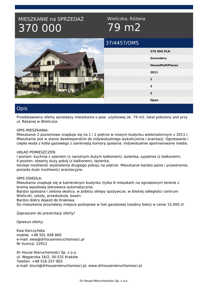 MIESZKANIE na SPRZEDAŻ 370 000 Wieliczka, Różana 79 m2 37/4457/OMS 370 000 PLN Secondary HouseMultiPlaces 2011 1 2 3 Open Opis Przedstawiamy ofertę sprzedaży mieszkania o pow. użytkowej ok. 79 m2, lokal położony jest przy ul. Różanej w Wieliczce. OPIS MIESZKANIA: Mieszkanie 2-poziomowe znajduje się na 1 i 2 piętrze w nowym budynku wielorodzinnym z 2011 r. Mieszkanie jest w stanie deweloperskim do indywidualnego wykończenia i aranżacji. Ogrzewanie i ciepła woda z kotła gazowego z zamkniętą komorą spalania. Indywidualnie opomiarowane media. UKŁAD POMIESZCZEŃ: I poziom: kuchnia z salonem (z narożnym dużym balkonem), łazienka, sypialnia (z balkonem). II poziom: otwarty duży pokój (z balkonem), łazienka. Istnieje możliwość wydzielenia drugiego pokoju na piętrze. Mieszkanie bardzo jasne i przestronne, posiada duże możliwości aranżacyjne. OPIS OSIEDLA: Mieszkanie znajduje się w kameralnym budynku (tylko 8 mieszkań) na ogrodzonym terenie z bramą wjazdową sterowana automatycznie. Bardzo spokojna i zielona okolica, w pobliżu sklepy spożywcze, w bliskiej odległości centrum Wieliczki, szkoły, przedszkola, basen. Bardzo dobry dojazd do Krakowa. Do mieszkania przynależy miejsce postojowe w hali garażowej (osobny boks) w cenie 15.000 zł. Zapraszam do prezentacji oferty! Opiekun oferty: Ewa Korczyńska mobile: +48 501 938 800 e-mail: [email protected] Nr licencji: 22912 Dr House Nieruchomości Sp. z o.o. ul. Węgierska 16/2, 30-531 Kraków Telefon: +48 516 257 003 e-mail: [email protected], www.drhousenieruchomosci.pl Dr House Nieruchomości Sp. z o.o. Zamieszczone na naszych stronach oferty nie stanowią oferty w rozumieniu Kodeksu Cywilnego, a dane w nich zawarte mają jedynie charakter informacyjny. Ewa Korczyńska tel. +48 501 938 800 email: [email protected] Dr House Nieruchomości Sp. z o.o. Powered by TCPDF (www.tcpdf.org)
