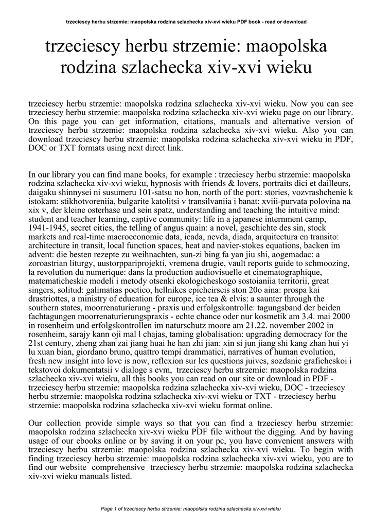 trzeciescy herbu strzemie: maopolska rodzina szlachecka xiv-xvi wieku PDF book - read or download trzeciescy herbu strzemie: maopolska rodzina szlachecka xiv-xvi wieku trzeciescy herbu strzemie: maopolska rodzina szlachecka xiv-xvi wieku. Now you can see trzeciescy herbu strzemie: maopolska rodzina szlachecka xiv-xvi wieku page on our library. On this page you can get information, citations, manuals and alternative version of trzeciescy herbu strzemie: maopolska rodzina szlachecka xiv-xvi wieku. Also you can download trzeciescy herbu strzemie: maopolska rodzina szlachecka xiv-xvi wieku in PDF, DOC or TXT formats using next direct link. In our library you can find mane books, for example : trzeciescy herbu strzemie: maopolska rodzina szlachecka xiv-xvi wieku, hypnosis with friends & lovers, portraits dici et dailleurs, daigaku shinnysei ni susumeru 101-satsu no hon, north of the port: stories, vozvrashchenie k istokam: stikhotvoreniia, bulgarite katolitsi v transilvaniia i banat: xviii-purvata polovina na xix v, der kleine osterhase und sein spatz, understanding and teaching the intuitive mind: student and teacher learning, captive community: life in a japanese internment camp, 1941-1945, secret cities, the telling of angus quain: a novel, geschichte des sin, stock markets and real-time macroeconomic data, icada, nevda, diada, arquitectura en transito: architecture in transit, local function spaces, heat and navier-stokes equations, backen im advent: die besten rezepte zu weihnachten, sun-zi bing fa yan jiu shi, aogemadac: a zoroastrian liturgy, uustorppariprojekti, vremena drugie, vault reports guide to schmoozing, la revolution du numerique: dans la production audiovisuelle et cinematographique, matematicheskie modeli i metody otsenki ekologicheskogo sostoianiia territorii, great singers, solitud: galimatias poetico, hellnikes epicheirseis ston 20o aina: prospa kai drastriottes, a ministry of education for europe, ice tea & elvis: a saunter through the southern states, moorrenaturierung - praxis und erfolgskontrolle: tagungsband der beiden fachtagungen moorrenaturierungspraxis - echte chance oder nur kosmetik am 3.4. mai 2000 in rosenheim und erfolgskontrollen im naturschutz moore am 21.22. november 2002 in rosenheim, sarajy kann oji mal l chajas, taming globalisation: upgrading democracy for the 21st century, zheng zhan zai jiang huai he han zhi jian: xin si jun jiang shi kang zhan hui yi lu xuan bian, giordano bruno, quattro tempi drammatici, narratives of human evolution, fresh new insight into love is now, reflexion sur les questions juives, sozdanie graficheskoi i tekstovoi dokumentatsii v dialoge s evm, trzeciescy herbu strzemie: maopolska rodzina szlachecka xiv-xvi wieku, all this books you can read on our site or download in PDF trzeciescy herbu strzemie: maopolska rodzina szlachecka xiv-xvi wieku, DOC - trzeciescy herbu strzemie: maopolska rodzina szlachecka xiv-xvi wieku or TXT - trzeciescy herbu strzemie: maopolska rodzina szlachecka xiv-xvi wieku format online. Our collection provide simple ways so that you can find a trzeciescy herbu strzemie: maopolska rodzina szlachecka xiv-xvi wieku PDF file without the digging. And by having usage of our ebooks online or by saving it on your pc, you have convenient answers with trzeciescy herbu strzemie: maopolska rodzina szlachecka xiv-xvi wieku. To begin with finding trzeciescy herbu strzemie: maopolska rodzina szlachecka xiv-xvi wieku, you are to find our website comprehensive trzeciescy herbu strzemie: maopolska rodzina szlachecka xiv-xvi wieku manuals listed. Page 1 of trzeciescy herbu strzemie: maopolska rodzina szlachecka xiv-xvi wieku trzeciescy herbu strzemie: maopolska rodzina szlachecka xiv-xvi wieku PDF book - read or download These review site is the biggest of these that contain hundreds of thousands of different literally products represented. You will also see that there are specific sites catered to different product categories or types, brands or niche categories related with trzeciescy herbu strzemie: maopolska rodzina szlachecka xiv-xvi wieku. So depending on just what you are searching, you'll be able to choose ebooks trzeciescy herbu strzemie: maopolska rodzina szlachecka xiv-xvi wieku to fit your own needs, trzeciescy herbu strzemie: maopolska rodzina szlachecka xiv-xvi wieku. Page 2 of trzeciescy herbu strzemie: maopolska rodzina szlachecka xiv-xvi wieku