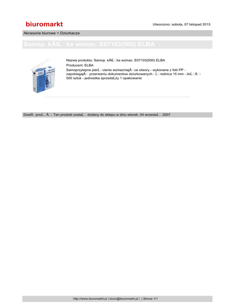 biuromarkt Utworzono: sobota, 07 listopad 2015 Akcesoria biurowe > Dziurkacze Samop. kóŠka wzmac. E07103(500) ELBA Nazwa produktu: Samop. kóŠka wzmac. E07103(500) ELBA Producent: ELBA Samoprzylepne pierĹ cienie wzmacniajÄ ce otwory - wykonane z folii PP zapobiegajÄ przerwaniu dokumentow dziurkowanych - Ĺ rednica 15 mm - iloĹ Ä : 500 sztuk - jednostka sprzedaĹźy 1 opakowanie DostÄ pnoĹ Ä : Ten produkt zostaĹ dodany do sklepu w dniu wtorek, 04 wrzesieĹ http://www.biuromarkt.pl | [email protected] | | Strona 1/1 2007