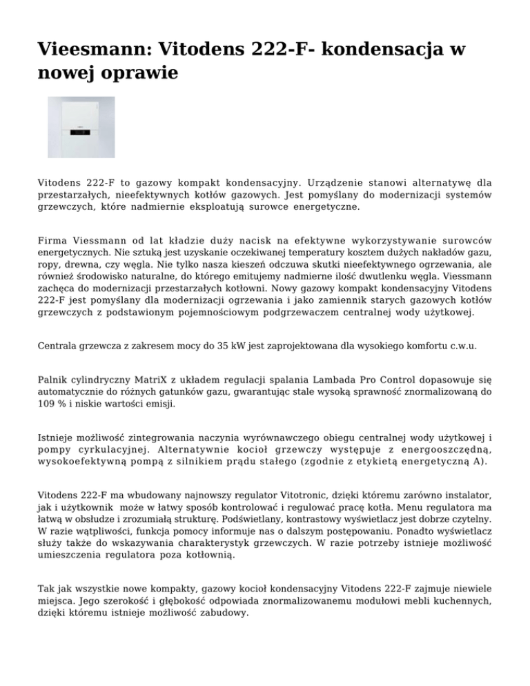 Vieesmann: Vitodens 222-F- kondensacja w nowej oprawie Vitodens 222-F to gazowy kompakt kondensacyjny. Urządzenie stanowi alternatywę dla przestarzałych, nieefektywnych kotłów gazowych. Jest pomyślany do modernizacji systemów grzewczych, które nadmiernie eksploatują surowce energetyczne. Firma Viessmann od lat kładzie duży nacisk na efektywne wykorzystywanie surowców energetycznych. Nie sztuką jest uzyskanie oczekiwanej temperatury kosztem dużych nakładów gazu, ropy, drewna, czy węgla. Nie tylko nasza kieszeń odczuwa skutki nieefektywnego ogrzewania, ale również środowisko naturalne, do którego emitujemy nadmierne ilość dwutlenku węgla. Viessmann zachęca do modernizacji przestarzałych kotłowni. Nowy gazowy kompakt kondensacyjny Vitodens 222-F jest pomyślany dla modernizacji ogrzewania i jako zamiennik starych gazowych kotłów grzewczych z podstawionym pojemnościowym podgrzewaczem centralnej wody użytkowej. Centrala grzewcza z zakresem mocy do 35 kW jest zaprojektowana dla wysokiego komfortu c.w.u. Palnik cylindryczny MatriX z układem regulacji spalania Lambada Pro Control dopasowuje się automatycznie do różnych gatunków gazu, gwarantując stale wysoką sprawność znormalizowaną do 109 % i niskie wartości emisji. Istnieje możliwość zintegrowania naczynia wyrównawczego obiegu centralnej wody użytkowej i pompy cyrkulacyjnej. Alternatywnie kocioł grzewczy występuje z energooszczędną, wysokoefektywną pompą z silnikiem prądu stałego (zgodnie z etykietą energetyczną A). Vitodens 222-F ma wbudowany najnowszy regulator Vitotronic, dzięki któremu zarówno instalator, jak i użytkownik może w łatwy sposób kontrolować i regulować pracę kotła. Menu regulatora ma łatwą w obsłudze i zrozumiałą strukturę. Podświetlany, kontrastowy wyświetlacz jest dobrze czytelny. W razie wątpliwości, funkcja pomocy informuje nas o dalszym postępowaniu. Ponadto wyświetlacz służy także do wskazywania charakterystyk grzewczych. W razie potrzeby istnieje możliwość umieszczenia regulatora poza kotłownią. Tak jak wszystkie nowe kompakty, gazowy kocioł kondensacyjny Vitodens 222-F zajmuje niewiele miejsca. Jego szerokość i głębokość odpowiada znormalizowanemu modułowi mebli kuchennych, dzięki któremu istnieje możliwość zabudowy. Dane Techniczne Vitodens 222-F: ● ● ● ● ● Kompaktowy gazowy kocioł kondensacyjny ze zintegrowanym, ładowanym, emaliowanym zasobnikiem c.w.u. 4,8 do 35 kW Sprawność znormalizowana: 98 % (Hs)/ 109 % (Hi) Pojemność podgrzewacz c.w.u.: 100 litrów do 26kW ; 130 litrów - 35 kW Wskaźnik mocy: NL= 4,8 (35 kW) Wymiary (wysokość x szerokość x głębokość): 1 425 x 600 x 595 mm ( 19,26 kW) 1 625 x 600 x 595 mm ( 35 kW) Ciężar: 125 kg z zasobnikiem ładowanym 100 litrów (do 26 kW) 133 kg z zasobnikiem ładowanym 130 litrów (35 kW) ❍ ❍ ● ❍ ❍ ❍ ❍ KONTAKT Viessmann Sp. z o.o. E-mail: [email protected] WWW: www.viessmann.pl Tel: +48 71 360 71 00 Fax: +48 71 360 71 01 Adres: Karkonoska 65 53-015 Wrocław