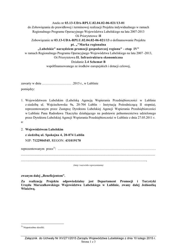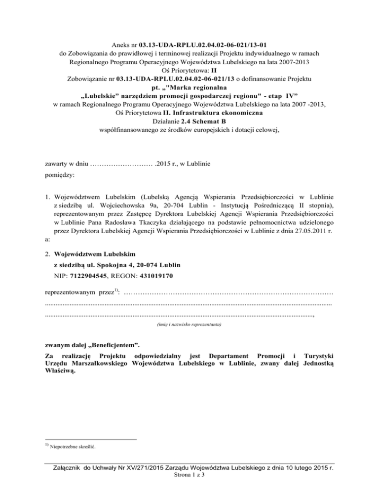 Aneks nr 03.13-UDA-RPLU.02.04.02-06-021/13-01 do Zobowiązania do prawidłowej i terminowej realizacji Projektu indywidualnego w ramach Regionalnego Programu Operacyjnego Województwa Lubelskiego na lata 2007-2013 Oś Priorytetowa: II Zobowiązanie nr 03.13-UDA-RPLU.02.04.02-06-021/13 o dofinansowanie Projektu pt. „"Marka regionalna „Lubelskie” narzędziem promocji gospodarczej regionu" - etap IV” w ramach Regionalnego Programu Operacyjnego Województwa Lubelskiego na lata 2007 -2013, Oś Priorytetowa II. Infrastruktura ekonomiczna Działanie 2.4 Schemat B współfinansowanego ze środków europejskich i dotacji celowej, zawarty w dniu ……………………… .2015 r., w Lublinie pomiędzy: 1. Województwem Lubelskim (Lubelską Agencją Wspierania Przedsiębiorczości w Lublinie z siedzibą ul. Wojciechowska 9a, 20-704 Lublin - Instytucją Pośredniczącą II stopnia), reprezentowanym przez Zastępcę Dyrektora Lubelskiej Agencji Wspierania Przedsiębiorczości w Lublinie Pana Radosława Tkaczyka działającego na podstawie pełnomocnictwa udzielonego przez Dyrektora Lubelskiej Agencji Wspierania Przedsiębiorczości w Lublinie z dnia 27.05.2011 r. a: 2. Województwem Lubelskim z siedzibą ul. Spokojna 4, 20-074 Lublin NIP: 7122904545, REGON: 431019170 reprezentowanym przez1): ……………………………………………………………………………… .................................................................................................................................................................... ........................................................................................................................................................., (imię i nazwisko reprezentanta) zwanym dalej „Beneficjentem”. Za realizację Projektu odpowiedzialny jest Departament Promocji i Turystyki Urzędu Marszałkowskiego Województwa Lubelskiego w Lublinie, zwany dalej Jednostką Właściwą. 1) Niepotrzebne skreślić. Załącznik do Uchwały Nr XV/271/2015 Zarządu Województwa Lubelskiego z dnia 10 lutego 2015 r. Strona 1 z 3 §1 1. W Zobowiązaniu do prawidłowej i terminowej realizacji Projektu indywidualnego nr: 03.13-UDARPLU.02.04.02-06-021/13 wprowadza się następujące zmiany: 1) w § 2 ust. 7 otrzymuje następujące brzmienie: „ 7. Strony oświadczają, że w ramach dofinansowania występuje pomoc publiczna w wysokości 0,00 PLN (słownie 0 złotych 0/100). Kwota dofinansowania będzie przekazywana zgodnie z zasadami określonymi w niniejszej Umowie oraz w szczególności zgodnie z zasadami Programu, Uszczegółowienia Programu i odpowiedniego rozporządzenia ministra właściwego do spraw rozwoju regionalnego w sprawie udzielania pomocy publicznej. Zgodnie z § 5 ust. 2 pkt 2 i ust. 3 Rozporządzenia Ministra Rozwoju Regionalnego z dnia 8 grudnia 2010 r. w sprawie udzielania pomocy de minimis w ramach regionalnych programów operacyjnych, Beneficjent może udzielać pomocy de minimis przedsiębiorcy, na przedsięwzięcie realizowane w ramach Projektu. ” 2) w § 2 ust. 9 otrzymuje następujące brzmienie: „9. Okres kwalifikowalności wydatków dla Projektu rozpoczyna się w dniu 1 stycznia 2007r. i kończy się w dniu 30 czerwca 2015r. z zastrzeżeniem, że wydatki na prace przygotowawcze kwalifikowane są od dnia 1 stycznia 2007 r. oraz wydatki na zakup nieruchomości gruntowej niezabudowanej, zabudowanej, budynkowej lub lokalowej kwalifikowane są w okresie 12 miesięcy przed dniem złożenia wniosku o dofinansowanie.” 3) w § 3 ust. 1 otrzymuje następujące brzmienie: „1. Okres realizacji Projektu ustala się na: 1) rozpoczęcie realizacji: 2014-02-03, 2) zakończenie rzeczowe realizacji1:2015-05-31, 3) zakończenie finansowe realizacji: 2015-06-30.” 4) w § 17 ust. 2 zmianie ulega dotychczasowa treść załącznika nr II, który otrzymuje brzmienie określone w załączniku nr 1 do niniejszego Aneksu. §2 Wszystkie pozostałe warunki Zobowiązania do prawidłowej i terminowej realizacji Projektu indywidualnego pozostają niezmienione. §3 Aneks sporządzono w czterech jednobrzmiących egzemplarzach, z czego trzy egzemplarze otrzymuje Instytucja Pośrednicząca II stopnia, a jeden egzemplarz otrzymuje Beneficjent. §4 Niniejszy Aneks wchodzi w życie z dniem podpisania. Załącznik do Uchwały Nr XV/271/2015 Zarządu Województwa Lubelskiego z dnia 10 lutego 2015 r. Strona 2 z 3 INSTYTUCJA POŚREDNICZĄCA II ……………………………………. (czytelny podpis, pieczęć) BENEFICJENT …………………………………… (czytelny podpis, pieczęć) Załączniki: Zał. nr 1 - Aktualny harmonogram rzeczowo-finansowy Załącznik do Uchwały Nr XV/271/2015 Zarządu Województwa Lubelskiego z dnia 10 lutego 2015 r. Strona 3 z 3