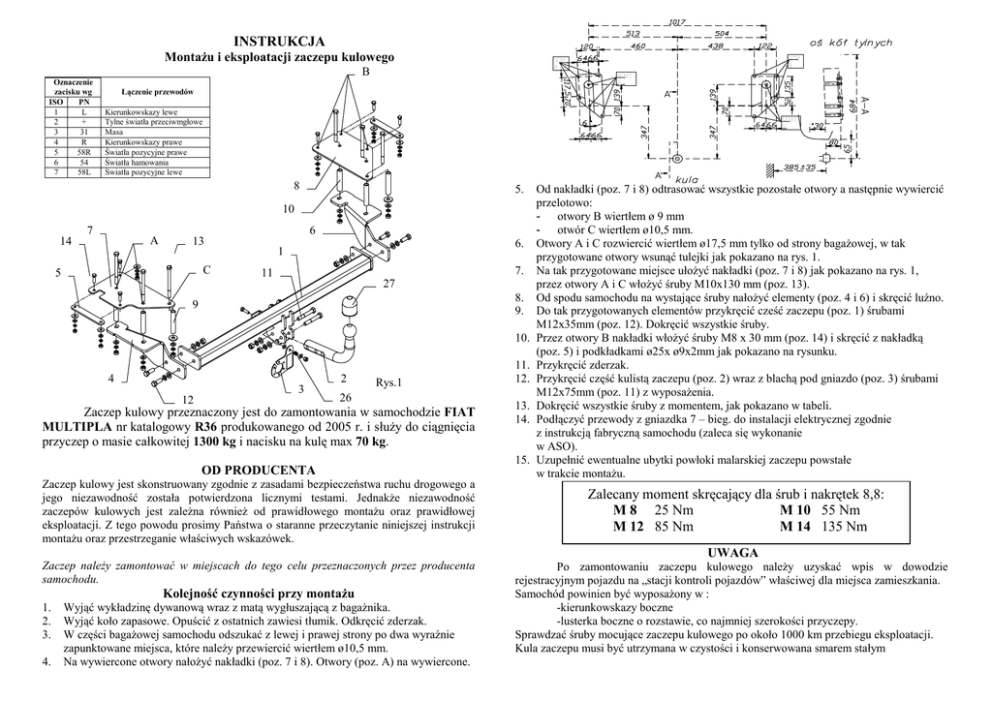 INSTRUKCJA MontaŜu i eksploatacji zaczepu kulowego Oznaczenie zacisku wg ISO PN 1 L 2 + 3 31 4 R 5 58R 6 54 7 58L N°M 8 N°M 8 B N°M1 0 Łączenie przewodów Kierunkowskazy lewe Tylne światła przeciwmgłowe Masa Kierunkowskazy prawe Światła pozycyjne prawe Światła hamowania Światła pozycyjne lewe N°M1 0 8 5. 10 7 A 14 6 13 6. 1 C 5 7. 11 27 8. 9. 9 10. 4 2 3 12 Rys.1 26 Zaczep kulowy przeznaczony jest do zamontowania w samochodzie FIAT MULTIPLA nr katalogowy R36 produkowanego od 2005 r. i słuŜy do ciągnięcia przyczep o masie całkowitej 1300 kg i nacisku na kulę max 70 kg. OD PRODUCENTA Zaczep kulowy jest skonstruowany zgodnie z zasadami bezpieczeństwa ruchu drogowego a jego niezawodność została potwierdzona licznymi testami. JednakŜe niezawodność zaczepów kulowych jest zaleŜna równieŜ od prawidłowego montaŜu oraz prawidłowej eksploatacji. Z tego powodu prosimy Państwa o staranne przeczytanie niniejszej instrukcji montaŜu oraz przestrzeganie właściwych wskazówek. 11. 12. 13. 14. 15. Od nakładki (poz. 7 i 8) odtrasować wszystkie pozostałe otwory a następnie wywiercić przelotowo: - otwory B wiertłem ø 9 mm - otwór C wiertłem ø10,5 mm. Otwory A i C rozwiercić wiertłem ø17,5 mm tylko od strony bagaŜowej, w tak przygotowane otwory wsunąć tulejki jak pokazano na rys. 1. Na tak przygotowane miejsce ułoŜyć nakładki (poz. 7 i 8) jak pokazano na rys. 1, przez otwory A i C włoŜyć śruby M10x130 mm (poz. 13). Od spodu samochodu na wystające śruby nałoŜyć elementy (poz. 4 i 6) i skręcić luźno. Do tak przygotowanych elementów przykręcić cześć zaczepu (poz. 1) śrubami M12x35mm (poz. 12). Dokręcić wszystkie śruby. Przez otwory B nakładki włoŜyć śruby M8 x 30 mm (poz. 14) i skręcić z nakładką (poz. 5) i podkładkami ø25x ø9x2mm jak pokazano na rysunku. Przykręcić zderzak. Przykręcić część kulistą zaczepu (poz. 2) wraz z blachą pod gniazdo (poz. 3) śrubami M12x75mm (poz. 11) z wyposaŜenia. Dokręcić wszystkie śruby z momentem, jak pokazano w tabeli. Podłączyć przewody z gniazdka 7 – bieg. do instalacji elektrycznej zgodnie z instrukcją fabryczną samochodu (zaleca się wykonanie w ASO). Uzupełnić ewentualne ubytki powłoki malarskiej zaczepu powstałe w trakcie montaŜu. Zalecany moment skręcający dla śrub i nakrętek 8,8: M 8 25 Nm M 10 55 Nm M 12 85 Nm M 14 135 Nm UWAGA Zaczep naleŜy zamontować w miejscach do tego celu przeznaczonych przez producenta samochodu. Kolejność czynności przy montaŜu 1. 2. 3. 4. Wyjąć wykładzinę dywanową wraz z matą wygłuszającą z bagaŜnika. Wyjąć koło zapasowe. Opuścić z ostatnich zawiesi tłumik. Odkręcić zderzak. W części bagaŜowej samochodu odszukać z lewej i prawej strony po dwa wyraźnie zapunktowane miejsca, które naleŜy przewiercić wiertłem ø10,5 mm. Na wywiercone otwory nałoŜyć nakładki (poz. 7 i 8). Otwory (poz. A) na wywiercone. Po zamontowaniu zaczepu kulowego naleŜy uzyskać wpis w dowodzie rejestracyjnym pojazdu na „stacji kontroli pojazdów” właściwej dla miejsca zamieszkania. Samochód powinien być wyposaŜony w : -kierunkowskazy boczne -lusterka boczne o rozstawie, co najmniej szerokości przyczepy. Sprawdzać śruby mocujące zaczepu kulowego po około 1000 km przebiegu eksploatacji. Kula zaczepu musi być utrzymana w czystości i konserwowana smarem stałym PPUH AUTO-HAK s.j. WyposaŜenie zaczepu: Produkcja Haków Holowniczych Henryk & Zbigniew Nejman 76-200 SŁUPSK ul. Słoneczna 16K tel/fax (059) 8-414-414; 8-414-413 E-mail: [email protected] www. autohak.com.pl Zaczep kulowy bez wyposaŜenia elektrycznego R36 Klasa: A50-X Nr kat. Przeznaczony do zamontowania w samochodzie: Producent: FIAT Model: MULTIPLA produkowanego od 2005 r. Dane techniczne: Wartość siły D: 7,8 kN maksymalna masa przyczepy: 1300 kg maksymalny nacisk na kulę: 70 kg Numer homologacji zgodnie z wytycznymi regulaminu EKG/ONZ 55.01: E20-55R-01 1767 KARTA GWARANCYJNA Producent udziela gwarancji niniejszą kartą gwarancyjną na okres 24 miesięcy licząc od dnia zakupu zaczepu kulowego do samochodu: FIAT MULTIPLA INFORMACJA WSTĘPNA produkowanego od 2005 r. Zaczep kulowy jest skonstruowany zgodnie z zasadami bezpieczeństwa ruchu drogowego. Zaczep kulowy jest elementem wpływającym na bezpieczeństwo jazdy i moŜe zostać zainstalowany wyłącznie przez personel wyspecjalizowany. Niedopuszczalne jest dokonywanie jakichkolwiek zmian w konstrukcji zaczepu. Powoduje to wygaśniecie dopuszczenia do stosowania. W przypadku obecności masy izolacyjnej lub osłony podwozia w miejscu przylegania zaczepu, naleŜy ją usunąć. Nieosłonięte miejsca karoserii oraz wywiercone otwory naleŜy pomalować farbą antykorozyjną. Informacjami wiąŜącymi odnośnie wartości obciąŜeń są dane podawane przez producenta samochodu, względnie wartości maksymalnej masy przyczepy oraz maksymalnego nacisku na kulę, przy czym wartości parametrów zaczepu kulowego nie mogą być przekroczone. Wzór do obliczania wartości siły D: Data produkcji .............................. Data zakupu.................................. Zakres gwarancji obejmuje wyłącznie wady jakościowe wynikające z winy producenta. Gwarancja nie obejmuje natomiast uszkodzeń zawinionych przez nabywcę, wynikających z niewłaściwego montaŜu, uŜytkowania lub konserwacji, uszkodzeń mechanicznych, normalnego zuŜycia podczas eksploatacji itp. Gwarancja udzielona na zakupiony towar nie wyłącza, nie ogranicza ani nie zawiesza uprawnień kupującego wynikających z niezgodności towaru z umową. Reklamacje naleŜy zgłaszać w punkcie sprzedaŜy, składając jednocześnie kartę gwarancyjną. Usunięcie "wady" następuje po stwierdzeniu przez punkt sprzedaŜy wspólnie z producentem słuszności złoŜonej reklamacji. Reklamacja powinna być załatwiona w ciągu czternastu dni od dnia uznania reklamacji. Karta gwarancyjna jest niewaŜna jeŜeli nie jest wypełniona i podpisana.