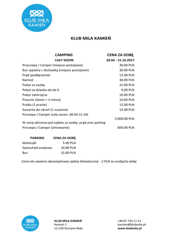 KLUB MILA KAMIEŃ CAMPING CAŁY SEZON Przyczepa / Camper (miejsce postojowe) Bus sypialny z dostawką (miejsce postojowe) Prąd (podłączenie) Namiot Pobyt za osobę Pobyt za dziecko do lat 6 Pobyt zwierzęcia Prysznic (żeton = 5 minut) Pralka (1 pranie) Suszarka do ubrań (1 suszenie) Przczepa / Camper (cały sezon: 28.04-15.10) CENA ZA DOBĘ 28.04 - 15.10.2017 30.00 PLN 30.00 PLN 12.00 PLN 30.00 PLN 15.00 PLN 0.00 PLN 10.00 PLN 10.00 PLN 12.00 PLN 15.00 PLN 3,000.00 PLN W cenę wliczona jest opłata za osoby, prąd oraz parking Przczepa / Camper (zimowanie) 600.00 PLN PARKING CENA ZA DOBĘ Motocykl 5.00 PLN Samochód osobowy 10.00 PLN Bus 15.00 PLN Cena nie zawiera obowiązkowej opłaty klimatycznej - 2 PLN za osobę/za dobę KLUB MILA KAMIEŃ Kamień 1 12-220 Ruciane-Nida +48 87 733 11 31 [email protected] www.klubmila.pl