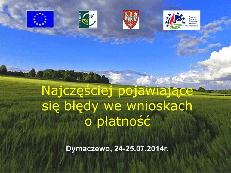 Najczęściej pojawiające się błędy we wnioskach o płatność Dymaczewo, 24-25.07.2014r. Podstawy prawne: a) Rozporządzenie Ministra Rolnictwa i Rozwoju Wsi z dnia 25 listopada 2011 r. zmieniające rozporządzenie w sprawie szczegółowych warunków i trybu przyznawania oraz wypłaty pomocy finansowej w ramach działania „Funkcjonowanie lokalnej grupy działania, nabywanie umiejętności i aktywizacja” objętego Programem Rozwoju Obszarów Wiejskich na lata 2007—2013. Dz.U. 2011 nr 268 poz. 1588 b) Rozporządzenie Ministra Rolnictwa i Rozwoju Wsi z dnia 12 sierpnia 2010 r. zmieniające rozporządzenie w sprawie szczegółowych warunków i trybu przyznawania oraz wypłaty pomocy finansowej w ramach działania "Funkcjonowanie lokalnej grupy działania, nabywanie umiejętności i aktywizacja" objętego Programem Rozwoju Obszarów Wiejskich na lata 2007-2013. Dz.U. 2010 nr 153 poz. 1029 c) Rozporządzenie Ministra Rolnictwa i Rozwoju Wsi z dnia 31 lipca 2009 r. zmieniające rozporządzenie w sprawie szczegółowych warunków i trybu przyznawania oraz wypłaty pomocy finansowej w ramach działania "Funkcjonowanie lokalnej grupy działania" objętego Programem Rozwoju Obszarów Wiejskich na lata 2007-2013. Dz.U. 2009 nr 129 poz. 1063 d) Rozporządzenie Ministra Rolnictwa i Rozwoju Wsi w sprawie szczegółowych warunków i trybu przyznawania oraz wypłaty pomocy finansowej w ramach działania "Funkcjonowanie lokalnej grupy działania" objętego PROW 2007-2013 z dnia 23 maja 2008 r. Dz.U. 2008 nr 103 poz. 660 Błędy dotyczące Wniosku o Płatność: • Sekcja III WoP: a) Kwota pomocy niezgodna z ostatnim zatwierdzonym planem finansowym. Instrukcja do WoP wyraźnie wskazuje, że jest to ostatnia zatwierdzona kwota pomocy, zgodna z dokonanymi zmianami w planie finansowym operacji. Błędy dotyczące Wniosku o Płatność: •Sekcja V WoP: a) Ujęte są dokumenty, które nie dotyczą danego etapu (dokumenty przedłożone w poprzednim etapie i podlegające korekcie nie mogą być kosztem kwalifikowanych w etapie następnym). b) Błędnie określony rodzaj dokumentu w kolumnie 1: np. umowa zlecenie, a zawarte dane dotyczą rachunku – należy zachować konsekwencję. c) Błędnie określone daty zapłaty w kolumnie 9: nie są ujęte daty ostatecznej płatności dotyczącej danej transakcji – często dotyczy umów cywilnoprawnych i umów o pracę. d) Błędne daty wystawienia dokumentów. •Błędy dotyczące kompletności: a) Brak dokumentów w teczce sprawy, pomimo ujęcia ich w Sekcji V WoP (można uzupełnić). b) Brak dokumentów w teczce sprawy i w Sekcji V WoP: ujęte w I lub II uzupełnieniach nie mogą być kosztem kwalifikowanym, jedynie można zaliczyć je do kosztów całkowitych, jeśli dotyczą danego etapu operacji – wynika to z faktu, iż nie można modyfikować kwoty pomocy z pierwotnego WoP. c) Brak upoważnienia dla nowo zatrudnionej osoby, która swoim nazwiskiem potwierdza kopie dokumentów. d) Brak dowodów zapłaty (płatność gotówkowa i bezgotówkowa). •Błędy dotyczące kompletności: e) Brak załączników typu: listy obecności, listy odbioru nagród, karty publikacji, karty udzielonego doradztwa. Załączniki do WoP od 15a do 15e mają charakter formalny i potwierdzają realizację danego zadania. Jeśli Beneficjent posiada dokumenty zawierające wszystkie niezbędne informacje i są to elementy podobne jak w ww. załącznikach, nie ma konieczności na nowo sporządzać ich na wskazanych formularzach. f) Brak programów szkoleń, konferencji. g) Brak regulaminów konkursów. h) Brak śladów rewizyjnych na ogłoszenia i reklamy zamieszczone w mediach. •Błędy dotyczące kompletności: i) Brak fotografii tablic informacyjnych, banerów reklamowych, namiotów promocyjnych itp. j) Brak WoP w formie elektronicznej lub niezgodne sumy kontrolne. k) Brak śladów rewizyjnych dotyczących filmów, reportaży lub wskazania miejsca, gdzie można by je obejrzeć i zweryfikować. l) Brak licencji na zakupione oprogramowanie – na każdym etapie, czy jest to zakup sprzętu i oprogramowania, czy też przedłużenie oprogramowania należy przedłożyć umowę licencyjną, zgodnie z przepisami o prawie autorskim i prawach pokrewnych. Błędy dotyczące faktur, rachunków i pozostałych dokumentów o równoważnej wartości dowodowej: a) Brak miernika lub miernik różny szczegółowym opisie zadań dla etapu. od założonego w b) Błędne opisy zadań na drugiej stronie dokumentów (dotyczy pozycji szoz, kosztów kwalifikowanych, brak dekretacji księgowej). c) Brak pieczęci Przedstawiono do refundacji. d) Brak potwierdzenia zgodności dokumentów z oryginałami. e) Niewidoczne dane na kopiach dokumentów. •Błędy merytoryczne: a) Płatność gotówkowa powyżej 1000 zł - rzadziej, ale występuje jeszcze. b) Brak logotypów (zgodnie z Księgą wizualizacji PROW 20072013) lub informacji wskazującej, iż projekt (zadanie) zostało zrealizowane ze środków EFRROW (dotyczy głównie informowania: plakaty, artykuły, publikacje). •Błędy merytoryczne: c) Błędnie określone mierniki: często niezgodne z załączonymi dokumentami, np.: i. szkolenia: ilość osób na liście obecności nie jest zgodna z sekcją VI WoP (wyjaśnienie rozbieżności), ii. polecenia wyjazdów służbowych: jeśli miernikiem są km: często źle zliczone, iii. wyżywienie na szkoleniach, spotkaniach, konferencjach: nie można określić miernika na podstawie faktury, gdyż często wystawca podaje „usługa gastronomiczna/usługa cateringowa” a w szczegółowym opisie zadań widnieje ilość porcji/ilość osób, iv. szkolenie określone w godzinach, natomiast na fakturze lub rachunku brak takiej informacji, v. usługa hotelowa – doby. •Błędy merytoryczne: d) Konieczność dokonywania zmian w szczegółowym opisie zadań po zrealizowaniu danego etapu operacji – w ten sposób można zapobiec wielu błędom we wnioskach o płatność, zwłaszcza dotyczy to wysokości po