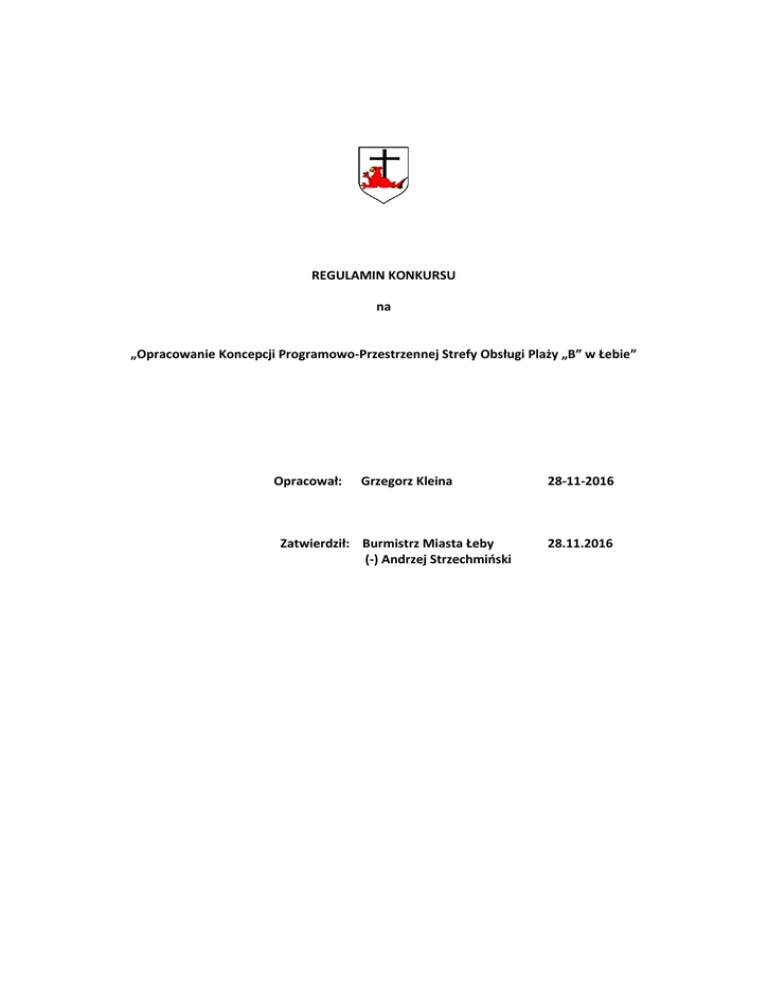 REGULAMIN KONKURSU na „Opracowanie Koncepcji Programowo-Przestrzennej Strefy Obsługi Plaży „B” w Łebie” Opracował: Grzegorz Kleina Zatwierdził: Burmistrz Miasta Łeby (-) Andrzej Strzechmiński 28-11-2016 28.11.2016 REGULAMIN KONKURSU I. POSTANOWIENIA OGÓLNE Burmistrz Miasta Łeby, zwany dalej „Organizatorem” lub „Zamawiającym”, ogłasza konkurs na: Opracowanie Koncepcji Programowo-Przestrzennej Strefy Obsługi Plaży „B” w Łebie Konkurs przeprowadzony zostanie według zasad określonych w niniejszym regulaminie. Postępowanie nie podlega rygorom Ustawy z dnia 29 stycznia 2004 roku Prawo Zamówień Publicznych (t.j. Dz. U. z 2015 r. poz. 2164, z późn. zm.). Celem konkursu jest uzyskanie najlepszej koncepcji programowo-przestrzennej zagospodarowania obszaru obejmującego tereny przyległe do drogi wewnętrznej stanowiącej połączenie plaży „B” w Łebie z ul. Turystyczną wraz z parkingiem przy plaży „B”. Zamawiający przewiduje możliwość zlecenia wybranemu wykonawcy (autorowi lub zespołowi autorskiemu) opracowania projektu budowlanego i wykonawczego obiektów obsługi plaży „B” zgodnie z warunkami zawartymi w niniejszym Regulaminie. II. WYTYCZNE PROJEKTOWE II.1 OBSZAR OPRACOWANIA 1. Obszar opracowania obejmuje działki nr 1/3, 1/5 , 1/6 ,1/7 ,42 obr.2 oraz fragmentów działek nr 1/20 ,43/6 i 44/1 wykorzystywanych odpowiednio jako zejście na plażę, fragment drogi gminnej ul. Turystycznej i fragment drogi leśnej. Zakres opracowania określa załącznik nr 1 do Regulaminu. 2. Przy wykonywaniu opracowania uczestnik konkursu zobowiązany jest uwzględnić przebudowę obiektu budowlanego położonego na działce nr 1/7 obr.2 oraz rozbiórkę pozostałych obiektów położonych na działkach wymienionych w pkt 2.1 3. Główne ograniczenia w zagospodarowaniu nieruchomości: - służebność drogi koniecznej o szer. 4,5 m ustanowiona na działce nr 42 obr.2, - konieczność zachowania odległości zabudowy 12 m od ściany lasu. Uwagi: a) służebność drogi koniecznej dotyczy przejścia i przejazdu do sąsiadującej nieruchomości ozn. Nr 41/4 obr.2. Zgodnie z wstępnymi ustaleniami z właścicielem nieruchomości zgadza się on ze zniesieniem służebności przejazdu przez działkę nr 42 obr.2 pod warunkiem ustanowienia takiej służebności na drodze leśnej na dz. Nr 44/1 obr.2 b) działką oznaczoną ewidencyjnie jako leśna położoną w granicy opracowania jest południowy fragment działki nr 1/5 obr.2. Działkami leśnymi przyległymi do obszaru opracowania są działki 1/20 (część), 1/23 i 44/1 obr.2. Przez zachowanie odległości od ściany lasu należy rozumieć odległość projektowanej zabudowy od istniejącego zadrzewienia na gruntach oznaczonych jako leśne. 4. Ustalenia dotyczące przeznaczenia nieruchomości w obowiązujących dokumentach planistycznych: Działki wymienione w pkt 2.1 położone są w obszarze dla którego nie ma obowiązującego miejscowego planu zagospodarowania przestrzennego. W obowiązującym „Studium uwarunkowań i kierunków zagospodarowania Miasta Łeby” uchwalonym uchwałą nr XXI/250/2016 Rady Miejskiej w Łebie w dniu 05.09.2016 r. obszar opracowania położony jest w podstrefie przekształceń funkcji A4.1 w której obiekty budowlane ze względu na eksponowaną lokalizację powinny posiadać formę i detal o wysokich walorach architektonicznych. W przestrzeni publicznej strefy ustala się możliwość realizacji zieleni urządzonej, oraz obiektów małej architektury związanych z funkcją rekreacji. W przypadku przebudowy i rozbudowy istniejących obiektów dopuszcza się zachowanie ich dotychczasowych gabarytów. Miejsca parkingowe dla zabudowy usługowej należy projektować w ilości nie niniejszej niż 1.5 stanowiska na 100 m2 pow. użytkowej. 5. Uczestnik konkursu zobowiązany jest uwzględnić w opracowanej koncepcji przepisy prawa i normy obowiązujące na obszarze Rzeczypospolitej Polskiej. II.2 ZAKRES MERYTORYCZNY Celem konkursu jest zaprezentowanie koncepcji zagospodarowania strefy przyplażowej z dojściem na plażę „B’ w Łebie obejmującej w szczególności: koncepcję architektoniczną przebudowy obiektu położonego na działce nr 1/7 obr.2 w najwyżej położonym obszarze opracowania (8,5-9,0 m n.p.m.) z przeznaczeniem go na centrum dyspozycyjne i zaplecze socjalne służb ratowniczych z propozycja układu funkcjonalnego obiektu. Przebudowie podlegałoby również dojście do obiektu, rozbiórkę nawierzchni parkingu z obniżeniem rzędnej terenu do rzędnej sąsiedniej drogi wewnętrznej (5,5-6,0 m n.p.m), koncepcję architektoniczną wieży z tarasem widokowym (sugerowana lokalizacja na działce nr 1/6 obr.2). Wieża wykorzystywana również jako nośnik urządzeń informacyjnych (system bezpiecznej identyfikacji plaż) oraz urządzeń monitoringu miejskiego. Rzędna terenu wynosi w tej lokalizacji ok. 6,16 m npm. Od strony morza rzędne wydm wynoszą - od zachodu ok.11,4 m.n.p.m. a od wschodniej 7,90 m.n.p.m. (+ istniejące zadrzewienie). koncepcję architektoniczną zabudowy usługowej w postaci obiektów o zbliżonych gabarytach, bryle i materiałach wykończeniowych wraz z proponowanym układem funkcjonalnym obiektów. Należy przyjąć dodatkowo następujące założenia: - należy przyjąć ,że teren publiczny będzie terenem otwartym i podobnie będzie zagospodarowany teren prywatny – działka nr 41/4 obr.2. Zabudowę należy więc tak projektować aby możliwe było wytyczenie dwóch przejść pieszych z działki nr 41/4 na dz. 42 obr.2 (jedno przejście w miejscu ustanowionej służebności) a także założyć ,że od strony zaplecza terenów publicznych zabudowa również będzie posiadać odpowiednie walory architektoniczne. w jednym z zaprojektowanych obiektów należy przewidzieć lokalizację toalety publicznej, punktu medycznego i punktu informacji turystycznej. W pozostałych projektowanych obiektach dopuszcza się lokalizację usług handlowo-g