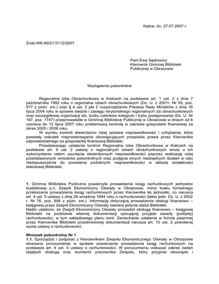 Kielce, dn. 27.07.2007 r. Znak:WK-60/21/3112/2007 Pani Ewa Sędrowicz Kierownik Gminnej Biblioteki Publicznej w Obrazowie Wystąpienie pokontrolne Regionalna Izba Obrachunkowa w Kielcach na podstawie art. 1 ust. 2 z dnia 7 października 1992 roku o regionalna izbach obrachunkowych (Dz. U. z 2001r. Nr 55, poz. 577 z późn. zm.) oraz § 4 ust. 2 pkt 2 rozporządzenia Prezesa Rady Ministrów z dnia 16 lipca 2004 roku w sprawie siedzib i zasięgu terytorialnego regionalnych izb obrachunkowych oraz szczegółowej organizacji izb, liczby członków kolegium i trybu postępowania (Dz. U. Nr 167, poz. 1747) przeprowadziła w Gminnej Bibliotece Publicznej w Obrazowie w dniach od 6 czerwca do 12 lipca 2007 roku problemową kontrolę w zakresie gospodarki finansowej za okres 2005 i 2006 roku. W wyniku kontroli stwierdzono niżej opisane nieprawidłowości i uchybienia, które powstały wskutek nieprzestrzegania obowiązujących przepisów prawa przez Kierownika odpowiedzialnego za gospodarkę finansową Biblioteki. Przedstawiając ustalenia kontroli Regionalna Izba Obrachunkowa w Kielcach na podstawie art. 9 ust. 2 ustawy o regionalnych izbach obrachunkowych wnosi o ich wykorzystanie celem usunięcia stwierdzonych nieprawidłowości poprzez realizację niżej przedstawionych wniosków pokontrolnych oraz podjęcie innych niezbędnych działań w celu niedopuszczenia do powstania podobnych nieprawidłowości w dalszej działalności statutowej Biblioteki. 1. Gminna Biblioteka Publiczna powierzyła prowadzenie ksiąg rachunkowych jednostce budżetowej p.n. Zespół Ekonomiczny Oświaty w Obrazowie, mimo braku formalnego przekazania prowadzenia ksiąg rachunkowych przez Kierownika tej jednostki, co narusza art. 4 ust. 5 ustawy z dnia 29 września 1994 roku o rachunkowości (tekst jedn. Dz. U. z 2002 r. Nr 76, poz. 694 z późn. zm.). Informację dotyczącą prowadzenia obsługi finansowo – księgowej przez Zespół Ekonomiczny Oświaty zawiera jedynie statut Biblioteki. Nadto ustalono, że Zespół Ekonomiczny Oświaty prowadził obsługę finansowo – księgową Biblioteki na podstawie własnej dokumentacji opisującej przyjęte zasady (politykę) rachunkowości, w tym zakładowego planu kont. Zaniechanie ustalenia w formie pisemnej przez Kierownika Biblioteki przedmiotowej dokumentacji narusza art. 10 ust. 2 powołanej wyżej ustawy o rachunkowości. Wniosek pokontrolny Nr 1 1.1. Sporządzić i podpisać z Kierownikiem Zespołu Ekonomicznego Oświaty w Obrazowie stosowne porozumienie w sprawie powierzenia prowadzenia ksiąg rachunkowych na podstawie art. 4 ust. 5 ustawy o rachunkowości. W porozumieniu wskazać zakres zadań objętych obsługą oraz wymienić pracownika Zespołu, który przyjmie obowiązki i 2 odpowiedzialność Głównego Księgowego Biblioteki w zakresie o którym mowa w art. 45 ust. 1 obecnie obowiązującej ustawy o finansach publicznych. 1.2. Opracować i przyjąć do stosowania dokumentację opisującą przyjęte zasady (politykę) rachunkowości. 1.3. Ewidencję księgową Biblioteki prowadzić na podstawie dokumentacji opisującej przyjęte zasady (politykę) rachunkowości, ustalonej przez jej Kierownika. 2. Zespół Ekonomiczny Oświaty prowadził obsługę finansowo – księgową Biblioteki w oparciu o własne procedury kontroli finansowej, w tym instrukcję obiegu dokumentów finansowo- księgowych oraz instrukcję inwentaryzacyjną. Brak ustalenia w formie pisemnej przez Kierownika Biblioteki własnych procedur kontroli finansowej oraz stosowanie procedur Zespołu narusza art. 35a ust. 3 ówcześnie obowiązującej ustawy z dnia 26 listopada 1998 roku o finansach publicznych (tekst jedn. Dz. U. z 2003 r. Nr 15, poz. 148 z późn. zm.) oraz art. 47 ust. 2 aktualnie obowiązującej ustawy z dnia 30 czerwca 2005 roku o finansach publicznych (Dz. U. Nr 249, poz. 2104 z późn. zm.). Wniosek pokontrolny Nr 2 2.1. Opracować formie pisemnej oraz przyjąć do stosowania procedury kontroli finansowej zgodnie z art. 47 ust. 2 ustawy o finansach publicznych, przy zastosowaniu aktualnie obowiązujących przepisów prawa, oraz zgodnie z Komunikatem Nr 13 Ministra Finansów z dnia 30 czerwca 2006 roku w sprawie ogłoszenia „Standardów kontroli finansowej w jednostkach sektora finansów publicznych” (Dz. Urz. Min. Fin. Nr 7, poz. 58). 2.2. Na bieżąco aktualizować procedury kontroli finansowej m.in. w sytuacji zmian organizacyjnych lub powszechnie obowiązujących przepisów prawa. 3. Dowody źródłowe dotyczące kosztów Biblioteki zatwierdzał do wypłaty Kierownik Zespołu Ekonomicznego Oświaty oraz jego Główny Księgowy, co narusza art. 28a ust. 1 ówcześnie obowiązującej ustawy o finansach publicznych oraz art. 44 ust. 1 obecnie obowiązującej ustawy o finansach publicznych, zgodnie z którymi kierownik jednostki odpowiada za całość gospodarki finansowej kierowanej jednostki, obejmującej gromadzenie i rozdysponowywanie środków publicznych oraz gospodarkę mieniem jednostki, a dysponowanie środkami publicznymi określonymi w planie finansowym jednostki wiąże się m.in. z zatwierdzaniem do wypłaty dowodów finansowo – księgowych. Zgodnie z art. 2 ustawy z dnia 27 czerwca 1997 roku o bibliotekach (Dz. U. Nr 85, poz. 539 z późn. Zm.) w związku z art. 27 ust. 3 i art. 28 ust. 1 ustawy z dnia 25 października 1991 roku o organizowaniu i prowadzeniu działalności kulturalnej (tekst jedn. Dz. U. z 2001 r. Nr 13, poz. 123 z późn. zm.) biblioteka pokrywa koszty bieżącej działalności i zobowiązania z uzyskiwanych przychodów realizując plan działalności instytucji kultury, zatwierdzony przez jej dyrektora. Stąd odpowiedzialność za prawidłowość gospodarki finansowej spoczywa na kierowniku jednostki. Obsługa finansowo - księgowa, nie może być utożsamiana z przejęciem od kierownika obsługiwanej jednostki odpowiedzialności za całość gospodarki finansowej, pomimo braku uregulowań ustawowych zezwalających na takie rozwiązania. Wni
