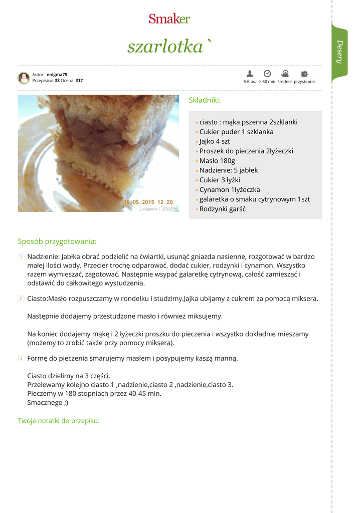 szarlotka` Autor: enigma79 Przepisów: 33 Ocena: 317 5-6 os. > 60 min średnie przystępne Składniki: ciasto : mąka pszenna 2szklanki Cukier puder 1 szklanka Jajko 4 szt Proszek do pieczenia 2łyżeczki Masło 180g Nadzienie: 5 jabłek Cukier 3 łyżki Cynamon 1łyżeczka galaretka o smaku cytrynowym 1szt Rodzynki garść Sposób przygotowania: 1 Nadzienie: Jabłka obrać podzielić na ćwiartki, usunąć gniazda nasienne, rozgotować w bardzo małej ilości wody. Przecier trochę odparować, dodać cukier, rodzynki i cynamon. Wszystko razem wymieszać, zagotować. Następnie wsypać galaretkę cytrynową, całość zamieszać i odstawić do całkowitego wystudzenia. 2 Ciasto:Masło rozpuszczamy w rondelku i studzimy.Jajka ubijamy z cukrem za pomocą miksera. Następnie dodajemy przestudzone masło i również miksujemy. Na koniec dodajemy mąkę i 2 łyżeczki proszku do pieczenia i wszystko dokładnie mieszamy (możemy to zrobić także przy pomocy miksera). 3 Formę do pieczenia smarujemy masłem i posypujemy kaszą manną. Ciasto dzielimy na 3 części. Przelewamy kolejno ciasto 1 ,nadzienie,ciasto 2 ,nadzienie,ciasto 3. Pieczemy w 180 stopniach przez 40-45 min. Smacznego ;) Twoje notatki do przepisu: