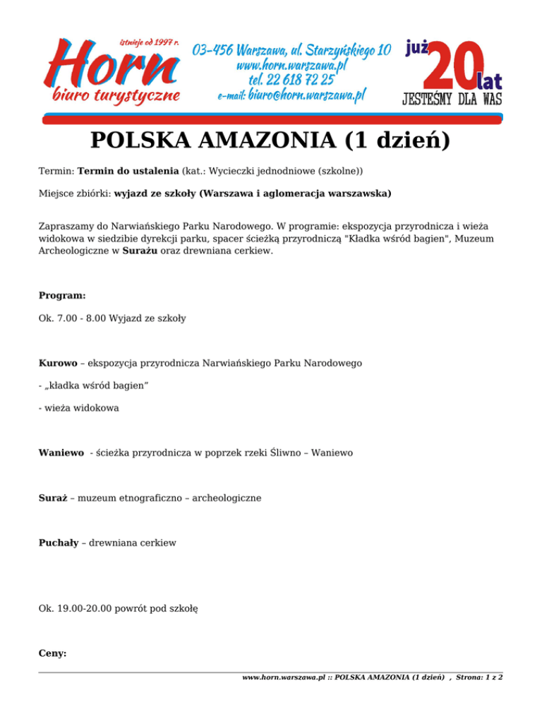 POLSKA AMAZONIA (1 dzień) Termin: Termin do ustalenia (kat.: Wycieczki jednodniowe (szkolne)) Miejsce zbiórki: wyjazd ze szkoły (Warszawa i aglomeracja warszawska) Zapraszamy do Narwiańskiego Parku Narodowego. W programie: ekspozycja przyrodnicza i wieża widokowa w siedzibie dyrekcji parku, spacer ścieżką przyrodniczą "Kładka wśród bagien", Muzeum Archeologiczne w Surażu oraz drewniana cerkiew. Program: Ok. 7.00 - 8.00 Wyjazd ze szkoły Kurowo – ekspozycja przyrodnicza Narwiańskiego Parku Narodowego - „kładka wśród bagien” - wieża widokowa Waniewo - ścieżka przyrodnicza w poprzek rzeki Śliwno – Waniewo Suraż – muzeum etnograficzno – archeologiczne Puchały – drewniana cerkiew Ok. 19.00-20.00 powrót pod szkołę Ceny: www.horn.warszawa.pl :: POLSKA AMAZONIA (1 dzień) , Strona: 1 z 2 LICZBA OSÓB PŁACĄCYCH: 25-29 30-34 35-39 124.00 zł 107.00 zł 91.00 zł KOSZT UCZESTNICTWA: 40 i więcej 82.00 zł Uwagi: Cena zawiera: * Transport autokarem klasy * (Mercedes, Bova, Setra...) ze wszystkimi opłatami drogowymi, parkingowymi itp., * Obsługa pilocka i przewodnicka na trasie wycieczki i w zwiedzanych obiektach, * Bilety wstępów do zwiedzanych obiektów wg programu * 3 – 4 miejsca bezpłatne dla opiekunów * ubezpieczenie NNW uczestników wycieczki i opiekunów Cena nie zawiera: * Wyżywienia (możliwe zorganizowanie obiadu) w cenie 19 zł od osoby. Zgłoszenia: tel. 22 618 72 25, kom. 609 462 660, e-mail: [email protected] www.horn.warszawa.pl :: POLSKA AMAZONIA (1 dzień) , Strona: 2 z 2