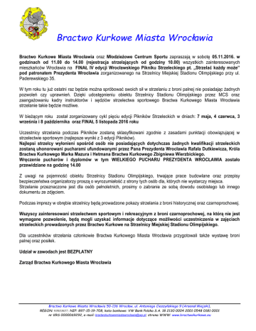 Bractwo Kurkowe Miasta Wrocławia Bractwo Kurkowe Miasta Wrocławia oraz Młodzieżowe Centrum Sportu zapraszają w sobotę 05.11.2016. w godzinach od 11.00 do 14.00 (rejestracja strzelających od godziny 10.00) wszystkich zainteresowanych mieszkańców Wrocławia na FINAŁ IV edycji Wrocławskiego Pikniku Strzeleckiego pt. „Strzelać każdy może” pod patronatem Prezydenta Wrocławia zorganizowanego na Strzelnicy Miejskiej Stadionu Olimpijskiego przy ul. Paderewskiego 35. W tym roku tu już ostatni raz będzie można spróbować swoich sił w strzelaniu z broni palnej nie posiadając żadnych pozwoleń czy uprawnień. Dzięki udostępnieniu obiektu Strzelnicy Stadionu Olimpijskiego przez MCS oraz zaangażowaniu kadry instruktorów i sędziów strzelectwa sportowego Bractwa Kurkowego Miasta Wrocławia strzelanie takie będzie możliwe. W bieżącym roku został zorganizowany cykl pięciu edycji Pikników Strzeleckich w dniach: 7 maja, 4 czerwca, 3 września i 8 października oraz FINAŁ 5 listopada 2016 roku Uczestnicy strzelania podczas Pikników zostaną sklasyfikowani zgodnie z zasadami punktacji obowiązującej w strzelectwie sportowym (najlepsze wyniki z 3 edycji Pikników). Najlepsi strzelcy wyłonieni spośród osób nie posiadających dotychczas żadnych kwalifikacji strzeleckich zostaną uhonorowani pucharami ufundowanymi przez Pana Prezydenta Wrocławia Rafała Dutkiewicza, Króla Bractwa Kurkowego Marka Mazura i Hetmana Bractwa Kurkowego Zbigniewa Wierzbickiego. Wręczenie pucharów i dyplomów w tym WIELKIEGO PUCHARU PREZYDENTA WROCŁAWIA zostało przewidziane na godzinę 14.00 Z uwagi na pojemność obiektu Strzelnicy Stadionu Olimpijskiego, trwające prace budowlane oraz przepisy bezpieczeństwa organizatorzy proszą o wyrozumiałość z strony tych osób dla, których nie wystarczy miejsca. Strzelanie przeznaczone jest dla osób pełnoletnich, prosimy o zabranie ze sobą dowodu osobistego lub innego dokumentu ze zdjęciem. Podczas imprezy w obrębie strzelnicy będą prowadzone pokazy strzelania z broni historycznej oraz czarnoprochowej. Wszyscy zainteresowani strzelectwem sportowym i rekreacyjnym z broni czarnoprochowej, na którą nie jest wymagane pozwolenie, będą mogli uzyskać informacje dotyczące możliwości uczestniczenia w zajęciach strzeleckich prowadzonych przez Bractwo Kurkowe na Strzelnicy Miejskiej Stadionu Olimpijskiego. Dla uczestników strzelania członkowie Bractwa Kurkowego Miasta Wrocławia przygotowali także wystawę broni palnej oraz posiłek. Udział w zawodach jest BEZPŁATNY Zarząd Bractwa Kurkowego Miasta Wrocławia Bractwo Kurkowe Miasta Wrocławia 50-136 Wrocław, ul. Antoniego Cieszyńskiego 9 (Arsenał Miejski), REGON: 93033657; NIP: 897-15-19-708, koto bankowe: VW Bank Polska S.A. 18 2130 0004 2001 0548 0181 0001 nr KRS 0000069292, e-mail: [email protected]; strona WWW: www.bractwokurkowe.eu