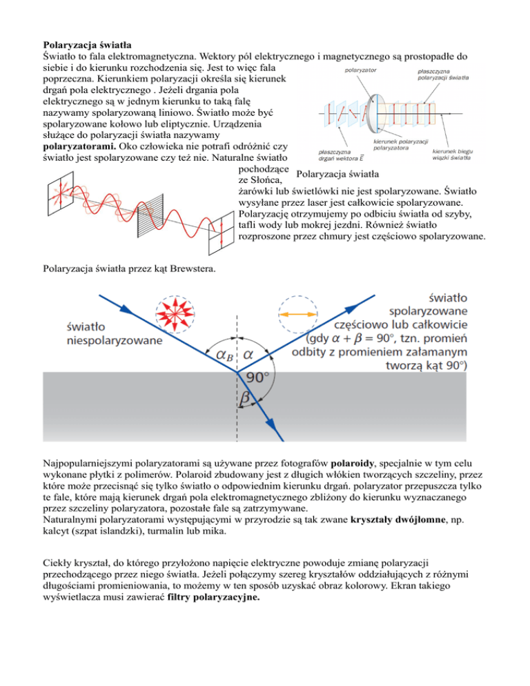 Polaryzacja światła Światło to fala elektromagnetyczna. Wektory pól