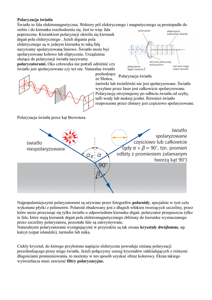Polaryzacja światła Światło to fala elektromagnetyczna. Wektory pól elektrycznego i magnetycznego są prostopadłe do siebie i do kierunku rozchodzenia się. Jest to więc fala poprzeczna. Kierunkiem polaryzacji określa się kierunek drgań pola elektrycznego . Jeżeli drgania pola elektrycznego są w jednym kierunku to taką falę nazywamy spolaryzowaną liniowo. Światło może być spolaryzowane kołowo lub eliptycznie. Urządzenia służące do polaryzacji światła nazywamy polaryzatorami. Oko człowieka nie potrafi odróżnić czy światło jest spolaryzowane czy też nie. Naturalne światło pochodzące Polaryzacja światła ze Słońca, żarówki lub świetlówki nie jest spolaryzowane. Światło wysyłane przez laser jest całkowicie spolaryzowane. Polaryzację otrzymujemy po odbiciu światła od szyby, tafli wody lub mokrej jezdni. Również światło rozproszone przez chmury jest częściowo spolaryzowane. Polaryzacja światła przez kąt Brewstera. Najpopularniejszymi polaryzatorami są używane przez fotografów polaroidy, specjalnie w tym celu wykonane płytki z polimerów. Polaroid zbudowany jest z długich włókien tworzących szczeliny, przez które może przecisnąć się tylko światło o odpowiednim kierunku drgań. polaryzator przepuszcza tylko te fale, które mają kierunek drgań pola elektromagnetycznego zbliżony do kierunku wyznaczanego przez szczeliny polaryzatora, pozostałe fale są zatrzymywane. Naturalnymi polaryzatorami występującymi w przyrodzie są tak zwane kryształy dwójłomne, np. kalcyt (szpat islandzki), turmalin lub mika. Ciekły kryształ, do którego przyłożono napięcie elektryczne powoduje zmianę polaryzacji przechodzącego przez niego światła. Jeżeli połączymy szereg kryształów oddziałujących z różnymi długościami promieniowania, to możemy w ten sposób uzyskać obraz kolorowy. Ekran takiego wyświetlacza musi zawierać filtry polaryzacyjne. Światło odbite od gładkiej powierzchni (woda, śnieg, lód, mokra nawierzchnia drogi, przednia szyba samochodu, itp.) tworzy oślepiającą białą poświatę. Ale odbite światło jest przynajmniej częściowo spolaryzowane. Ten fakt wykorzystuje się w okularach zawierających filtry polaryzacyjne. Eliminują one również refleksy od ekranu monitora i telewizora. Projekcja obrazu trójwymiarowego, stosowana m.in. w kinach IMAX. Dwa obiektywy równocześnie rejestrują dwa obrazy. Ich osie optyczne są przesunięte względem siebie o odległość zbliżoną do rozstawu ludzkich oczu (lub inną odległość w przypadku efektów specjalnych).Widz zakłada specjalne okulary wyposażone w filtry polaryzacyjne. W efekcie jedno oko widzi film wyświetlany przez lewy projektor, a drugie przez prawy i do mózgu widza dociera taki sam obraz, jak gdyby osobiście znajdował się na planie filmowym. Tak widzimy przez okulary polaryzacyjne, górne zdjęcie wykonane jest z filtrem, a dolne bez filtru