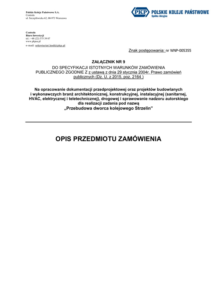 Polskie Koleje Państwowe S.A. Centrala ul. Szczęśliwicka 62, 00-973 Warszawa Centrala Biuro Inwestycji tel.: +48 (22) 375 39 07 www.pkpsa.pl e-mail: [email protected] Znak postępowania: nr WNP-005355 ZAŁĄCZNIK NR 9 DO SPECYFIKACJI ISTOTNYCH WARUNKÓW ZAMÓWIENIA PUBLICZNEGO ZGODNIE Z z ustawą z dnia 29 stycznia 2004r. Prawo zamówień publicznych (Dz. U. z 2015. poz. 2164 ) Na opracowanie dokumentacji przedprojektowej oraz projektów budowlanych i wykonawczych branż architektonicznej, konstrukcyjnej, instalacyjnej (sanitarnej, HVAC, elektrycznej i teletechnicznej), drogowej i sprawowanie nadzoru autorskiego dla realizacji zadania pod nazwą „Przebudowa dworca kolejowego Strzelin” OPIS PRZEDMIOTU ZAMÓWIENIA PKP SA Centrala Biuro Inwestycji Strona 2 Spis treści A. OGÓLNY OPIS INWESTYCJI .................................................................................. 3 1. STAN ISTNIEJĄCY .................................................................................................. 3 1.1. Opis istniejącego zagospodarowania terenu............................................................. 3 1.2. Opis istniejącego budynku dworca ........................................................................... 4 2. STAN PROJEKTOWANY ........................................................................................ 6 2.1. Obiekty kubaturowe - budynek dworca ..................................................................... 6 2.1.1. Projektowany program funkcjonalno-użytkowy ................................................... 7 2.1.2. Przesłanki do programu funkcjonalno-użytkowego ............................................. 9 2.1.3. Zestawienie powierzchni i klasyfikacja pomieszczeń .......................................... 9 2.2. Projektowane zagospodarowanie terenu .................................................................14 B. SZCZEGÓŁOWY OPIS PRZEDMIOTU ZAMÓWIENIA...........................................14 1. 1.1. 1.2. 1.3. 1.4. 1.5. 1.6. 2. 2.1. 2.2. 2.3. 2.4. 3. PRZEWIDYWANY ZAKRES ROBÓT: ..............................................................................14 W odniesieniu do zagospodarowania terenu: ..........................................................15 W odniesieniu do robót ogólnobudowlanych: ...........................................................17 W odniesieniu do robót instalacyjnych: ....................................................................20 W odniesieniu do robót drogowych: .........................................................................22 W odniesieniu do robót mostowych: ........................................................................22 W odniesieniu do tymczasowej obsługi podróżnych: ...............................................22 ZAKRES PRAC PROJEKTOWYCH .................................................................................22 Etap I - Prace przedprojektowe:...............................................................................24 Etap II – Projekt budowlany: ....................................................................................25 Etap III – Projekt wykonawczy .................................................................................26 Etap IV – Nadzór autorski: .......................................................................................29 WYMAGANE OPINIE, DECYZJE I UZGODNIENIA ..............................................................31 4. 4.1. 4.2. 5. PRZEKAZANIE PRZEDMIOTU ZAMÓWIENIA ...................................................................33 Zasady przekazania: ...............................................................................................33 Wymagania dodatkowe: ..........................................................................................35 ZAŁĄCZNIKI ..............................................................................................................37 Postępowanie nr WNP-005355 na opracowanie dokumentacji przedprojektowej oraz projektów budowlanych i wykonawczych branż konstrukcyjnej, instalacyjnej (sanitarnej, HVAC, elektrycznej i teletechnicznej), drogowej i sprawowanie nadzoru autorskiego dla realizacji zadania pn.” Przebudowa dworca kolejowego Strzelin”. PKP SA Centrala Biuro Inwestycji Strona 3 A. OGÓLNY OPIS INWESTYCJI Przedmiotem zamówienia jest opracowanie dokumentacji przedprojektowej, dokumentacji technicznej wielobranżowej oraz prowadzenie nadzorów autorskich nad realizacją robót budowlanych w ramach inwestycji polegającej na: Przebudowie budynku dworca Rozbiórce istniejącego dworca i budowie nowego Budowie dworca tymczasowego wraz z etapowaniem prac zapewniających ciągłość funkcjonowania dworca Zagospodarowaniu terenu wokół dworca – budowie placu przydworcowego Przebudowie układu drogowego przy budynku dworca TAK NIE NIE TAK NIE 1. STAN ISTNIEJĄCY 1.1. Opis istniejącego zagospodarowania terenu Strzelin położony jest w województwie dolnośląskim, w powiecie strzelińskim, siedziba gminy miejsko-wiejskiej Strzelin. DANE CHARAKTERYSTYCZNE ADRES INWESTYCJI WOJEWÓDZTWO POWIAT DZIAŁKI EWIDENCYJNE KSIĘGA WIECZYSTA TEREN ZAMKNIĘTY ZABYTEK OCHRONA ŚRODOWISKA KLASYFIKACJA DWORCA ILOŚĆ ODPRAW PASAŻERÓW W ROKU ILOŚĆ PRZYJAZDÓW I ODJAZDÓW W ROKU RODZAJE POŁĄCZEŃ RODZAJE POCIĄGÓW STAJĄCYCH NA STACJI PRZEWOŹNICY WĘZEŁ PRZESIADKOWY DOSTĘP DO DROGI PUBLICZNEJ ul. Bolka Świdnickiego 23/24, 57-100 Strzelin Dolnośląskie strzeliński 12/5 AM 15 obręb Strzelin WR1T/00033691/8 TAK TAK – wpisany do rejestru zabytków pod nr A/1429/654/W, decyzją Wojewódzkiego Konserwatora Zabytków z dnia 15.06.1991 r. NIE – Pismo RDOŚ we Wrocławiu nr WSI.403.35.2016.MR z dnia 01 marca 2016r. Pismo WOOŚ.4240.482.2016.JS.1 z dn. 24.06.2016. aglomeracyjny brak danych Odjazdy - około 6 tys. przyjazdy - około 6 tys. międzymiastowe, osobowe, towarowe Koleje Dolnośląskie Sp. z. o. o, Przewozy Regionalne Sp. z. o. o, PKP I