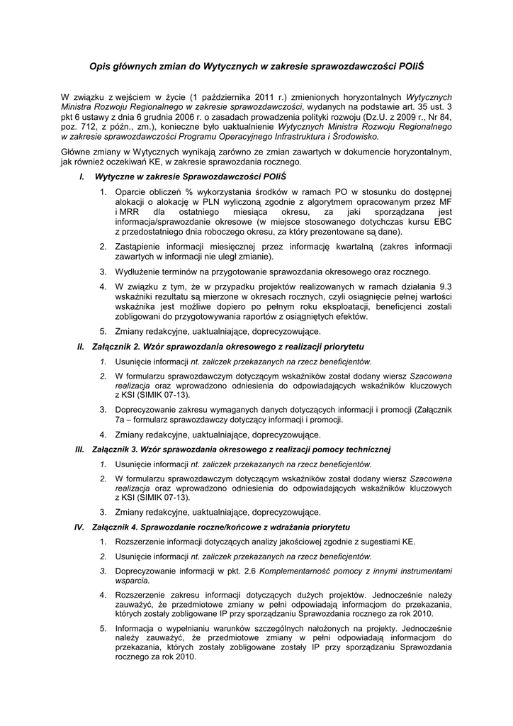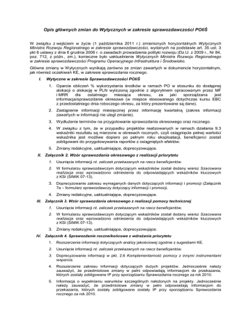 Opis głównych zmian do Wytycznych w zakresie sprawozdawczości POIiŚ W związku z wejściem w życie (1 października 2011 r.) zmienionych horyzontalnych Wytycznych Ministra Rozwoju Regionalnego w zakresie sprawozdawczości, wydanych na podstawie art. 35 ust. 3 pkt 6 ustawy z dnia 6 grudnia 2006 r. o zasadach prowadzenia polityki rozwoju (Dz.U. z 2009 r., Nr 84, poz. 712, z późn., zm.), konieczne było uaktualnienie Wytycznych Ministra Rozwoju Regionalnego w zakresie sprawozdawczości Programu Operacyjnego Infrastruktura i Środowisko. Główne zmiany w Wytycznych wynikają zarówno ze zmian zawartych w dokumencie horyzontalnym, jak również oczekiwań KE, w zakresie sprawozdania rocznego. I. Wytyczne w zakresie Sprawozdawczości POIiŚ 1. Oparcie obliczeń % wykorzystania środków w ramach PO w stosunku do dostępnej alokacji o alokację w PLN wyliczoną zgodnie z algorytmem opracowanym przez MF i MRR dla ostatniego miesiąca okresu, za jaki sporządzana jest informacja/sprawozdanie okresowe (w miejsce stosowanego dotychczas kursu EBC z przedostatniego dnia roboczego okresu, za który prezentowane są dane). 2. Zastąpienie informacji miesięcznej przez informację kwartalną (zakres informacji zawartych w informacji nie uległ zmianie). 3. Wydłużenie terminów na przygotowanie sprawozdania okresowego oraz rocznego. 4. W związku z tym, że w przypadku projektów realizowanych w ramach działania 9.3 wskaźniki rezultatu są mierzone w okresach rocznych, czyli osiągnięcie pełnej wartości wskaźnika jest możliwe dopiero po pełnym roku eksploatacji, beneficjenci zostali zobligowani do przygotowywania raportów z osiągniętych efektów. 5. Zmiany redakcyjne, uaktualniające, doprecyzowujące. II. Załącznik 2. Wzór sprawozdania okresowego z realizacji priorytetu 1. Usunięcie informacji nt. zaliczek przekazanych na rzecz beneficjentów. 2. W formularzu sprawozdawczym dotyczącym wskaźników został dodany wiersz Szacowana realizacja oraz wprowadzono odniesienia do odpowiadających wskaźników kluczowych z KSI (SIMIK 07-13). 3. Doprecyzowanie zakresu wymaganych danych dotyczących informacji i promocji (Załącznik 7a – formularz sprawozdawczy dotyczący informacji i promocji. 4. Zmiany redakcyjne, uaktualniające, doprecyzowujące. III. Załącznik 3. Wzór sprawozdania okresowego z realizacji pomocy technicznej 1. Usunięcie informacji nt. zaliczek przekazanych na rzecz beneficjentów. 2. W formularzu sprawozdawczym dotyczącym wskaźników został dodany wiersz Szacowana realizacja oraz wprowadzono odniesienia do odpowiadających wskaźników kluczowych z KSI (SIMIK 07-13). 3. Zmiany redakcyjne, uaktualniające, doprecyzowujące. IV. Załącznik 4. Sprawozdanie roczne/końcowe z wdrażania priorytetu 1. Rozszerzenie informacji dotyczących analizy jakościowej zgodnie z sugestiami KE. 2. Usunięcie informacji nt. zaliczek przekazanych na rzecz beneficjentów. 3. Doprecyzowanie informacji w pkt. 2.6 Komplementarność pomocy z innymi instrumentami wsparcia. 4. Rozszerzenie zakresu informacji dotyczących dużych projektów. Jednocześnie należy zauważyć, że przedmiotowe zmiany w pełni odpowiadają informacjom do przekazania, których zostały zobligowane IP przy sporządzaniu Sprawozdania rocznego za rok 2010. 5. Informacja o wypełnianiu warunków szczególnych nałożonych na projekty. Jednocześnie należy zauważyć, że przedmiotowe zmiany w pełni odpowiadają informacjom do przekazania, których zostały zobligowane zostały IP przy sporządzaniu Sprawozdania rocznego za rok 2010. 6. W formularzu sprawozdawczym dotyczącym wskaźników został dodany wiersz Szacowana realizacja oraz wprowadzono odniesienia do odpowiadających wskaźników kluczowych z KSI (SIMIK 07-13). Przedmiotowy formularz zawiera również tabele odnoszącą się do wskaźników monitorowania wpływu Programu Operacyjnego Infrastruktura i Środowisko na środowisko. 7. Doprecyzowanie zakresu wymaganych danych dotyczących informacji i promocji (Załącznik 7a – formularz sprawozdawczy dotyczący informacji i promocji). 8. Zmiany redakcyjne, uaktualniające, doprecyzowujące. V. Załącznik 5. Wzór sprawozdania okresowego z realizacji pomocy technicznej 1. Usunięcie informacji nt. zaliczek przekazanych na rzecz beneficjentów. 2. Doprecyzowanie informacji w pkt. 2.6 Komplementarność pomocy z innymi instrumentami wsparcia. 3. W formularzu sprawozdawczym dotyczącym wskaźników został dodany wiersz Szacowana realizacja oraz wprowadzono odniesienia do odpowiadających wskaźników kluczowych z KSI (SIMIK 07-13).