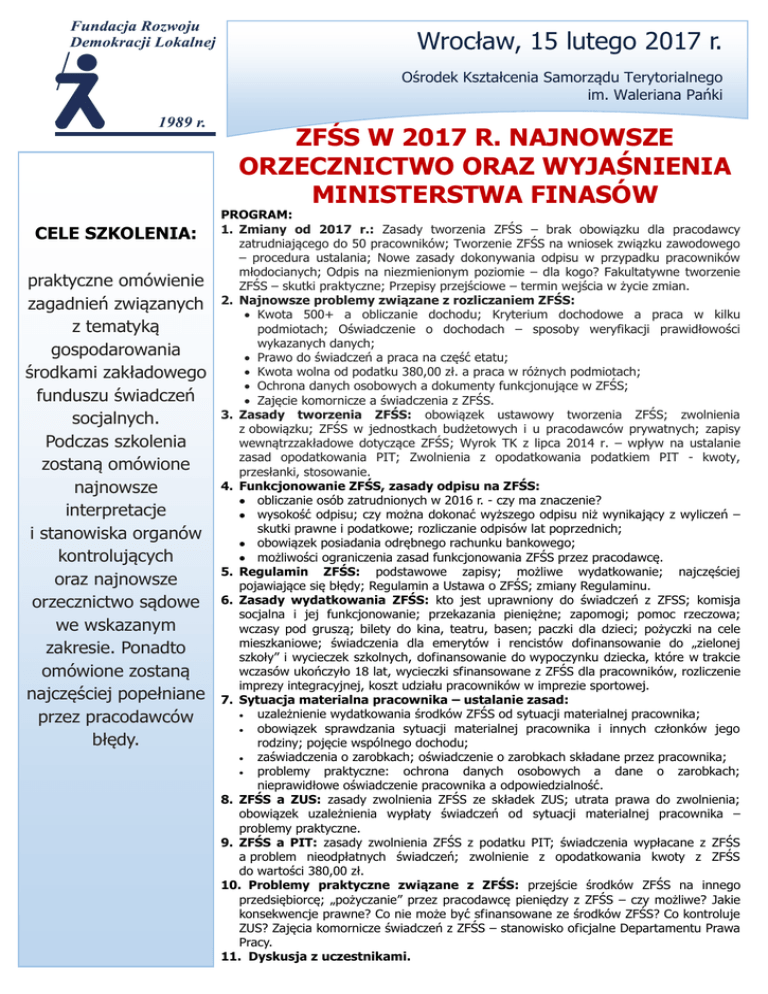 Rozwiązania informatyczne Wrocław, 15 lutego 2017 r. Ośrodek Kształcenia Samorządu Terytorialnego im. Waleriana Pańki ZFŚS W 2017 R. NAJNOWSZE ORZECZNICTWO ORAZ WYJAŚNIENIA MINISTERSTWA FINASÓW CELE SZKOLENIA: praktyczne omówienie zagadnień związanych z tematyką gospodarowania środkami zakładowego funduszu świadczeń socjalnych. Podczas szkolenia zostaną omówione najnowsze interpretacje i stanowiska organów kontrolujących oraz najnowsze orzecznictwo sądowe we wskazanym zakresie. Ponadto omówione zostaną najczęściej popełniane przez pracodawców błędy. PROGRAM: 1. Zmiany od 2017 r.: Zasady tworzenia ZFŚS – brak obowiązku dla pracodawcy zatrudniającego do 50 pracowników; Tworzenie ZFŚS na wniosek związku zawodowego – procedura ustalania; Nowe zasady dokonywania odpisu w przypadku pracowników młodocianych; Odpis na niezmienionym poziomie – dla kogo? Fakultatywne tworzenie ZFŚS – skutki praktyczne; Przepisy przejściowe – termin wejścia w życie zmian. 2. Najnowsze problemy związane z rozliczaniem ZFŚS: Kwota 500+ a obliczanie dochodu; Kryterium dochodowe a praca w kilku podmiotach; Oświadczenie o dochodach – sposoby weryfikacji prawidłowości wykazanych danych; Prawo do świadczeń a praca na część etatu; Kwota wolna od podatku 380,00 zł. a praca w różnych podmiotach; Ochrona danych osobowych a dokumenty funkcjonujące w ZFŚS; Zajęcie komornicze a świadczenia z ZFŚS. 3. Zasady tworzenia ZFŚS: obowiązek ustawowy tworzenia ZFŚS; zwolnienia z obowiązku; ZFŚS w jednostkach budżetowych i u pracodawców prywatnych; zapisy wewnątrzzakładowe dotyczące ZFŚS; Wyrok TK z lipca 2014 r. – wpływ na ustalanie zasad opodatkowania PIT; Zwolnienia z opodatkowania podatkiem PIT - kwoty, przesłanki, stosowanie. 4. Funkcjonowanie ZFŚS, zasady odpisu na ZFŚS: obliczanie osób zatrudnionych w 2016 r. - czy ma znaczenie? wysokość odpisu; czy można dokonać wyższego odpisu niż wynikający z wyliczeń – skutki prawne i podatkowe; rozliczanie odpisów lat poprzednich; obowiązek posiadania odrębnego rachunku bankowego; możliwości ograniczenia zasad funkcjonowania ZFŚS przez pracodawcę. 5. Regulamin ZFŚS: podstawowe zapisy; możliwe wydatkowanie; najczęściej pojawiające się błędy; Regulamin a Ustawa o ZFŚS; zmiany Regulaminu. 6. Zasady wydatkowania ZFŚS: kto jest uprawniony do świadczeń z ZFSS; komisja socjalna i jej funkcjonowanie; przekazania pieniężne; zapomogi; pomoc rzeczowa; wczasy pod gruszą; bilety do kina, teatru, basen; paczki dla dzieci; pożyczki na cele mieszkaniowe; świadczenia dla emerytów i rencistów dofinansowanie do „zielonej szkoły” i wycieczek szkolnych, dofinansowanie do wypoczynku dziecka, które w trakcie wczasów ukończyło 18 lat, wycieczki sfinansowane z ZFŚS dla pracowników, rozliczenie imprezy integracyjnej, koszt udziału pracowników w imprezie sportowej. 7. Sytuacja materialna pracownika – ustalanie zasad: uzależnienie wydatkowania środków ZFŚS od sytuacji materialnej pracownika; obowiązek sprawdzania sytuacji materialnej pracownika i innych członków jego rodziny; pojęcie wspólnego dochodu; zaświadczenia o zarobkach; oświadczenie o zarobkach składane przez pracownika; problemy praktyczne: ochrona danych osobowych a dane o zarobkach; nieprawidłowe oświadczenie pracownika a odpowiedzialność. 8. ZFŚS a ZUS: zasady zwolnienia ZFŚS ze składek ZUS; utrata prawa do zwolnienia; obowiązek uzależnienia wypłaty świadczeń od sytuacji materialnej pracownika – problemy praktyczne. 9. ZFŚS a PIT: zasady zwolnienia ZFŚS z podatku PIT; świadczenia wypłacane z ZFŚS a problem nieodpłatnych świadczeń; zwolnienie z opodatkowania kwoty z ZFŚS do wartości 380,00 zł. 10. Problemy praktyczne związane z ZFŚS: przejście środków ZFŚS na innego przedsiębiorcę; „pożyczanie” przez pracodawcę pieniędzy z ZFŚS – czy możliwe? Jakie konsekwencje prawne? Co nie może być sfinansowane ze środków ZFŚS? Co kontroluje ZUS? Zajęcia komornicze świadczeń z ZFŚS – stanowisko oficjalne Departamentu Prawa Pracy. 11. Dyskusja z uczestnikami. ADRESACI SZKOLE NIA: Kierownicy zakładów pracy, pracownicy działów kadr, członkowie komisji socjalnych działających w zakładzie pracy, przedstawiciele związków zawodowych, oraz wszystkie osoby zainteresowane tematyką szkolenia. DANE DO KONTAKTU: Ośrodek Kształcenia Samorządu Terytorialnego im. Waleriana Pańki 40-014 Katowice ul. Mariacka 1 NIP: 522-000-18-95 Tel 32 259 86 73, 32 253 84 09 Fax. 32 259 86 73 w. 22, 26 e-mail: [email protected] www.okst.pl OSOBA DO KONTAKTU: Marlena Moliszewska-Gumulak tel. 32 206 80 39, 32 206 98 43 w. 29 [email protected] KOD SZKOLENIA MIEJSCE SZKOLENIA: Wrocław, siedziba Ośrodka, ul. Piłsudskiego 49 - 57, III piętro. Mapkę dojazdu do miejsca szkolenia znajdą Państwo na www.okst.pl TERMIN SZKOLENIA: Wrocław: 15 lutego 2017 r., godz. 10.00 – 15.00 CENA: 339 zł netto/os. Udział w szkoleniu zwolniony z VAT w przypadku finansowania szkolenia ze środków publicznych. Cena zawiera materiały szkoleniowe, zaświadczenie o ukończeniu szkolenia, poczęstunek i serwis kawowy. RABAT 10% za każdą następną osobę zgłoszoną z tej samej instytucji ZGŁOSZENIA: Wypełnioną kartę zgłoszenia należy przesłać mailem lub faksem lub poprzez formularz na www.okst.pl do 11 lutego 2017 r. ☐ Wrocław 2124/17D/G Nazwa i adres nabywcy (dane do faktury) Nazwa i adres odbiorcy NIP Telefon Email 1. Imię i nazwisko uczestnika, stanowisko 2. Imię i nazwisko uczestnika, stanowisko 3. Imię i nazwisko uczestnika, stanowisko Oświadczam, że szkolenie dla ww. pracowników jest kształceniem zawodowym finansowanym w całości lub co najmniej 70% ze środków publicznych (proszę zaznaczyć właściwe) Członek FORUM (proszę zaznaczyć właściwe) UWAGA Ilość miejsc ograniczona. O udziale w szkoleniu decyduje kolejność zgłoszeń. Zgłoszenie na szkolenie musi zostać po
