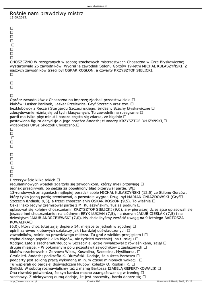 (6,0), który choć tutaj zajął dopiero 14. miejsce to jednak w zgodnej opinii zarówno klubowych działaczy jak i bardziej doświadczonych zawodników, rośnie na prawdziwego mistrza. Tu grał z wielkim przejęciem i chyba dlatego popełnił kilka błędów, ale tydzień wcześniej na turnieju „Lato z szachami” w Szczecinie, gdzie rywalizował z rówieśnikami, zajął drugie miejsce. - W pokonanym polu pozostawił zawodników z zasłużonych klubów szachowych z Gorzowa Wlkp., Koszalina, Szczecina, Myśliborza, Gryfic itd. – podkreśla K. Dłużyński. Dodaje, że sukces Bartosza podparty jest solidną pracą wykonaną m.in. w czasie minionych wakacji. Tu wspierali go bardziej doświadczeni klubowi koledzy O. Rosłon i K. Sielicki. W sobotę rozmawialiśmy też z mamą Bartosza IZABELĄ GEFERT-KOWALIK.