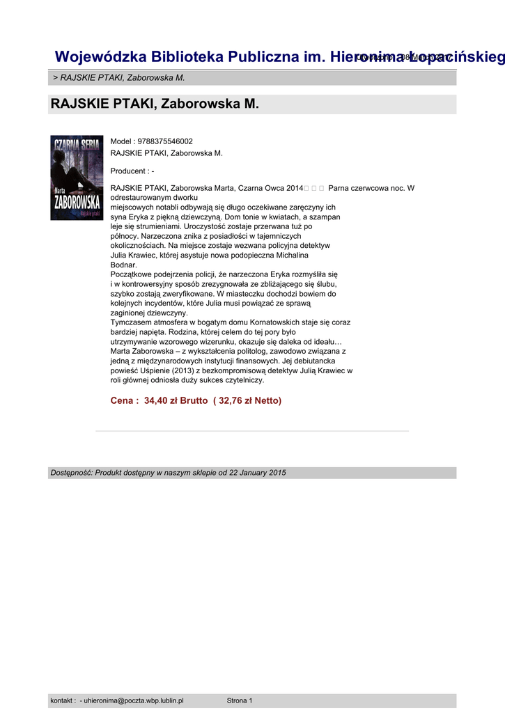 Utworzono : 08Łopacińskieg March 2017 Wojewódzka Biblioteka Publiczna im. Hieronima > RAJSKIE PTAKI, Zaborowska M. RAJSKIE PTAKI, Zaborowska M. Model : 9788375546002 RAJSKIE PTAKI, Zaborowska M. Producent : RAJSKIE PTAKI, Zaborowska Marta, Czarna Owca 2014��� Parna czerwcowa noc. W odrestaurowanym dworku miejscowych notabli odbywają się długo oczekiwane zaręczyny ich syna Eryka z piękną dziewczyną. Dom tonie w kwiatach, a szampan leje się strumieniami. Uroczystość zostaje przerwana tuż po północy. Narzeczona znika z posiadłości w tajemniczych okolicznościach. Na miejsce zostaje wezwana policyjna detektyw Julia Krawiec, której asystuje nowa podopieczna Michalina Bodnar. Początkowe podejrzenia policji, że narzeczona Eryka rozmyśliła się i w kontrowersyjny sposób zrezygnowała ze zbliżającego się ślubu, szybko zostają zweryfikowane. W miasteczku dochodzi bowiem do kolejnych incydentów, które Julia musi powiązać ze sprawą zaginionej dziewczyny. Tymczasem atmosfera w bogatym domu Kornatowskich staje się coraz bardziej napięta. Rodzina, której celem do tej pory było utrzymywanie wzorowego wizerunku, okazuje się daleka od ideału… Marta Zaborowska – z wykształcenia politolog, zawodowo związana z jedną z międzynarodowych instytucji finansowych. Jej debiutancka powieść Uśpienie (2013) z bezkompromisową detektyw Julią Krawiec w roli głównej odniosła duży sukces czytelniczy. Cena : 34,40 zł Brutto ( 32,76 zł Netto) Dostępność: Produkt dostępny w naszym sklepie od 22 January 2015 kontakt : - [email protected] Strona 1
