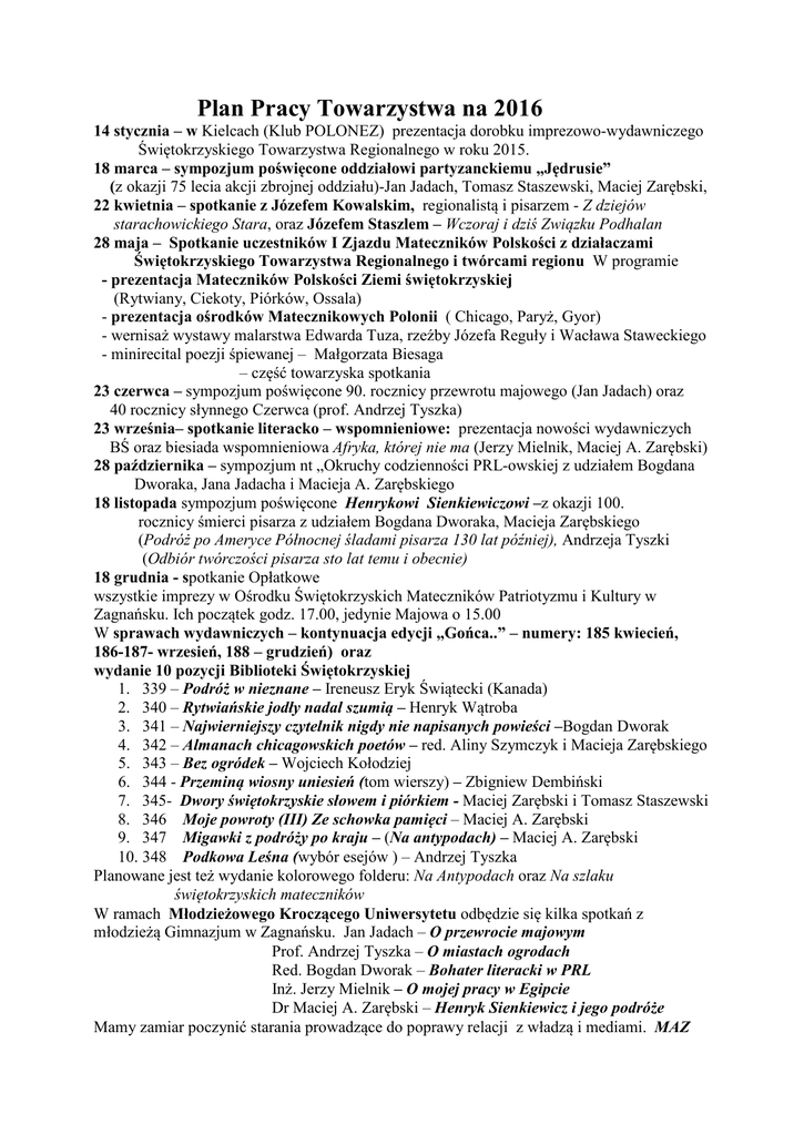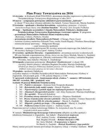 Plan Pracy Towarzystwa na 2016 14 stycznia – w Kielcach (Klub POLONEZ) prezentacja dorobku imprezowo-wydawniczego Świętokrzyskiego Towarzystwa Regionalnego w roku 2015. 18 marca – sympozjum poświęcone oddziałowi partyzanckiemu „Jędrusie” (z okazji 75 lecia akcji zbrojnej oddziału)-Jan Jadach, Tomasz Staszewski, Maciej Zarębski, 22 kwietnia – spotkanie z Józefem Kowalskim, regionalistą i pisarzem - Z dziejów starachowickiego Stara, oraz Józefem Staszlem – Wczoraj i dziś Związku Podhalan 28 maja – Spotkanie uczestników I Zjazdu Mateczników Polskości z działaczami Świętokrzyskiego Towarzystwa Regionalnego i twórcami regionu W programie - prezentacja Mateczników Polskości Ziemi świętokrzyskiej (Rytwiany, Ciekoty, Piórków, Ossala) - prezentacja ośrodków Matecznikowych Polonii ( Chicago, Paryż, Gyor) - wernisaż wystawy malarstwa Edwarda Tuza, rzeźby Józefa Reguły i Wacława Staweckiego - minirecital poezji śpiewanej – Małgorzata Biesaga – część towarzyska spotkania 23 czerwca – sympozjum poświęcone 90. rocznicy przewrotu majowego (Jan Jadach) oraz 40 rocznicy słynnego Czerwca (prof. Andrzej Tyszka) 23 września– spotkanie literacko – wspomnieniowe: prezentacja nowości wydawniczych BŚ oraz biesiada wspomnieniowa Afryka, której nie ma (Jerzy Mielnik, Maciej A. Zarębski) 28 października – sympozjum nt „Okruchy codzienności PRL-owskiej z udziałem Bogdana Dworaka, Jana Jadacha i Macieja A. Zarębskiego 18 listopada sympozjum poświęcone Henrykowi Sienkiewiczowi –z okazji 100. rocznicy śmierci pisarza z udziałem Bogdana Dworaka, Macieja Zarębskiego (Podróż po Ameryce Północnej śladami pisarza 130 lat później), Andrzeja Tyszki (Odbiór twórczości pisarza sto lat temu i obecnie) 18 grudnia - spotkanie Opłatkowe wszystkie imprezy w Ośrodku Świętokrzyskich Mateczników Patriotyzmu i Kultury w Zagnańsku. Ich początek godz. 17.00, jedynie Majowa o 15.00 W sprawach wydawniczych – kontynuacja edycji „Gońca..” – numery: 185 kwiecień, 186-187- wrzesień, 188 – grudzień) oraz wydanie 10 pozycji Biblioteki Świętokrzyskiej 1. 339 – Podróż w nieznane – Ireneusz Eryk Świątecki (Kanada) 2. 340 – Rytwiańskie jodły nadal szumią – Henryk Wątroba 3. 341 – Najwierniejszy czytelnik nigdy nie napisanych powieści –Bogdan Dworak 4. 342 – Almanach chicagowskich poetów – red. Aliny Szymczyk i Macieja Zarębskiego 5. 343 – Bez ogródek – Wojciech Kołodziej 6. 344 - Przeminą wiosny uniesień (tom wierszy) – Zbigniew Dembiński 7. 345- Dwory świętokrzyskie słowem i piórkiem - Maciej Zarębski i Tomasz Staszewski 8. 346 Moje powroty (III) Ze schowka pamięci – Maciej A. Zarębski 9. 347 Migawki z podróży po kraju – (Na antypodach) – Maciej A. Zarębski 10. 348 Podkowa Leśna (wybór esejów ) – Andrzej Tyszka Planowane jest też wydanie kolorowego folderu: Na Antypodach oraz Na szlaku świętokrzyskich mateczników W ramach Młodzieżowego Kroczącego Uniwersytetu odbędzie się kilka spotkań z młodzieżą Gimnazjum w Zagnańsku. Jan Jadach – O przewrocie majowym Prof. Andrzej Tyszka – O miastach ogrodach Red. Bogdan Dworak – Bohater literacki w PRL Inż. Jerzy Mielnik – O mojej pracy w Egipcie Dr Maciej A. Zarębski – Henryk Sienkiewicz i jego podróże Mamy zamiar poczynić starania prowadzące do poprawy relacji z władzą i mediami. MAZ
