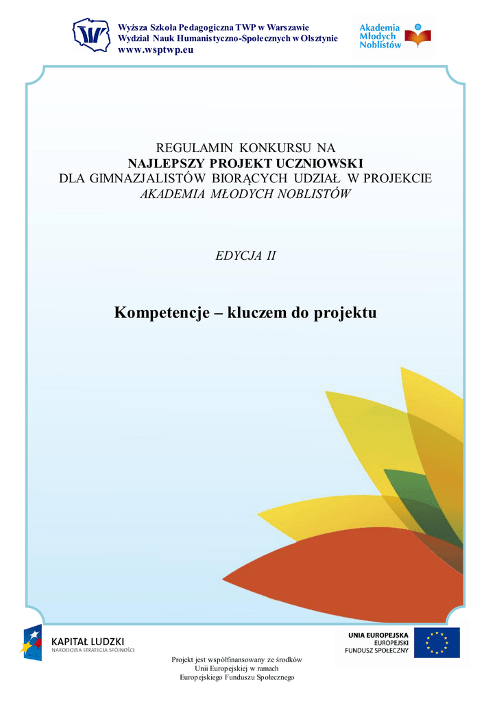 Wyższa Szkoła Pedagogiczna TWP w Warszawie Wydział Nauk Humanistyczno-Społecznych w Olsztynie www.wsptwp.eu REGULAMIN KONKURSU NA NAJLEPSZY PROJEKT UCZNIOWSKI DLA GIMNAZJALISTÓW BIORĄCYCH UDZIAŁ W PROJEKCIE AKADEMIA MŁODYCH NOBLISTÓW EDYCJA II Kompetencje – kluczem do projektu Projekt jest współfinansowany ze środków Unii Europejskiej w ramach Europejskiego Funduszu Społecznego Wyższa Szkoła Pedagogiczna TWP w Warszawie Wydział Nauk Humanistyczno-Społecznych w Olsztynie www.wsptwp.eu §1 Organizator Organizatorem konkursu jest Wyższa Szkoła Pedagogiczna TWP w Warszawie, Wydział Nauk Humanistyczno-Społecznych w Olsztynie, realizująca projekt Akademia Młodych Noblistów, współfinansowany przez Europejski Fundusz Społeczny, w ramach Programu Operacyjnego Kapitał Ludzki Priorytetu III – Wysoka jakość systemu oświaty Działania 3. 3. Poprawa jakości kształcenia Poddziałania 3. 3. 4. Modernizacja treści i metod kształcenia. §2 Cele konkursu 1. Umożliwienie gimnazjalistom zaprezentowania projektów uczniowskich stworzonych w ramach projektu Akademia Młodych Noblistów; 2. Wzmocnienie postaw współdziałania między uczniami i nauczycielami, rozwiązywania przez nich problemów w twórczy sposób, rozwijanie umiejętności analitycznych, pracy zadaniowej w tym planowania, współpracy, a także komunikacji i samooceny; 3. Rozwijanie zainteresowań uczniów z zakresu: nauk matematyczno-przyrodniczych, technik informacyjno-komunikacyjnych (ICT) oraz języków obcych; 4. Rozwijanie kompetencji kluczowych uczniów poprzez pracę metodą projektową; 5. Wspieranie aktywnych metod nauczania według programów autorskich opracowanych w ramach Akademii; 6. Propagowanie działalności naukowej wśród gimnazjalistów; 7. Wyłonienie najciekawszych edukacyjnych projektów uczniowskich; 8. Wykorzystanie technik ICT w nauce. §3 Temat konkursu Kompetencje - kluczem do projektu EDYCJA II §4 Uczestnicy Konkurs adresowany jest do gimnazjalistów biorących udział w projekcie Akademia Młodych Noblistów, współfinansowanym przez Europejski Fundusz Społeczny, w ramach Programu Operacyjnego Kapitał Ludzki Priorytetu III – Wysoka, jakość systemu oświaty Działania 3. 3. Poprawa, jakości kształcenia Poddziałania 3. 3. 4. Modernizacja treści i metod kształcenia. Projekt jest współfinansowany ze środków Unii Europejskiej w ramach Europejskiego Funduszu Społecznego Wyższa Szkoła Pedagogiczna TWP w Warszawie Wydział Nauk Humanistyczno-Społecznych w Olsztynie www.wsptwp.eu §5 Warunki uczestnictwa 1. W konkursie mogą wziąć udział projekty uczniowskie opracowane w ramach laboratoriów naukowych. Projekt uczniowski, powinien być zespołowym, planowanym działaniem uczniów, mającym na celu rozwiązanie konkretnego problemu, z zastosowaniem różnorodnych metod. 2. Uczniowie mogą realizować projekty w zespołach laboratoryjnych liczących 2-4 osoby. Uczeń może brać udział w realizacji jednego projektu w ramach konkursu. 3. Zakres tematyczny projektu uczniowskiego może dotyczyć wybranych treści nauczania określonych w programach autorskich opracowanych na potrzeby Akademii Młodych Noblistów lub wykraczać poza te treści. Może mieć, więc charakter przedmiotowy lub między przedmiotowy. Powinien być przygotowany w roku szkolnym 2011/2012. 4. Projekty mogą mieć charakter szkolno-edukacyjny, dziennikarski, plastyczny, muzyczny, performatywny, obywatelski i powinny być zrealizowane w formie prac pisemnych, utworów graficznych, muzycznych, audio-wizualnych, prezentacji multimedialnych lub internetowych, happeningów, spektakli ulicznych lub w innych formach odpowiednich do tematyki konkursu. 5. Praca powinna być wynikiem własnej twórczości uczniów i nie powinna naruszać praw autorskich oraz jakichkolwiek innych praw osób trzecich oraz nie powinna być zgłoszona do innych konkursów o podobnej tematyce, które będą ogłoszone w przyszłości przez organizatorów lub inne podmioty. 6. Projekt zgłoszony do konkursu może zostać wykorzystany, jako gimnazjalny projekt edukacyjny. 7. Liczba zgłoszonych projektów do konkursu ponadregionalnego, który odbędzie się 25 maja 2012 roku podczas Festynu Naukowego, jest uzależniona od liczby uczniów należących do Interdyscyplinarnego Szkolnego Ruchu Naukowego: ISRN z liczbą uczniów do 100 - możliwość zgłoszenia tylko 1 projektu; ISRN z liczbą uczniów 100 i więcej - możliwość zgłoszenia maksymalnie 2projektów. 8. Wybrane projekty, które będą reprezentować szkoły w konkursie ponadregionalnym, należy przesłać pocztą wraz z Kartą informacyjną projektu na adres biura projektu Akademia Młodych Noblistów, ul. Sikorskiego 23, 10-088 Olsztyn do dnia 2 kwietnia 2012 r. (liczy się data nadania). Projekty należy odpowiednio zabezpieczyć przed zniszczeniem. Formy spektaklu, happeningu, itp. należy nagrać, jako film w pliku .avi lub .wmv. 9. Prace zarejestrowane na stronie internetowej www.akademiamlodychnoblistów.pl po terminie, nie podlegają ocenie. Wpisują się one w bazę projektów utworzoną dla potrzeb projektu Akademia Młodych Noblistów. Projekt jest współfinansowany ze środków Unii Europejskiej w ramach Europejskiego Funduszu Społecznego Wyższa Szkoła Pedagogiczna TWP w Warszawie Wydział Nauk Humanistyczno-Społecznych w Olsztynie www.wsptwp.eu 10. Udział w konkursie jest bezpłatny. Organizator pokrywa koszty przejazdów uczestników i opiekunów na eliminacje ponadregionalne do wysokości wartości ceny najtańszego biletu transportu publicznego, według zasad zwrotu kosztów dojazdów na Festyn Naukowy w ramach PAMN. §6 Etapy konkursu I. II. Etap – przygotowanie projektu. Projekt uczniowski obejmować powinien następujące działania, które ma realizować zespół uczniów pod opieką nauczyciela prowadzącego laboratorium: powołanie grupy projektowej; wybranie tematu projektu edukacyjnego; określenie celów projektu edukacyjnego 