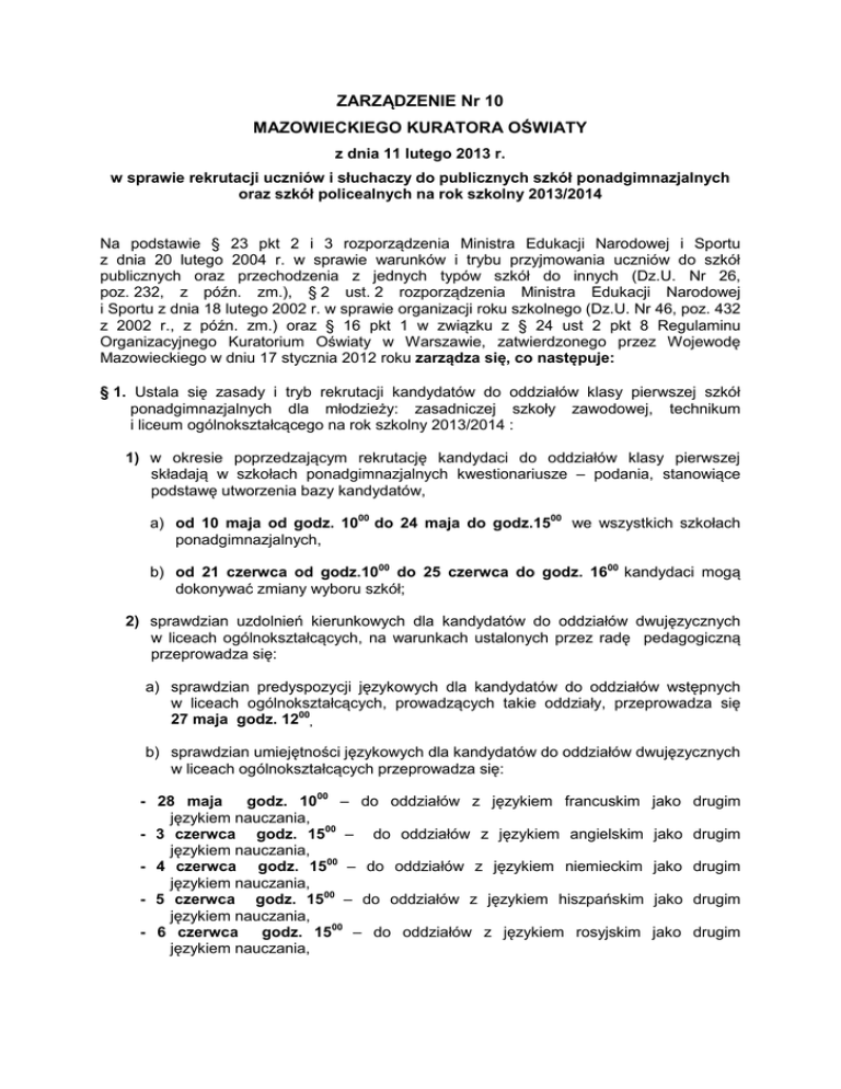 ZARZĄDZENIE Nr 10 MAZOWIECKIEGO KURATORA OŚWIATY z dnia 11 lutego 2013 r. w sprawie rekrutacji uczniów i słuchaczy do publicznych szkół ponadgimnazjalnych oraz szkół policealnych na rok szkolny 2013/2014 Na podstawie § 23 pkt 2 i 3 rozporządzenia Ministra Edukacji Narodowej i Sportu z dnia 20 lutego 2004 r. w sprawie warunków i trybu przyjmowania uczniów do szkół publicznych oraz przechodzenia z jednych typów szkół do innych (Dz.U. Nr 26, poz. 232, z późn. zm.), § 2 ust. 2 rozporządzenia Ministra Edukacji Narodowej i Sportu z dnia 18 lutego 2002 r. w sprawie organizacji roku szkolnego (Dz.U. Nr 46, poz. 432 z 2002 r., z późn. zm.) oraz § 16 pkt 1 w związku z § 24 ust 2 pkt 8 Regulaminu Organizacyjnego Kuratorium Oświaty w Warszawie, zatwierdzonego przez Wojewodę Mazowieckiego w dniu 17 stycznia 2012 roku zarządza się, co następuje: § 1. Ustala się zasady i tryb rekrutacji kandydatów do oddziałów klasy pierwszej szkół ponadgimnazjalnych dla młodzieży: zasadniczej szkoły zawodowej, technikum i liceum ogólnokształcącego na rok szkolny 2013/2014 : 1) w okresie poprzedzającym rekrutację kandydaci do oddziałów klasy pierwszej składają w szkołach ponadgimnazjalnych kwestionariusze – podania, stanowiące podstawę utworzenia bazy kandydatów, a) od 10 maja od godz. 1000 do 24 maja do godz.1500 we wszystkich szkołach ponadgimnazjalnych, b) od 21 czerwca od godz.1000 do 25 czerwca do godz. 1600 kandydaci mogą dokonywać zmiany wyboru szkół; 2) sprawdzian uzdolnień kierunkowych dla kandydatów do oddziałów dwujęzycznych w liceach ogólnokształcących, na warunkach ustalonych przez radę pedagogiczną przeprowadza się: a) sprawdzian predyspozycji językowych dla kandydatów do oddziałów wstępnych w liceach ogólnokształcących, prowadzących takie oddziały, przeprowadza się 27 maja godz. 1200, b) sprawdzian umiejętności językowych dla kandydatów do oddziałów dwujęzycznych w liceach ogólnokształcących przeprowadza się: - 28 maja godz. 1000 – do oddziałów z językiem francuskim językiem nauczania, - 3 czerwca godz. 1500 – do oddziałów z językiem angielskim językiem nauczania, - 4 czerwca godz. 1500 – do oddziałów z językiem niemieckim językiem nauczania, - 5 czerwca godz. 1500 – do oddziałów z językiem hiszpańskim językiem nauczania, - 6 czerwca godz. 1500 – do oddziałów z językiem rosyjskim językiem nauczania, jako drugim jako drugim jako drugim jako drugim jako drugim 2 c) 12 czerwca godz. 1500 upływa ostateczny termin ogłoszenia wyników sprawdzianów uzdolnień kierunkowych przeprowadzonych w terminach podanych w § 1 pkt 2 lit. a, b, d) kandydaci, którzy z udokumentowanych przyczyn losowych nie przystąpili do sprawdzianu uzdolnień kierunkowych w wymienionych terminach lub dokonali w dniach 21 – 25 czerwca zmiany wyboru na szkołę z oddziałami, do których przeprowadza się sprawdzian uzdolnień kierunkowych, mogą do niego przystąpić 26 czerwca godz. 1300, e) 27 czerwca godz. 1500 upływa ostateczny termin ogłoszenia wyników sprawdzianu uzdolnień kierunkowych przeprowadzonych w terminach podanych w § 1 pkt 2 lit. d; 3) terminy rekrutacji kandydatów na rok szkolny 2013/2014 do oddziałów klasy pierwszej szkół ponadgimnazjalnych dla młodzieży: liceum ogólnokształcącego, zasadniczej szkoły zawodowej, technikum, a) od 28 czerwca od godz. 1100 do 1 lipca do godz. 1600 kandydaci składają do (nie więcej niż trzech) szkół kopie świadectwa ukończenia gimnazjum oraz kopie zaświadczenia o szczegółowych wynikach egzaminu przeprowadzanego w ostatnim roku nauki w gimnazjum, poświadczone za zgodność z oryginałem przez dyrektora gimnazjum, które kandydat ukończył. Na każdej stronie kopii należy umieścić adnotację: „Stwierdzam zgodność z oryginałem”, datę, pieczęć urzędową szkoły o średnicy 36 mm oraz pieczęć imienną dyrektora szkoły i podpis dyrektora lub upoważnionej przez niego osoby. Kandydaci składają dokumenty, o których mowa powyżej, w szkołach, w których mają złożone kwestionariusze – podania. W miastach, w których funkcjonuje elektroniczne wspomaganie rekrutacji, a kandydat wybrał trzy szkoły w jednym mieście, może złożyć jedną kopię świadectwa i zaświadczenia o szczegółowych wynikach egzaminu przeprowadzanego w ostatnim roku nauki w gimnazjum w szkole pierwszego wyboru, b) od 2 lipca godz. 900 do 4 lipca godz. 1500 szkolne komisje rekrutacyjno kwalifikacyjne prowadzą postępowanie rekrutacyjne według przyjętych w szkole procedur, c) do 4 lipca do godz. 1600 szkolne komisje rekrutacyjno-kwalifikacyjne ogłaszają listy kandydatów zakwalifikowanych do przyjęcia do oddziałów klasy pierwszej wraz z liczbą punktów i listy kandydatów niezakwalifikowanych do przyjęcia do oddziałów klasy pierwszej wraz z liczbą punktów, uwzględniając zasadę umieszczania kandydatów na listach w kolejności, zgodnie z liczbą uzyskanych punktów oraz kryteriami zawartymi w statucie szkoły, d) 5 lipca od godz. 900 do 8 lipca do godz. 1500 kandydaci umieszczeni na listach kandydatów zakwalifikowanych do przyjęcia składają oświadczenia potwierdzające wolę podjęcia nauki w danej szkole oraz oryginał świadectwa i oryginał zaświadczenia o szczegółowych wynikach egzaminu przeprowadzanego w ostatnim roku nauki w gimnazjum. Kandydaci otrzymują ze szkoły prowadzącej kształcenie zawodowe skierowanie na badanie do lekarza medycyny pracy, który wydaje zaświadczenie lekarskie o braku przeciwwskazań zdrowotnych do kształcenia w określonym zawodzie (zaświadczenie należy złożyć do 26 sierpnia w sekretariacie szkoły), 3 e) 8 lipca do godz. 1600 szkolne komisje rekrutacyjno-kwalifikacyjne ogłaszają listy kandydatów przyjętych do szkoły wraz z liczbą punktów, którzy potwierdzili wolę uczęszczania do wybranej szkoły, uwzględniając zasadę umieszczania nazwisk na liście w kolejności, zgodni
