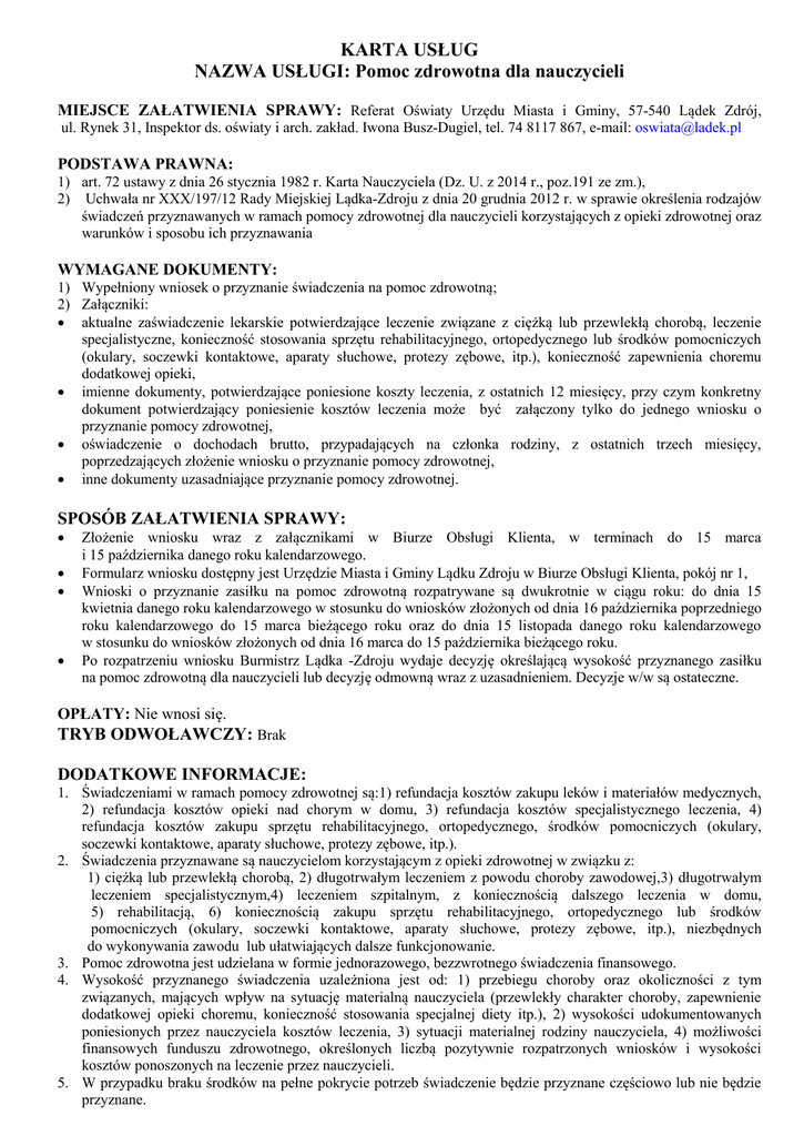 KARTA USŁUG NAZWA USŁUGI: Pomoc zdrowotna dla nauczycieli MIEJSCE ZAŁATWIENIA SPRAWY: Referat Oświaty Urzędu Miasta i Gminy, 57-540 Lądek Zdrój, ul. Rynek 31, Inspektor ds. oświaty i arch. zakład. Iwona Busz-Dugiel, tel. 74 8117 867, e-mail: [email protected] PODSTAWA PRAWNA: 1) art. 72 ustawy z dnia 26 stycznia 1982 r. Karta Nauczyciela (Dz. U. z 2014 r., poz.191 ze zm.), 2) Uchwała nr XXX/197/12 Rady Miejskiej Lądka-Zdroju z dnia 20 grudnia 2012 r. w sprawie określenia rodzajów świadczeń przyznawanych w ramach pomocy zdrowotnej dla nauczycieli korzystających z opieki zdrowotnej oraz warunków i sposobu ich przyznawania WYMAGANE DOKUMENTY: 1) Wypełniony wniosek o przyznanie świadczenia na pomoc zdrowotną; 2) Załączniki: aktualne zaświadczenie lekarskie potwierdzające leczenie związane z ciężką lub przewlekłą chorobą, leczenie specjalistyczne, konieczność stosowania sprzętu rehabilitacyjnego, ortopedycznego lub środków pomocniczych (okulary, soczewki kontaktowe, aparaty słuchowe, protezy zębowe, itp.), konieczność zapewnienia choremu dodatkowej opieki, imienne dokumenty, potwierdzające poniesione koszty leczenia, z ostatnich 12 miesięcy, przy czym konkretny dokument potwierdzający poniesienie kosztów leczenia może być załączony tylko do jednego wniosku o przyznanie pomocy zdrowotnej, oświadczenie o dochodach brutto, przypadających na członka rodziny, z ostatnich trzech miesięcy, poprzedzających złożenie wniosku o przyznanie pomocy zdrowotnej, inne dokumenty uzasadniające przyznanie pomocy zdrowotnej. SPOSÓB ZAŁATWIENIA SPRAWY: Złożenie wniosku wraz z załącznikami w Biurze Obsługi Klienta, w terminach do 15 marca i 15 października danego roku kalendarzowego. Formularz wniosku dostępny jest Urzędzie Miasta i Gminy Lądku Zdroju w Biurze Obsługi Klienta, pokój nr 1, Wnioski o przyznanie zasiłku na pomoc zdrowotną rozpatrywane są dwukrotnie w ciągu roku: do dnia 15 kwietnia danego roku kalendarzowego w stosunku do wniosków złożonych od dnia 16 października poprzedniego roku kalendarzowego do 15 marca bieżącego roku oraz do dnia 15 listopada danego roku kalendarzowego w stosunku do wniosków złożonych od dnia 16 marca do 15 października bieżącego roku. Po rozpatrzeniu wniosku Burmistrz Lądka -Zdroju wydaje decyzję określającą wysokość przyznanego zasiłku na pomoc zdrowotną dla nauczycieli lub decyzję odmowną wraz z uzasadnieniem. Decyzje w/w są ostateczne. OPŁATY: Nie wnosi się. TRYB ODWOŁAWCZY: Brak DODATKOWE INFORMACJE: 1. Świadczeniami w ramach pomocy zdrowotnej są:1) refundacja kosztów zakupu leków i materiałów medycznych, 2) refundacja kosztów opieki nad chorym w domu, 3) refundacja kosztów specjalistycznego leczenia, 4) refundacja kosztów zakupu sprzętu rehabilitacyjnego, ortopedycznego, środków pomocniczych (okulary, soczewki kontaktowe, aparaty słuchowe, protezy zębowe, itp.). 2. Świadczenia przyznawane są nauczycielom korzystającym z opieki zdrowotnej w związku z: 1) ciężką lub przewlekłą chorobą, 2) długotrwałym leczeniem z powodu choroby zawodowej,3) długotrwałym leczeniem specjalistycznym,4) leczeniem szpitalnym, z koniecznością dalszego leczenia w domu, 5) rehabilitacją, 6) koniecznością zakupu sprzętu rehabilitacyjnego, ortopedycznego lub środków pomocniczych (okulary, soczewki kontaktowe, aparaty słuchowe, protezy zębowe, itp.), niezbędnych do wykonywania zawodu lub ułatwiających dalsze funkcjonowanie. 3. Pomoc zdrowotna jest udzielana w formie jednorazowego, bezzwrotnego świadczenia finansowego. 4. Wysokość przyznanego świadczenia uzależniona jest od: 1) przebiegu choroby oraz okoliczności z tym związanych, mających wpływ na sytuację materialną nauczyciela (przewlekły charakter choroby, zapewnienie dodatkowej opieki choremu, konieczność stosowania specjalnej diety itp.), 2) wysokości udokumentowanych poniesionych przez nauczyciela kosztów leczenia, 3) sytuacji materialnej rodziny nauczyciela, 4) możliwości finansowych funduszu zdrowotnego, określonych liczbą pozytywnie rozpatrzonych wniosków i wysokości kosztów ponoszonych na leczenie przez nauczycieli. 5. W przypadku braku środków na pełne pokrycie potrzeb świadczenie będzie przyznane częściowo lub nie będzie przyznane.
