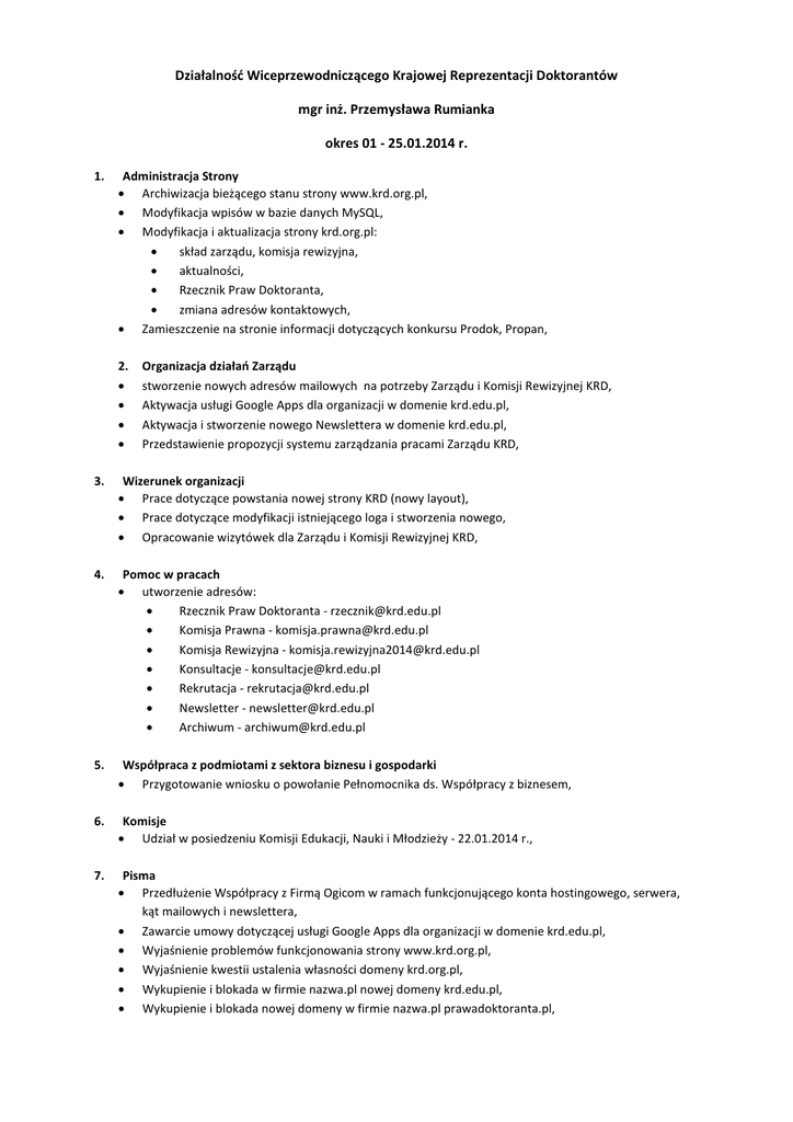 Działalność Wiceprzewodniczącego Krajowej Reprezentacji Doktorantów mgr inż. Przemysława Rumianka okres 01 - 25.01.2014 r. 1. Administracja Strony • Archiwizacja bieżącego stanu strony www.krd.org.pl, • Modyfikacja wpisów w bazie danych MySQL, • Modyfikacja i aktualizacja strony krd.org.pl: • skład zarządu, komisja rewizyjna, • aktualności, • Rzecznik Praw Doktoranta, • zmiana adresów kontaktowych, • Zamieszczenie na stronie informacji dotyczących konkursu Prodok, Propan, 2. • • • • Organizacja działań Zarządu stworzenie nowych adresów mailowych na potrzeby Zarządu i Komisji Rewizyjnej KRD, Aktywacja usługi Google Apps dla organizacji w domenie krd.edu.pl, Aktywacja i stworzenie nowego Newslettera w domenie krd.edu.pl, Przedstawienie propozycji systemu zarządzania pracami Zarządu KRD, 3. Wizerunek organizacji • Prace dotyczące powstania nowej strony KRD (nowy layout), • Prace dotyczące modyfikacji istniejącego loga i stworzenia nowego, • Opracowanie wizytówek dla Zarządu i Komisji Rewizyjnej KRD, 4. Pomoc w pracach • utworzenie adresów: • Rzecznik Praw Doktoranta - [email protected] • Komisja Prawna - [email protected] • Komisja Rewizyjna - [email protected] • Konsultacje - [email protected] • Rekrutacja - [email protected] • Newsletter - [email protected] • Archiwum - [email protected] 5. Współpraca z podmiotami z sektora biznesu i gospodarki • Przygotowanie wniosku o powołanie Pełnomocnika ds. Współpracy z biznesem, 6. Komisje • Udział w posiedzeniu Komisji Edukacji, Nauki i Młodzieży - 22.01.2014 r., 7. Pisma • Przedłużenie Współpracy z Firmą Ogicom w ramach funkcjonującego konta hostingowego, serwera, kąt mailowych i newslettera, • Zawarcie umowy dotyczącej usługi Google Apps dla organizacji w domenie krd.edu.pl, • Wyjaśnienie problemów funkcjonowania strony www.krd.org.pl, • Wyjaśnienie kwestii ustalenia własności domeny krd.org.pl, • Wykupienie i blokada w firmie nazwa.pl nowej domeny krd.edu.pl, • Wykupienie i blokada nowej domeny w firmie nazwa.pl prawadoktoranta.pl,