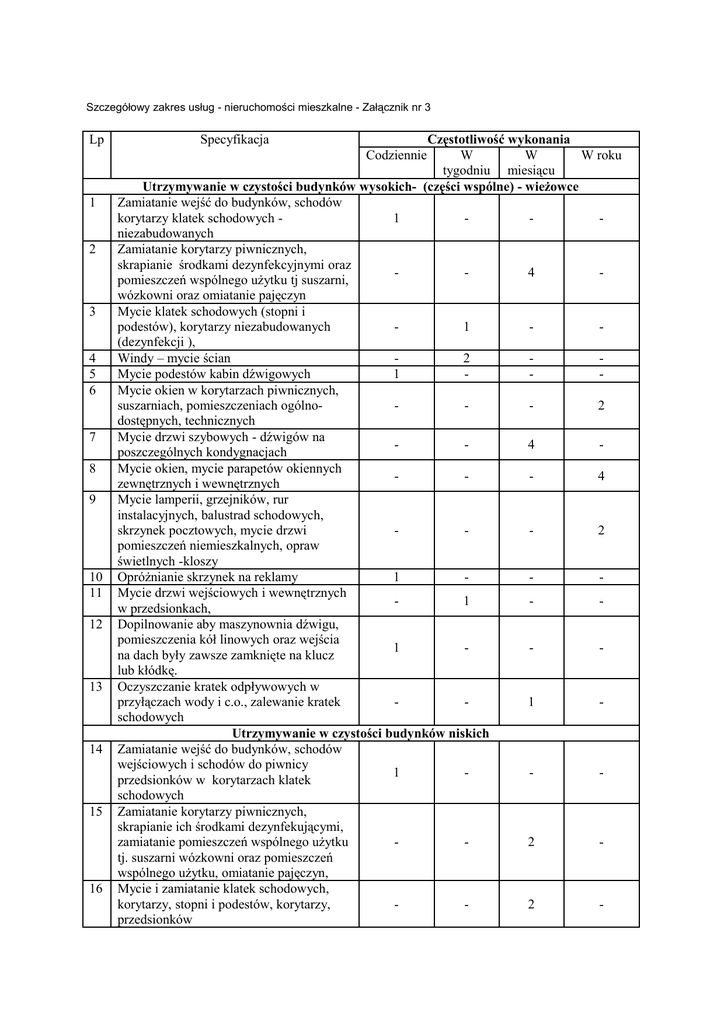 Szczegółowy zakres usług - nieruchomości mieszkalne - Załącznik nr 3 Lp Specyfikacja Częstotliwość wykonania W W W roku tygodniu miesiącu Utrzymywanie w czystości budynków wysokich- (części wspólne) - wieżowce Zamiatanie wejść do budynków, schodów korytarzy klatek schodowych 1 niezabudowanych Zamiatanie korytarzy piwnicznych, skrapianie środkami dezynfekcyjnymi oraz 4 pomieszczeń wspólnego użytku tj suszarni, wózkowni oraz omiatanie pajęczyn Mycie klatek schodowych (stopni i podestów), korytarzy niezabudowanych 1 (dezynfekcji ), Windy – mycie ścian 2 Mycie podestów kabin dźwigowych 1 Mycie okien w korytarzach piwnicznych, suszarniach, pomieszczeniach ogólno2 dostępnych, technicznych Mycie drzwi szybowych - dźwigów na 4 poszczególnych kondygnacjach Mycie okien, mycie parapetów okiennych 4 zewnętrznych i wewnętrznych Mycie lamperii, grzejników, rur instalacyjnych, balustrad schodowych, skrzynek pocztowych, mycie drzwi 2 pomieszczeń niemieszkalnych, opraw świetlnych -kloszy Opróżnianie skrzynek na reklamy 1 Mycie drzwi wejściowych i wewnętrznych 1 w przedsionkach, Dopilnowanie aby maszynownia dźwigu, pomieszczenia kół linowych oraz wejścia 1 na dach były zawsze zamknięte na klucz lub kłódkę. Oczyszczanie kratek odpływowych w przyłączach wody i c.o., zalewanie kratek 1 schodowych Utrzymywanie w czystości budynków niskich Zamiatanie wejść do budynków, schodów wejściowych i schodów do piwnicy 1 przedsionków w korytarzach klatek schodowych Zamiatanie korytarzy piwnicznych, skrapianie ich środkami dezynfekującymi, zamiatanie pomieszczeń wspólnego użytku 2 tj. suszarni wózkowni oraz pomieszczeń wspólnego użytku, omiatanie pajęczyn, Mycie i zamiatanie klatek schodowych, korytarzy, stopni i podestów, korytarzy, 2 przedsionków Codziennie 1 2 3 4 5 6 7 8 9 10 11 12 13 14 15 16 Szczegółowy zakres usług - nieruchomości mieszkalne - Załącznik nr 3 17 18 19 20 21 22 23 24 1 2 3 4 5 6 7 8 9 10 11 12 13 14 Mycie okien na klatkach schodowych, parapetów wewnętrznych i zewnętrznych, 4 witrolitów i balustrad, Mycie okien w korytarzach piwnicznych, suszarniach, pomieszczeniach ogólno2 dostępnych, technicznych ścieranie kurzu ze skrzynek pocztowych, gablot, tablic informacyjnych, usuwanie 1 pajęczyn Mycie drzwi wejściowych, parapetów 1 okiennych na klatkach Mycie balustrad schodowych, mycie lamperii, grzejników, rur instalacyjnych, skrzynek pocztowych na klatkach 2 schodowych, mycie drzwi pomieszczeń niemieszkalnych, opraw świetlnych -kloszy Opróżnianie skrzynek na reklamy 1 Dopilnowanie aby włazy dachowe były 1 pozamykane na klucz, kłódkę Oczyszczanie kratek odpływowych w przyłączach wody i co, zalewanie kratek 1 wodą Sprzątanie powierzchni zewnętrznych oraz konserwacja terenów zielonych Sprzątanie śmieci, liści, błota odchodów zwierzęcych z zewnętrznych ciągów komunikacyjnych i terenów zielonych, 1 zamiatanie chodników, utrzymanie w czystości piaskownic, placów zabaw, itp. Oczyszczanie kratek odpływowych przed wejściem do budynku, gajgerów ,kratek 1 przy drzwiach wejściowych Opróżnianie koszy na śmieci 1 Zamiatanie placów parkingów, czyszczenie 1 opasek wokół budynków Sprzątanie miejsc do składowania śmieci 1 Dezynfekcja altan śmieciowych 1 Białkowanie altan śmieciowych 1 Mechaniczne czyszczenie sprzętem 1dekada specjalistycznym terenów zewnętrznych, kwietnia chodniki, pieszo-jezdnie, drogi wewnętrzne Co najmniej 3 Koszenie trawy Grabienie trawy Wg potrzeb Po koszeniu trawy - wywóz trawy Do 5 dni od skoszenia Pielęgnacja klombów kwiatowych i gazonów, pielenie, przekopywanie, 2 podlewanie nowych nasadzeń Likwidacja przedeptów, uzupełnianie 1 ziemi w gazonach, klombach Przycinanie, odmładzanie krzewów 3 żywopłotów (mechanicznie) oraz drobne Szczegółowy zakres usług - nieruchomości mieszkalne - Załącznik nr 3 15 16 17 18 1 2 1 2 3 4 cięcia pielęgnacyjne wraz z wywozem Usuwanie wyrastających traw wyrastających traw z parkingów, placów + 1 okopywanie krawężników i obrzeży Grabienie i wywożenie liści z terenów Po zimie 1 raz, jesienią 1 raz w tygodniu zielonych Białkowanie krawężników 1 Wybranie starego pisaku, dezynfekcja piaskownic, białkowanie, uzupełnienie 1 piaskownic nowym atestowanym piaskiem, oraz doraźne uzupełnienie piasku Zimowe utrzymanie nieruchomości (tereny zewnętrzne) Odśnieżanie dróg, chodników na całej Gotowość do odśnieżania 7 dni w tygodniu, szerokości placów schodów podestów najpóźniej do 2 godzin po wystąpieniu opadów, wjazdów i wyjazdów, dojść do śmietników materiał zabezpiecza Wykonawca. Posypywanie w okresie zimowym mieszanką piaskowo solną dróg, placów, schodów, przejść pieszych, podestów, Gotowość do posypania 7 dni w tygodniu, wjazdów, wyjazdów, schodów na terenie materiał zabezpiecza Wykonawca. nierucho mości i chodników przyległych do nieruchomości Zakres pozostałych czynności Uzupełnienie wszelkich informacji na Wg potrzeb klatkach schodowych (regulaminów utrzymania porządku i czystości na klatkach schodowych, instrukcje ppoż informacji itp., doręczanie masowej korespondencji, biuletynów dla mieszkańców i najemców lokali użytkowych Usuwanie wody i nieczystości po awariach Wg potrzeb instalacyjno –wodociągowych i centralnego ogrzewania Wywieszanie i zdejmowanie flag Na święta Państwowe dostarczonych przez zamawiającego, utrzymanie ich estetyki Odczyty wodomierzy w mieszkaniach i 2 razy w roku w terminach ustalonych przez lokalach użytkowych, przyłączach wody Spółdzielnię