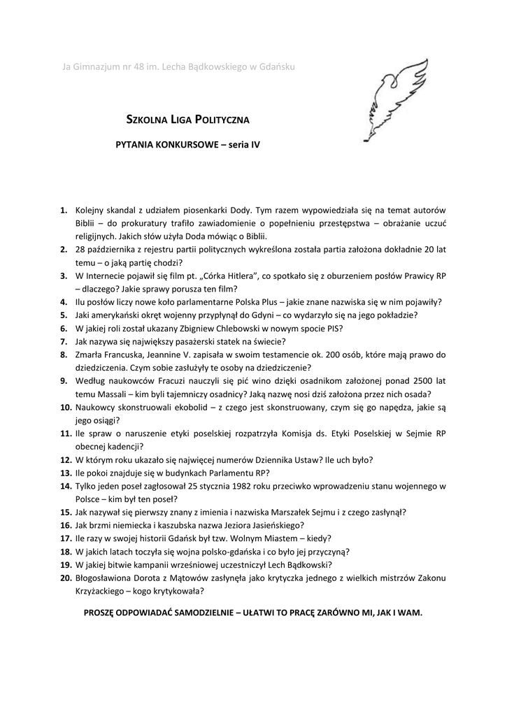 Ja Gimnazjum nr 48 im. Lecha Bądkowskiego w Gdaosku SZKOLNA LIGA POLITYCZNA PYTANIA KONKURSOWE – seria IV 1. Kolejny skandal z udziałem piosenkarki Dody. Tym razem wypowiedziała się na temat autorów Biblii – do prokuratury trafiło zawiadomienie o popełnieniu przestępstwa – obrażanie uczud religijnych. Jakich słów użyła Doda mówiąc o Biblii. 2. 28 października z rejestru partii politycznych wykreślona została partia założona dokładnie 20 lat temu – o jaką partię chodzi? 3. W Internecie pojawił się film pt. „Córka Hitlera”, co spotkało się z oburzeniem posłów Prawicy RP – dlaczego? Jakie sprawy porusza ten film? 4. Ilu posłów liczy nowe koło parlamentarne Polska Plus – jakie znane nazwiska się w nim pojawiły? 5. Jaki amerykaoski okręt wojenny przypłynął do Gdyni – co wydarzyło się na jego pokładzie? 6. W jakiej roli został ukazany Zbigniew Chlebowski w nowym spocie PIS? 7. Jak nazywa się największy pasażerski statek na świecie? 8. Zmarła Francuska, Jeannine V. zapisała w swoim testamencie ok. 200 osób, które mają prawo do dziedziczenia. Czym sobie zasłużyły te osoby na dziedziczenie? 9. Według naukowców Fracuzi nauczyli się pid wino dzięki osadnikom założonej ponad 2500 lat temu Massali – kim byli tajemniczy osadnicy? Jaką nazwę nosi dziś założona przez nich osada? 10. Naukowcy skonstruowali ekobolid – z czego jest skonstruowany, czym się go napędza, jakie są jego osiągi? 11. Ile spraw o naruszenie etyki poselskiej rozpatrzyła Komisja ds. Etyki Poselskiej w Sejmie RP obecnej kadencji? 12. W którym roku ukazało się najwięcej numerów Dziennika Ustaw? Ile uch było? 13. Ile pokoi znajduje się w budynkach Parlamentu RP? 14. Tylko jeden poseł zagłosował 25 stycznia 1982 roku przeciwko wprowadzeniu stanu wojennego w Polsce – kim był ten poseł? 15. Jak nazywał się pierwszy znany z imienia i nazwiska Marszałek Sejmu i z czego zasłynął? 16. Jak brzmi niemiecka i kaszubska nazwa Jeziora Jasieoskiego? 17. Ile razy w swojej historii Gdaosk był tzw. Wolnym Miastem – kiedy? 18. W jakich latach toczyła się wojna polsko-gdaoska i co było jej przyczyną? 19. W jakiej bitwie kampanii wrześniowej uczestniczył Lech Bądkowski? 20. Błogosławiona Dorota z Mątowów zasłynęła jako krytyczka jednego z wielkich mistrzów Zakonu Krzyżackiego – kogo krytykowała? PROSZĘ ODPOWIADAĆ SAMODZIELNIE – UŁATWI TO PRACĘ ZARÓWNO MI, JAK I WAM. Odpowiedzi: 1. Doda stwierdziła, ze autorzy Biblii spisując ją: „byli napruci winem i palili jakieś zioło”. 2. ZChN – Zjednoczenie Chrześcijaosko-Narodowe. 3. Prawica RP zwróciła się do MSZ, żeby zareagowało w związku z tworzonym w Wielkiej Brytanii filmem dokumentalnym „Córka Hitlera”, w którym Radio Maryja jest porównywane do hitleryzmu. Marek Jurek nalega, żeby bronid godności Radia Maryja i o. Rydzyka. 4. Liczy 9 posłów, a wśród nich Kazimierz Ujazdowski, Ludwik Dorn, Jerzy Polaczek i Jan Filip Rybicki. 5. USS Ramage, padły strzały, gdy amerykaoski żołnierz czyścił swój karabin maszynowy. 6. Zbigniew Chlebowski ukazany jest jako automat do gry, jednoręki bandyta. 7. „Oasis of the Seas” 8. Osoby te były przypadkowymi ludźmi (ekspedientki w sklepie, aptekarze, kierowcy autobusów itp. Wszystkich ich łączy fakt, ze kiedyś byli mili dla starszej zmarłej pani. 9. Massalia czyli Marsylia, założyli ją starożytni Grecy ok. 600 r. p. n. e. – mieszkaocy osady rozpoczęli ożywiony handel z sąsiadami, a jednym z powszechnie sprzedawanych towarów stały się amfory z winem. 10. Zbudowany jest z plecionego lnu, żywicy, masy marchewkowej i recyklingowanego włókna węglowego. Napędzany jest biopaliwem z czekolady i tłuszczów zwierzęcych. Osiąga prędkośd ok. 220 km/h, w 2,5 s. rozpędza się do 100 km/h. 11. 36 spraw. 12. 286 numerów w 2004 roku. 13. Łącznie prawie 1400 pomieszczeo. 14. Romuald Bukowski. 15. Mikołaj Sienicki – był marszałkiem kilku kolejnych Sejmów w latach panowania Zygmunta Augusta. Zasłynął mowami sejmowymi, które zyskały mu miano” Demostenesa polskiego”, był gorącym zwolennikiem unii z Litwą, współtwórcą artykułów henrykowskich i Trybunału Koronnego; wyznawał arianizm. 16. Niemiecka: Nenkauer See. Kaszubska: Jezoro Nënkòwsczé. 17. W latach 1807-1812 – stworzone przez Napoleona. W latach 1919-1939 po traktacie wersalskim. 18. W latach 1576-1577 – Gdaosk udzielał poparcia Maksymilianowi II Habsburgowi, który został ogłoszony królem Polski przez Senat – nie uznawał Stefana Batorego ogłoszonego królem przez szlachtę. 19. Bitwa nad Bzurą – napisał później książkę pt. „Żołnierze znad Bzury”. 20. Wielki Mistrz Konrad Wallenrod.