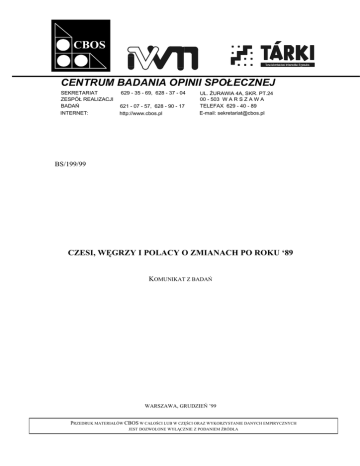 CBOS CENTRUM BADANIA OPINII SPOŁECZNEJ SEKRETARIAT ZESPÓŁ REALIZACJI BADAŃ INTERNET: 629 - 35 - 69, 628 - 37 - 04 621 - 07 - 57, 628 - 90 - 17 http://www.cbos.pl UL. ŻURAWIA 4A, SKR. PT.24 00 - 503 W A R S Z A W A TELEFAX 629 - 40 - 89 E-mail: [email protected] BS/199/99 CZESI, WĘGRZY I POLACY O ZMIANACH PO ROKU ‘89 KOMUNIKAT Z BADAŃ WARSZAWA, GRUDZIEŃ ’99 PRZEDRUK MATERIAŁÓW CBOS W CAŁOŚCI LUB W CZĘŚCI ORAZ WYKORZYSTANIE DANYCH EMPIRYCZNYCH JEST DOZWOLONE WYŁĄCZNIE Z PODANIEM ŹRÓDŁA CZESI, WĘGRZY I POLACY O ZMIANACH PO ROKU ‘89 ♦ Porównując odpowiedzi respondentów czeskich, węgierskich i polskich można stwierdzić, że Węgrzy najbardziej boleśnie odczuwają skutki przemian ostatniego dziesięciolecia, stąd ogólny bilans zmian w ich ocenie jest najmniej korzystny. Spośród trzech analizowanych krajów zdecydowanie najgorzej oceniają zmiany w wymiarze ekonomicznym, najbardziej krytycznie wypowiadają się o zmianach w swojej sytuacji osobistej i swoim życiu, najczęściej spośród wszystkich dostrzegają też pogorszenie sytuacji w sferze bezpieczeństwa. Natomiast lepiej niż Polacy i Czesi wspominają socjalizm. Mimo swego sceptycyzmu Węgrzy jednocześnie najbardziej doceniają zmiany w sferze politycznej, stosunkowo częściej niż pozostali stwierdzając, że możliwości uczestnictwa obywateli w życiu publicznym są większe niż przed rokiem ‘89. ♦ Czesi relatywnie najrzadziej mają negatywne opinie o przemianach w sferze ekonomicznej. Bardziej pozytywnie niż Węgrzy i Polacy wyrażają się o zmianach w materialnych warunkach życia, stosunkowo lepiej też oceniają sytuację na rynku pracy. Najbardziej doceniają możliwość swobodnego podróżowania. Wyróżniają się pozytywnymi ocenami swojej osobistej pomyślności i w sumie jako jedyni nieco częściej wyrażają zadowolenie niż niezadowolenie ze zmian w życiu, które zaszły w minionym dziesięcioleciu. ♦ Opinie Polaków są mniej jednoznaczne niż Czechów i Węgrów. Polacy najczęściej uważają, że warto było podjąć wysiłek przebudowy ustroju, jednocześnie najbardziej doceniają zmiany w zakresie swobód obywatelskich, w tym szczególnie możliwość otwartego wyrażania swoich opinii. Jednak niemal połowa Polaków stwierdza pogorszenie swojej sytuacji materialnej, a prawie trzy czwarte - pogorszenie się możliwości znalezienia pracy. W sumie wśród polskich respondentów przeważają ci, którzy sądzą, że ich obecne życie wygląda gorzej niż dziesięć lat temu. Badanie „Aktualne problemy i wydarzenia” (113), 5-11 października ‘99, reprezentatywna próba losowo-adresowa dorosłej ludności Polski (N=1111). Badanie w Czechach przeprowadzono w dniach 4-11 października ‘99 na próbie liczącej 1018 osób oraz 1-8 listopada ‘99 na próbie 1093-osobowej; na Węgrzech badanie zrealizowano w dniach 8-18 października ‘99 na próbie liczącej 1523 osoby. W listopadzie minęła dziesiąta rocznica obalenia muru berlińskiego, wydarzenia, które świat przyjął za symboliczny początek ostatecznego upadku tzw. realnego socjalizmu i zmian sytuacji geopolitycznej w naszym rejonie Europy. W Czechach uroczyście obchodzono rocznicę wielotysięcznej domonstracji w Pradze, której następstwem było ustąpienie komunistycznego rządu. Jak z historycznej perspektywy oceniamy sens zapoczątkowanych wówczas przemian? Czy nasze opinie różnią się od ocen sąsiadów, którzy przeszli tę samą drogę od realnego socjalizmu do gospodarki rynkowej? Próbę odpowiedzi na te pytania przynosi sondaż CBOS1 oraz badania przeprowadzone na Węgrzech (TÁRKI) i w Czechach (IVVM)2. OCENY USTROJU SOCJALISTYCZNEGO Z PERSPEKTYWY DZIESIĘCIOLECIA Retrospektywna ocena ustroju socjalistycznego nie jest wśród Polaków jednoznaczna. Blisko jedna trzecia ankietowanych negatywnie ocenia skutki funkcjonowania socjalizmu w naszym kraju, jednak tylko nieco mniejsza grupa (jedna czwarta) podziela pogląd przeciwny i sądzi, że większości ludzi w Polsce socjalizm przyniósł przede wszystkim korzyści. Obecne oceny ustroju socjalistycznego są nieco bardziej negatywne niż na początku tego roku i dwa lata temu, natomiast zbliżone do opinii z lat ‘96 i ‘97. 1 Badanie „Aktualne problemy i wydarzenia” (113), 5-11 października ‘99, reprezentatywna próba losowo-adresowa dorosłej ludności Polski (N=1111). 2 Badanie w Czechach przeprowadzono w dniach 4-11 października ‘99 na próbie liczącej 1018 osób oraz 1-8 listopada ‘99 na próbie 1093-osobowej; na Węgrzech badanie zrealizowano w dniach 8-18 października ‘99 na próbie liczącej 1523 osoby. -2Tabela 1 Jak Pan(i) ocenia, czy ustrój socjalistyczny przyniósł większości ludzi w Polsce więcej korzyści czy strat? Wskazania respondentów według terminów badań X ’94 IX ’96 VII ‘97 V ’98 IV ’99 X ’99 w procentach Więcej korzyści niż strat 28 25 24 30 28 25 Tyle samo strat, co korzyści 33 28 28 28 30 30 Więcej strat niż korzyści 27 34 32 32 29 31 12 13 16 10 13 14 Trudno powiedzieć Korzystne strony ustroju socjalistycznego pamięta więcej osób zamieszkałych na wsi (31%) lub w małych miejscowościach (29%) niż spośród mieszkańców największych aglomeracji (11%). Opinie o ustroju socjalistycznym są tym gorsze, im lepiej ankietowani są wykształceni; wśród osób z wyższym wykształceniem ponad połowa uznaje, że ustrój socjalistyczny przyniósł ludziom więcej strat niż korzyści. Oceny socjalizmu są także wyraźnie związane z obecnym statusem materialnym badanych. Skutki funkcjonowania ustroju socjalistycznego niekorzystnie oceniają uzyskujący najwyższe dochody na osobę w rodzinie, natomiast cieplej o tym modelu ustrojowym myślą respondenci deklarujący dochody poniżej średnich. Można zatem powiedzieć, że oceny socjalizmu są dokonywane w dużej mierze przez pryzmat obecnej sytuacji ankietowanych, a teraźniejszość w większym lub mniejszym stopni