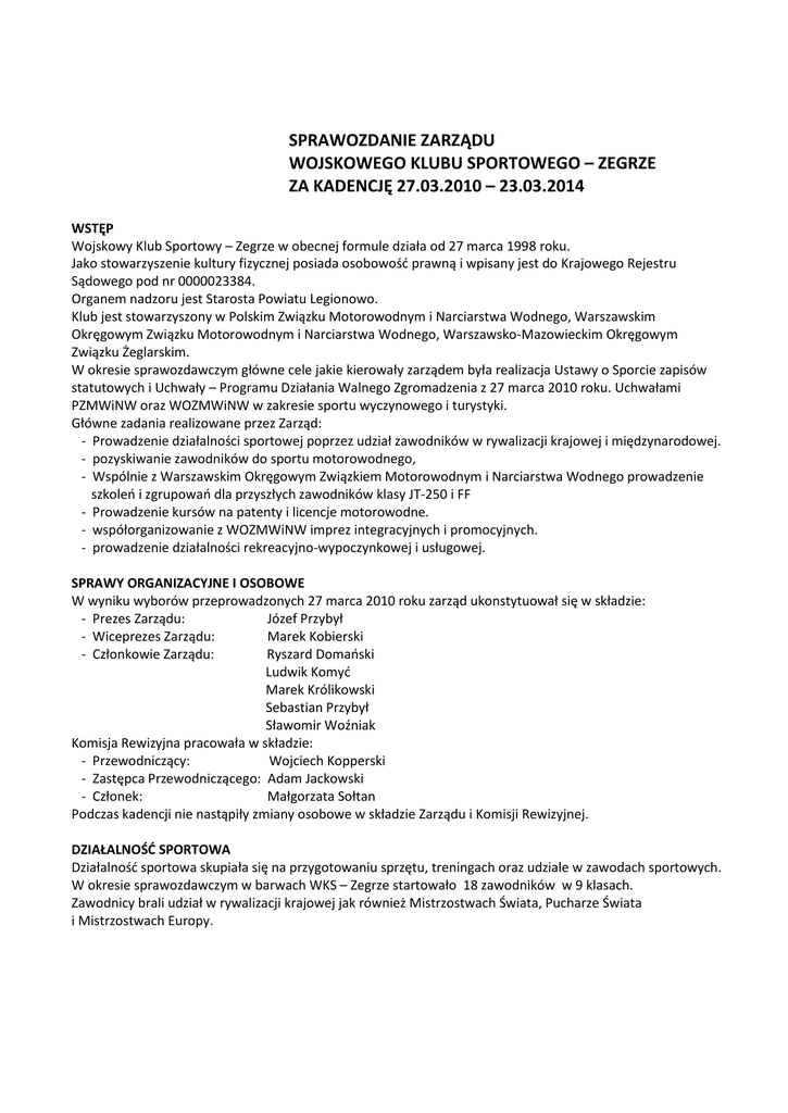 SPRAWOZDANIE ZARZĄDU WOJSKOWEGO KLUBU SPORTOWEGO – ZEGRZE ZA KADENCJĘ 27.03.2010 – 23.03.2014 WSTĘP Wojskowy Klub Sportowy – Zegrze w obecnej formule działa od 27 marca 1998 roku. Jako stowarzyszenie kultury fizycznej posiada osobowość prawną i wpisany jest do Krajowego Rejestru Sądowego pod nr 0000023384. Organem nadzoru jest Starosta Powiatu Legionowo. Klub jest stowarzyszony w Polskim Związku Motorowodnym i Narciarstwa Wodnego, Warszawskim Okręgowym Związku Motorowodnym i Narciarstwa Wodnego, Warszawsko-Mazowieckim Okręgowym Związku Żeglarskim. W okresie sprawozdawczym główne cele jakie kierowały zarządem była realizacja Ustawy o Sporcie zapisów statutowych i Uchwały – Programu Działania Walnego Zgromadzenia z 27 marca 2010 roku. Uchwałami PZMWiNW oraz WOZMWiNW w zakresie sportu wyczynowego i turystyki. Główne zadania realizowane przez Zarząd: - Prowadzenie działalności sportowej poprzez udział zawodników w rywalizacji krajowej i międzynarodowej. - pozyskiwanie zawodników do sportu motorowodnego, - Wspólnie z Warszawskim Okręgowym Związkiem Motorowodnym i Narciarstwa Wodnego prowadzenie szkoleń i zgrupowań dla przyszłych zawodników klasy JT-250 i FF - Prowadzenie kursów na patenty i licencje motorowodne. - współorganizowanie z WOZMWiNW imprez integracyjnych i promocyjnych. - prowadzenie działalności rekreacyjno-wypoczynkowej i usługowej. SPRAWY ORGANIZACYJNE I OSOBOWE W wyniku wyborów przeprowadzonych 27 marca 2010 roku zarząd ukonstytuował się w składzie: - Prezes Zarządu: Józef Przybył - Wiceprezes Zarządu: Marek Kobierski - Członkowie Zarządu: Ryszard Domański Ludwik Komyć Marek Królikowski Sebastian Przybył Sławomir Woźniak Komisja Rewizyjna pracowała w składzie: - Przewodniczący: Wojciech Kopperski - Zastępca Przewodniczącego: Adam Jackowski - Członek: Małgorzata Sołtan Podczas kadencji nie nastąpiły zmiany osobowe w składzie Zarządu i Komisji Rewizyjnej. DZIAŁALNOŚĆ SPORTOWA Działalność sportowa skupiała się na przygotowaniu sprzętu, treningach oraz udziale w zawodach sportowych. W okresie sprawozdawczym w barwach WKS – Zegrze startowało 18 zawodników w 9 klasach. Zawodnicy brali udział w rywalizacji krajowej jak również Mistrzostwach Świata, Pucharze Świata i Mistrzostwach Europy. Udział zawodników WKS – Zegrze w Mistrzostwach Świata i zajęte miejsca w poszczególnych latach: Imię i nazwisko klasa 2010 r. Ada Przybył F-4S II Daria Przybył F-4S Łukasz Ciołek Agata Sołtan 2011 r. 2012 2013 XII VIII VIII X XIV XX --- S-550 IV V --- --- T-400 XI --- --- --- GT-30 --- --- --- XIII Krzysztof Bartnicki F-500 --- --- XIII --- Jakub Komaszewski FF kl. III --- --- I --- Antoni Siwek FF kl. I II --- Udział zawodników WKS – Zegrze w Mistrzostwach Europy i zajęte miejsca w poszczególnych latach Imię i nazwisko klasa Maciej Wojewódzki OSY-400 Agata Sołtan 2010 r. 2011 r. 2012 r. 2013 r. XI --- --- X T-400 IX V II --- G-30 --- XII --- XI Ada Przybył F-4S VI VI Daria Przybył F-4S IX XVI --- --- Łukasz Ciołek S-550 --- VII III III T-550 --- --- VIII --- GT-30 --- --- Krzysztof Bartnicki O-700 --- --- Filip Wiertlewski JT-250 --- --- --- VII Sebastian Sojka JT-250 --- --- --- X Kamil Czernecki JT-250 --- --- --- XII Mateusza Wojewódzki GT-30 --- --- --- XII Udział zawodników WKS-Zegrze w zawodach o Puchar Świata i uzyskane wyniki Sebastian Sojka Klasa JT-250 XIII miejsce/2013 r. Udział zawodników w niemieckiej formule ADAC: Ada Przybył Daria Przybył Klasa F-4S Klasa F-4S IV miejsce/2010 r. VIII miejsce/1010 r. IV --VI VII VI --- Udział zawodników WKS – Zegrze Mistrzostwach Polski i uzyskane wyniki Imię i nazwisko klasa 2011 r. 2012 r. 2013 r. Łukasz Ciołek T-550 V --- --- --- S-550 --- I II I GT-30 --- --- VIII VII Piotr Kowalski JT-250 VI --- --- --- Agata Sołtan T-400 I VI VI --- GT-30 --- --- --- OSY-400 IV --- II II O-125 --- IV --- --- F-4S --- --- --- III Sebastian Sojka JT-250 --- I II II Mateusz Dankowski JT-250 --- II --- --- Cezary Sopiński JT-250 --- IV --- --- Mateusz Popończyk JT-250 --- V --- --- Paweł Szczepański T-400 --- II --- --- Adrian Wincenciak T-400 --- VII --- --- Cezary Tomankiewicz T-400 --- VIII --- --- Kamil Czernecki JT-250 --- --- VII XIII Mateusz Wojewódzki T-400 --- --- IX GT-30 --- --- --- VI Ada Przybył F-4S --- --- III II Daria Przybył F-4S --- --- IV V Filip Wiertlewski JT-250 --- --- --- XI Maciej Wojewódzki 2010 r. IV Drużynowa klasyfikacja Mistrzostw Polski w wyścigach po obwodzie: WKS - Zegrze 1 miejsce/ 2010r. 1 miejsce/ 2011 r. 1 miejsce / 2012 r. 1 miejsce /2013 r. Udział zawodników WKS – Zegrze i wyniki uzyskane wyniki w Mistrzostwach Warszawy Imię i nazwisko klasa 2010 r. 2011 r. 2012 r. 2013 r. Marek Borek JT-250 VIII --- --- --- Agata Sołtan T-400 I --- --- --- Maciej Wojewódzki T-400 III --- --- --- Łukasz Ciołek T-400 VI --- --- --- Janusz Missol T-1000 --- --- --- II Filip Wiertlewski JT-250 --- --- --- II Marta Bonder FF/1 --- --- --- I Wiktoria Misiak FF/1 --- --- --- II Jakub Skrzypek FF/1 --- --- --- III Sylwia Nowak FF/1 --- --- --- IV Patryk Bonder FF/3 --- --- --- I Hubert Komaszewski FF/3 --- --- --- II Mateusz Misiak FF/3 --- --- --- III Klasyfikacja drużynowa WKS – Zegrze w Mistrzostwach Warszawy: 3 miejsce/1010 r. 2 miejsce /2013 r. DZIAŁALNOŚĆ SZKOLENIOWA: W oparciu o infrastrukturę klubu oraz Ośrodka Szkolenia Wojskowego WAT wspólnie z Warszawskim Okręgowym Związkiem Motorowodnym i Narciarstwa Wodnego corocznie organizujemy zgrupowania szkoleniowo-treningowe przyszłych zawodników do klas JT-250 i FF zakończone egzaminem umożliwiającym uzyskanie licencji sportowej. Od kwietnia do września prowadzone są treningi zawodników na wodzie. Każdego roku na przełomie marca /kwietnia do października organizowaliśmy kursy na patenty motorowodne i licencje na holowanie narciarza. Przeprowadzone kursy w latach 2010 – 2013 Rok Sternik St. Sternik Hol. Narciarza Razem